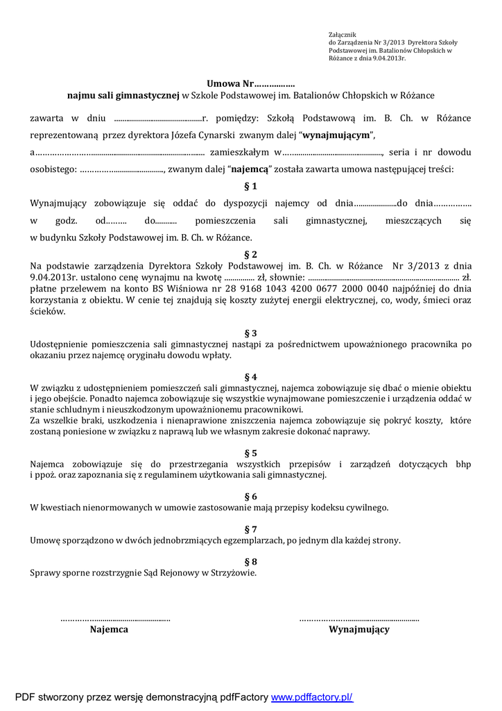 Załącznik do Zarządzenia Nr 3/2013 Dyrektora Szkoły Podstawowej im. Batalionów Chłopskich w Różance z dnia 9.04.2013r. Umowa Nr………....…. najmu sali gimnastycznej w Szkole Podstawowej im. Batalionów Chłopskich w Różance zawarta w dniu ............................................r. pomiędzy: Szkołą Podstawową im. B. Ch. w Różance reprezentowaną przez dyrektora Józefa Cynarski zwanym dalej “wynajmującym”, a……………………........................................................ zamieszkałym w……..........................................., seria i nr dowodu osobistego: ……………........................, zwanym dalej “najemcą” została zawarta umowa następującej treści: §1 Wynajmujący zobowiązuje się oddać do dyspozycji najemcy od dnia…..................do dnia……………. w godz. od..……. do........... pomieszczenia sali gimnastycznej, mieszczących się w budynku Szkoły Podstawowej im. B. Ch. w Różance. §2 Na podstawie zarządzenia Dyrektora Szkoły Podstawowej im. B. Ch. w Różance Nr 3/2013 z dnia 9.04.2013r. ustalono cenę wynajmu na kwotę ............... zł, słownie: ............................................................................ zł. płatne przelewem na konto BS Wiśniowa nr 28 9168 1043 4200 0677 2000 0040 najpóźniej do dnia korzystania z obiektu. W cenie tej znajdują się koszty zużytej energii elektrycznej, co, wody, śmieci oraz ścieków. §3 Udostępnienie pomieszczenia sali gimnastycznej nastąpi za pośrednictwem upoważnionego pracownika po okazaniu przez najemcę oryginału dowodu wpłaty. §4 W związku z udostępnieniem pomieszczeń sali gimnastycznej, najemca zobowiązuje się dbać o mienie obiektu i jego obejście. Ponadto najemca zobowiązuje się wszystkie wynajmowane pomieszczenie i urządzenia oddać w stanie schludnym i nieuszkodzonym upoważnionemu pracownikowi. Za wszelkie braki, uszkodzenia i nienaprawione zniszczenia najemca zobowiązuje się pokryć koszty, które zostaną poniesione w związku z naprawą lub we własnym zakresie dokonać naprawy. §5 Najemca zobowiązuje się do przestrzegania wszystkich przepisów i zarządzeń dotyczących bhp i ppoż. oraz zapoznania się z regulaminem użytkowania sali gimnastycznej. §6 W kwestiach nienormowanych w umowie zastosowanie mają przepisy kodeksu cywilnego. §7 Umowę sporządzono w dwóch jednobrzmiących egzemplarzach, po jednym dla każdej strony. §8 Sprawy sporne rozstrzygnie Sąd Rejonowy w Strzyżowie. ……………..................................... Najemca …………………................................... Wynajmujący PDF stworzony przez wersję demonstracyjną pdfFactory www.pdffactory.pl/