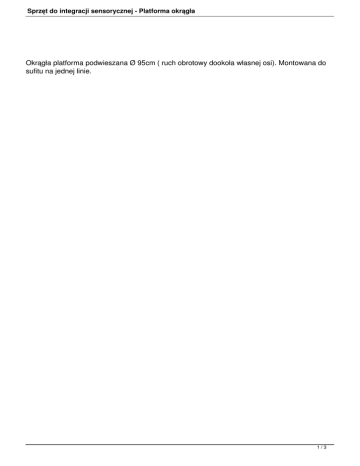 Sprzęt do integracji sensorycznej - Platforma okrągła Okrągła platforma podwieszana Ø 95cm ( ruch obrotowy dookoła własnej osi). Montowana do sufitu na jednej linie. 1/3 Sprzęt do integracji sensorycznej - Platforma okrągła 2/3 Sprzęt do integracji sensorycznej - Platforma okrągła 3/3