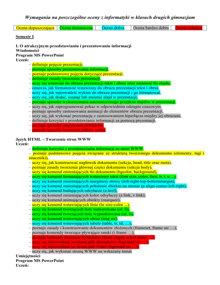 Wymagania na poszczególne oceny z informatyki w klasach drugich gimnazjum Ocena dopuszczająca Ocena dostateczna Ocena dobra Ocena bardzo dobra Ocena celująca Semestr I I. O atrakcyjnym przedstawianiu i prezentowaniu informacji Wiadomości Program MS PowerPoint Uczeń: – definiuje pojęcie prezentacji, – poznaje sposoby prezentowania informacji, – poznaje podstawowe pojęcia dotyczące prezentacji, – definiuje zasady tworzenia prezentacji, – uczy się wstawiać do obrazu prezentacji tekst i obraz oraz zmieniać tło slajdu, – omawia, jak formatować wstawiony do obrazu prezentacji tekst i obraz, – uczy się, jak wprowadzić wykres do obrazu prezentacji i go formatować, – uczy się, jak dodać, usunąć lub zmienić slajd w prezentacji, – poznaje sposoby wykorzystania automatycznego przejścia slajdów w prezentacji, – uczy się, jak zaprogramować pokaz w odpowiednim odstępie czasowym, – poznaje sposoby zastosowania animacji do elementów obrazu prezentacji, – uczy się, jak wykonać prezentację z zastosowaniem hiperłącza między jej obrazami, – definiuje korzyści z przedstawiania informacji za pomocą prezentacji, – poznaje sposoby nagrywania dźwięków, – poznaje sposoby tworzenia plików wideo. Język HTML – Tworzenie stron WWW Uczeń: – definiuje korzyści z przedstawiania informacji ze stron WWW, – poznaje podstawowe pojęcia związane ze strukturą tworzonego dokumentu (elementy, tagi i znaczniki), – uczy się, jak konstruować nagłówek dokumentu (sekcja, head, title oraz meta), – poznaje zasady tworzenia głównej części dokumentu (sekcja body), – uczy się komend zmieniających tło dokumentu (bgcolor, background), – uczy się komend formatujących wstawiony tekst (font size, color, face, b, i, u ...), – uczy się komend zmieniających marginesy strony (left-right-top-bottommargin), – uczy się komend zmieniających połoŜenie obiektu na stronie (p align-center-left-right), – uczy się komend budujących odsyłacze (a href), – uczy się komend zmieniających kolor odsyłaczy (a link, v link), – uczy się komend animujących obiekty (marquee), – uczy się komend wstawiających linie (hr size-color ...), – uczy się komend tworzących listy numerowane (ol, li), – uczy się komend tworzących listy wypunktowane (ul, li), – uczy się komend wstawiających obraz (img src), – uczy się komend wstawiających tabele (table, tr, td, …), – poznaje zasady i konstruowanie dokumentów złoŜonych (frameset, frame src …), – poznaje komendy tworzące pływające ramki (i frame …), – poznaje komendy tworzące formularze (form, input, select name …), – uczy się wprowadzać na stronę plik dźwiękowy (bgsound src …), – uczy się wprowadzać na stronę plik wideo (bgsound src …), – uczy się, jak wykonać stronę WWW na wskazany temat. Umiejętności Program MS PowerPoint Uczeń: – określa pojęcia dotyczące prezentacji, – zna zasady tworzenia prezentacji i potrafi je zastosować, – potrafi dokonać wyboru obrazu prezentacji, – umie wstawić do obrazu prezentacji tekst i obraz oraz zmienić tło slajdu, – potrafi formatować wstawiony do obrazu prezentacji tekst i obraz, – potrafi wprowadzić wykres do obrazu prezentacji i jak go formatować, – potrafi dodać, usunąć lub zmienić slajd, – umie zastosować automatyczne przejścia slajdów w prezentacji, – potrafi zaprogramować pokaz w odpowiednim odstępie czasowym, – potrafi zanimować poszczególne elementy slajdu, – potrafi wykonać prezentację z wykorzystaniem hiperłącza między poszczególnymi jej obrazami, – umie zapisać swoją pracę jako plik typu prezentacja oraz pokaz programu, – projektuje i wykonuje prezentacje multimedialną na zadany temat, – potrafi zaprezentować prezentacje na forum, – potrafi nagrać, odtworzyć i modyfikować dźwięk, – potrafi wprowadzić do systemu plik wideo i wstępnie go obrobić. Język HTML – Tworzenie stron WWW Uczeń: – określa korzyści z przedstawiania informacji za stron WWW, – określa pojęcia związane ze strukturą tworzonego dokumentu (elementy, tagi i znaczniki), – potrafi konstruować nagłówek dokumentu (sekcja, head, title oraz meta), – określa zasady tworzenia głównej części dokumentu (sekcja body), – potrafi zmienić tło dokumentu (bgcolor, background), – potrafi wstawić i formatować tekst (font size, color, face, b, i, u …), – potrafi zmienić marginesy strony (left-right-top-bottommargin), – potrafi zmienić połoŜenie obiektu na stronie (p align-center-left-right), – potrafi zbudować odsyłacze (a href …), – umie zmienić kolor odsyłaczy (a link, v link ….), – umie animować obiekty (marquee …), – potrafi wstawić i formatować linie (hr size-color ……), – potrafi wstawić i formatować listy numerowane (ol, li), – potrafi wstawić i formatować listy wypunktowane (ul, li), – potrafi wstawić i formatować obraz (img src), – potrafi wstawić i formatować tabele (table, tr, td, …), – potrafi konstruować dokumenty złoŜone (frameset, frame src …), – potrafi stworzyć pływające ramki (i frame …), – potrafi budować formularze (form, input, select name …), – potrafi wstawić na stronę plik dźwiękowy (bgsound src …), – potrafi wstawić na stronę plik wideo (bgsound src …), – projektuje stronę WWW na wskazany temat. IX. O tworzeniu i obróbce plików multimedialnych Wiadomości Program GIMP Uczeń: – poznaje interfejs programu, – uczy się wykorzystywać podstawowe moŜliwości programu, – poznaje działanie podstawowych narzędzi oferowanych w przyborniku, – poznaje sposoby skalowania rysunków, – uczy się, jak kadrować i zmieniać wymiary obrazu, – uczy się zamienić obrazy czarno-białe na jednobarwne, – poznaje sposób wprowadzenie efektu cienia, – poznaje moŜliwości stosowania filtrów i skryptów, – poznaje moŜliwości przetwarzani