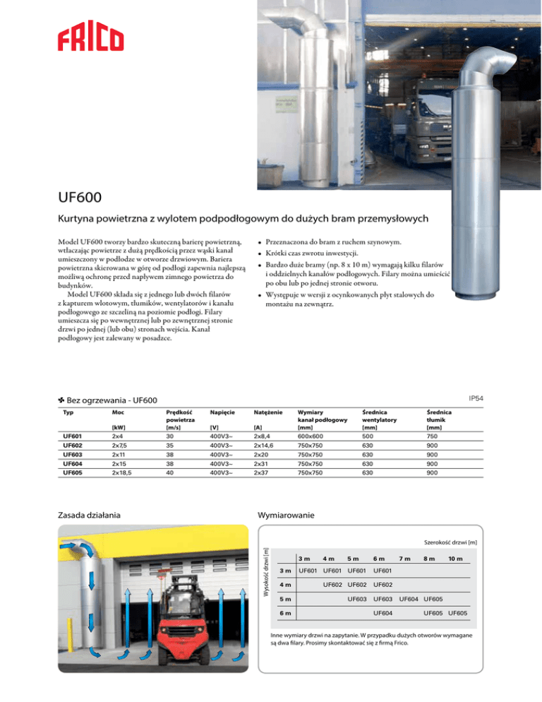 Kurtyny powietrzne UF600 Kurtyna powietrzna z wylotem podpodłogowym do dużych bram przemysłowych Model UF600 tworzy bardzo skuteczną barierę powietrzną, wtłaczając powietrze z dużą prędkością przez wąski kanał umieszczony w podłodze w otworze drzwiowym. Bariera powietrzna skierowana w górę od podłogi zapewnia najlepszą możliwą ochronę przed napływem zimnego powietrza do budynków. Model UF600 składa się z jednego lub dwóch filarów z kapturem wlotowym, tłumików, wentylatorów i kanału podłogowego ze szczeliną na poziomie podłogi. Filary umieszcza się po wewnętrznej lub po zewnętrznej stronie drzwi po jednej (lub obu) stronach wejścia. Kanał podłogowy jest zalewany w posadzce. • Przeznaczona do bram z ruchem szynowym. • Krótki czas zwrotu inwestycji. • Bardzo duże bramy (np. 8 x 10 m) wymagają kilku filarów i oddzielnych kanałów podłogowych. Filary można umieścić po obu lub po jednej stronie otworu. • Występuje w wersji z ocynkowanych płyt stalowych do montażu na zewnątrz. IP54 1 Bez ogrzewania - UF600 Typ Moc UF601 UF602 Napięcie [kW] Prędkość powietrza [m/s] [V] [A] 2x4 30 400V3~ 2x8,4 600x600 500 750 2x7,5 35 400V3~ 2x14,6 750x750 630 900 Natężenie Wymiary kanał podłogowy [mm] Średnica wentylatory [mm] Średnica tłumik [mm] UF603 2x11 38 400V3~ 2x20 750x750 630 900 UF604 2x15 38 400V3~ 2x31 750x750 630 900 UF605 2x18,5 40 400V3~ 2x37 750x750 630 900 Wymiarowanie Szerokość drzwi [m] Wysokość drzwi [m] Zasada działania 3m 4m 5m 6m 3m UF601 UF601 UF601 UF601 4m UF602 UF602 UF602 5m UF603 UF603 6m UF604 7m 8m 10 m UF604 UF605 UF605 UF605 Inne wymiary drzwi na zapytanie. W przypadku dużych otworów wymagane są dwa filary. Prosimy skontaktować się z firmą Frico. Wymiary Montaż w pomieszczeniu 1. 1. ø750/900 915/1050 500/630 Montaż na zewnątrz 500/630 1. Czerpnia z kratką zabezpieczającą przed ptakami oraz odpowiednią dyszą wlotową do montażu w pomieszczeniu 2. Tłumik wlotowy boczny L = 1 500 mm 3. Wentylator osiowy 400 V 4. Wentylator osiowy 400 V 2. 5. Tłumik silnika 1480 750/900 6. Tłumik po stronie ciśnienia L = 1 000 mm 3. 4. 500/630 500/630 7. Kanał podłogowy Właz rewizyjny Skrzynka kanału podłogowego 250 Skrzynka rozdzielcza 7. 600/750 150 6. 1000 5. A-A Sterowanie i akcesoria UFC, zestaw rozruchowy Rozruch Y/D z opóźnieniem czasowym między silnikami. Możliwość uruchamiania za pomocą czujnika drzwiowego lub wyłącznika krańcowego. Zintegrowane zabezpieczenie silnika dla każdego wentylatora. AGB304, czujnik krańcowy Uruchamia kurtynę powietrzną, kiedy drzwi zostaną otwarte i wyłącza ją, kiedy drzwi zostaną zamknięte. Styk przemienny 4 A, 230 V~. IP44. UFC600 AGB304 UFEH UFMS UFEH, przedłużenie kolumny W przypadku montażu w pomieszczeniu, wlot powietrza powinien znajdować się nad otworem drzwiowym, co wymaga niekiedy przedłużenia kolumny. Montuje się je między okapem wlotowym i górną izolacją akustyczną. UFMS, tłumik silnika Instalowany w kolumnie dodatkowy tłumik silnika ogranicza hałas. UFS, uchwyt zabezpieczający Uchwyt zabezpieczający zakłada się wokół górnego tłumika i mocuje do ściany zewnętrznej, aby zapobiec przewróceniu się kolumny. Typ Opis UFC601 Zestaw rozruchowy UF601, 600x600x200mm UFC602 Zestaw rozruchowy UF602, 600x600x200mm UFC603 Zestaw rozruchowy UF603, 600x600x200mm UFC604 Zestaw rozruchowy UF604, 600x600x200mm UFC605 Zestaw rozruchowy UF605, 800x600x250mm AGB304 Czujnik krańcowy, IP44 UFEH05 Przedłużenie kolumny, 500 mm, Ø500 mm UFEH10 Przedłużenie kolumny, 1000 mm, Ø630 mm UFEH15 Przedłużenie kolumny, 1500 mm, Ø630 mm UFEH20 Przedłużenie kolumny, 2000 mm, Ø630 mm UFMS750 Tłumik silnika, Ø750 mm UFMS900 Tłumik silnika, Ø900 mm UFS750 Uchwyt zabezpieczający, Ø750 mm UFS900 Uchwyt zabezpieczający, Ø900 mm UFS Kurtyny powietrzne Przemysł