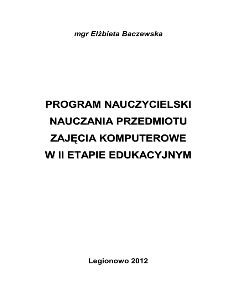 mgr Elżbieta Baczewska PROGRAM NAUCZYCIELSKI NAUCZANIA PRZEDMIOTU ZAJĘCIA KOMPUTEROWE W II ETAPIE EDUKACYJNYM Legionowo 2012 mgr Elżbieta Baczewska – program nauczycielski nauczania przedmiotu zajęcia komputerowe w II etapie edukacyjnym SPIS TREŚCI 1 Wprowadzenie..................................................................................... 3 2 Oprogramowanie i środki techniczne.................................................. 8 3 Ogólne cele edukacyjne i wychowawcze............................................ 9 4 Treści programowe.............................................................................. 10 4.1 Treści kształcenia…………………………………………………….. 10 4.2 Szczegółowe cele kształcenia………………………………………. 12 5 Rozplanowanie treści nauczania......................................................... 17 6 Sposoby osiągania celów kształcenia i wychowywania…................... 19 7 Pomiar osiągnięć i umiejętności.......................................................... 21 8 Kryteria i forma oceny…………………………..................................... 22 8.1 Wymagania programowe dla każdego modułu........................... 23 8.2 Sposoby sprawdzania i oceniania umiejętności uczniów............ 25 8.3 Opis wymagań, jakie uczeń musi spełnić, aby otrzymać ocenę.. 26 8.4 W jaki sposób uczeń może poprawić ocenę……………………… 27 9 Regulamin pracowni komputerowej……………………………….......... 28 2 mgr Elżbieta Baczewska – program nauczycielski nauczania przedmiotu zajęcia komputerowe w II etapie edukacyjnym 1. Wprowadzenie Rozwój technologii informacyjnej i jej przydatność w funkcjonowaniu wszystkich urzędów i instytucji oraz życiu społecznym i prywatnym powoduje, że zajmuje ona obecnie ważne miejsce również w edukacji szkolnej. Jej nieustanny rozwój stawia współczesnego ucznia przed koniecznością poznania podstaw obsługi komputera oraz podstawowego oprogramowania. Wnikliwe analizy wyników badań edukacyjnych utwierdzają twórców reformy edukacji w tym, aby we wszechstronnym rozwoju ucznia, wyposażaniu go w rzetelną wiedzę, mieć szczególnie na uwadze rozwijanie zdolności rozumowania myślenia analitycznego i syntetycznego. Program nauczania zajęć komputerowych na II etapie nauczania w szkole podstawowej ma na celu wyposażenie uczniów w podstawowe umiejętności i nabycie kompetencji w dziedzinie obsługi i zastosowania komputerów, technologii informacyjnej i urządzeń opartych na technice komputerowej, stosowania różnego rodzaju programów użytkowych i edukacyjnych, korzystania z dostępnych źródeł informacji. Uczniowie powinni być przygotowani do rozwiązywania prostych problemów przez zastosowanie podstawowych metod algorytmicznych. Kształcenie myślenia algorytmicznego powinno występować od początku edukacji informatycznej. Sprzęt i programy komputerowe szybko tracą aktualność, dlatego uczniowie powinni nie tylko zapoznać się z obsługą komputera i aktualnie dostępnych programów, lecz również od najmłodszych lat tworzyć proste algorytmy, procedury i programy. Podstawa programowa przedmiotu Zajęcia Komputerowe Podstawa programowa została opublikowana w Rozporządzeniu Ministra Edukacji Narodowej z dnia 23 grudnia 2008 roku w sprawie podstawy programowej wychowania przedszkolnego w poszczególnych typach szkół. 3 oraz kształcenia ogólnego mgr Elżbieta Baczewska – program nauczycielski nauczania przedmiotu zajęcia komputerowe w II etapie edukacyjnym Treść podstawy programowej SZKOŁY PODSTAWOWEJ Kształcenie ogólne w szkole podstawowej tworzy fundament wykształcenia – szkoła łagodnie wprowadza uczniów w świat wiedzy, dbając o ich harmonijny rozwój intelektualny, etyczny, emocjonalny, społeczny i fizyczny. Kształcenie to dzieli się na dwa etapy edukacyjne: 1) I etap edukacyjny, obejmujący klasy I-III szkoły podstawowej – edukacja wczesnoszkolna; 2) II etap edukacyjny, obejmujący klasy IV-VI szkoły podstawowej. Celem kształcenia ogólnego w szkole podstawowej jest: 1) przyswojenie przez uczniów podstawowego zasobu wiadomości na temat faktów, zasad, teorii i praktyki, dotyczących przede wszystkim tematów i zjawisk bliskich doświadczeniom uczniów; 2) zdobycie przez uczniów umiejętności wykorzystywania posiadanych wiadomości podczas wykonywania zadań i rozwiązywania problemów; 3) kształtowanie u uczniów postaw warunkujących sprawne i odpowiedzialne funkcjonowanie we współczesnym świecie. Do najważniejszych umiejętności zdobywanych przez ucznia w trakcie kształcenia ogólnego w szkole podstawowej należą: 1) czytanie – rozumiane zarówno jako prosta czynność, jako umiejętność rozumienia, wykorzystywania i przetwarzania tekstów w zakresie umożliwiającym zdobywanie wiedzy, rozwój emocjonalny, intelektualny i moralny oraz uczestnictwo w życiu społeczeństwa; 2) myślenie matematyczne – umiejętność korzystania z podstawowych narzędzi matematyki w życiu codziennym oraz prowadzenia elementarnych rozumowań matematycznych; 3) myślenie naukowe – umiejętność formułowania wniosków opartych na obserwacjach empirycznych dotyczących przyrody i społeczeństwa; 4) umiejętność komunikowania się w języku ojczystym i w języku obcym, zarówno w mowie, jak i w piśmie; 5) umiejętność posługiwania się nowoczesnymi technologiami informacyjnokomunikacyjnymi, w tym także dla wyszukiwania i korzystania z informacji; 6) umiejętność uczenia się jako sposób zaspokajania naturalnej ciekawości świata, odkrywania swoich zainteresowań i przygotowania do dalszej edukacji; 7) umiejętność pracy zespołowej. Jednym z najważniejszych zadań szkoły podstawowej jest kształcenie umiejętności posługiwania się językiem polskim, w tym dbałość o wzbogacanie zasobu słownictwa uczniów. Wypełnianie tego zadania 