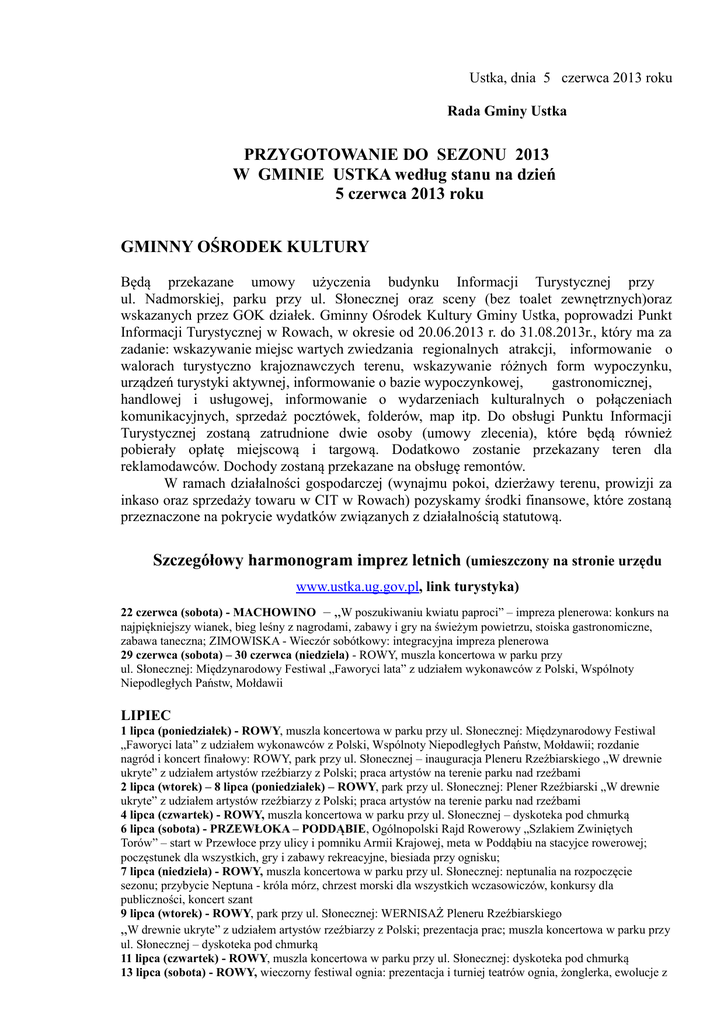 Ustka, dnia 5 czerwca 2013 roku Rada Gminy Ustka PRZYGOTOWANIE DO SEZONU 2013 W GMINIE USTKA według stanu na dzień 5 czerwca 2013 roku GMINNY OŚRODEK KULTURY Będą przekazane umowy użyczenia budynku Informacji Turystycznej przy ul. Nadmorskiej, parku przy ul. Słonecznej oraz sceny (bez toalet zewnętrznych)oraz wskazanych przez GOK działek. Gminny Ośrodek Kultury Gminy Ustka, poprowadzi Punkt Informacji Turystycznej w Rowach, w okresie od 20.06.2013 r. do 31.08.2013r., który ma za zadanie: wskazywanie miejsc wartych zwiedzania regionalnych atrakcji, informowanie o walorach turystyczno krajoznawczych terenu, wskazywanie różnych form wypoczynku, urządzeń turystyki aktywnej, informowanie o bazie wypoczynkowej, gastronomicznej, handlowej i usługowej, informowanie o wydarzeniach kulturalnych o połączeniach komunikacyjnych, sprzedaż pocztówek, folderów, map itp. Do obsługi Punktu Informacji Turystycznej zostaną zatrudnione dwie osoby (umowy zlecenia), które będą również pobierały opłatę miejscową i targową. Dodatkowo zostanie przekazany teren dla reklamodawców. Dochody zostaną przekazane na obsługę remontów. W ramach działalności gospodarczej (wynajmu pokoi, dzierżawy terenu, prowizji za inkaso oraz sprzedaży towaru w CIT w Rowach) pozyskamy środki finansowe, które zostaną przeznaczone na pokrycie wydatków związanych z działalnością statutową. Szczegółowy harmonogram imprez letnich (umieszczony na stronie urzędu www.ustka.ug.gov.pl, link turystyka) 22 czerwca (sobota) - MACHOWINO – „W poszukiwaniu kwiatu paproci” – impreza plenerowa: konkurs na najpiękniejszy wianek, bieg leśny z nagrodami, zabawy i gry na świeżym powietrzu, stoiska gastronomiczne, zabawa taneczna; ZIMOWISKA - Wieczór sobótkowy: integracyjna impreza plenerowa 29 czerwca (sobota) – 30 czerwca (niedziela) - ROWY, muszla koncertowa w parku przy ul. Słonecznej: Międzynarodowy Festiwal „Faworyci lata” z udziałem wykonawców z Polski, Wspólnoty Niepodległych Państw, Mołdawii LIPIEC 1 lipca (poniedziałek) - ROWY, muszla koncertowa w parku przy ul. Słonecznej: Międzynarodowy Festiwal „Faworyci lata” z udziałem wykonawców z Polski, Wspólnoty Niepodległych Państw, Mołdawii; rozdanie nagród i koncert finałowy: ROWY, park przy ul. Słonecznej – inauguracja Pleneru Rzeźbiarskiego „W drewnie ukryte” z udziałem artystów rzeźbiarzy z Polski; praca artystów na terenie parku nad rzeźbami 2 lipca (wtorek) – 8 lipca (poniedziałek) – ROWY, park przy ul. Słonecznej: Plener Rzeźbiarski „W drewnie ukryte” z udziałem artystów rzeźbiarzy z Polski; praca artystów na terenie parku nad rzeźbami 4 lipca (czwartek) - ROWY, muszla koncertowa w parku przy ul. Słonecznej – dyskoteka pod chmurką 6 lipca (sobota) - PRZEWŁOKA – PODDĄBIE, Ogólnopolski Rajd Rowerowy „Szlakiem Zwiniętych Torów” – start w Przewłoce przy ulicy i pomniku Armii Krajowej, meta w Poddąbiu na stacyjce rowerowej; poczęstunek dla wszystkich, gry i zabawy rekreacyjne, biesiada przy ognisku; 7 lipca (niedziela) - ROWY, muszla koncertowa w parku przy ul. Słonecznej: neptunalia na rozpoczęcie sezonu; przybycie Neptuna - króla mórz, chrzest morski dla wszystkich wczasowiczów, konkursy dla publiczności, koncert szant 9 lipca (wtorek) - ROWY, park przy ul. Słonecznej: WERNISAŻ Pleneru Rzeźbiarskiego „W drewnie ukryte” z udziałem artystów rzeźbiarzy z Polski; prezentacja prac; muszla koncertowa w parku przy ul. Słonecznej – dyskoteka pod chmurką 11 lipca (czwartek) - ROWY, muszla koncertowa w parku przy ul. Słonecznej: dyskoteka pod chmurką 13 lipca (sobota) - ROWY, wieczorny festiwal ognia: prezentacja i turniej teatrów ognia, żonglerka, ewolucje z ogniem, taniec; muszla koncertowa w parku przy ul. Słonecznej – koncert muzyczny 13 lipca (sobota) - nordic walking "Zdobywamy Orzechowską Wydmę" - impreza ma charakter otwarty skierowana do różnych grup wiekowych. Rozpoczęcie i zakończenie odbędzie się w Ośrodku SzkoleniowoWypoczynkowym "Leśnik" w Orzechowie. Trasa o długości ok. 8 km, będzie przebiegać przez leśną ścieżkę dydaktyczną "Orzechowska Wydma", plażę, klify, wydmy i lasy wokół Orzechowa. 14 lipca (niedziela) - ROWY, muszla koncertowa w parku przy ul. Słonecznej: koncert muzyki cygańskiej: barwne widowisko z udziałem zespołów romskich; ogłoszenie wyników turnieju teatrów ognia 16 lipca (wtorek) - ROWY, muszla koncertowa w parku przy ul. Słonecznej: dyskoteka pod chmurką 17 lipca (środa) –ROWY: „Chodnikowe impresje”; turniej rysowania kredą na chodnikach 18 lipca (czwartek) - ROWY, muszla koncertowa w parku przy ul. Słonecznej: dyskoteka pod chmurką 20 lipca (sobota) - ROWY, muszla koncertowa w parku przy ul. Słonecznej: VI Ogólnopolski Zjazd Maskotek pt. „Wesele w Rowach”: przemarsz maskotek przez Rowy, prezentacja maskotek na scenie, plebiscyt publiczności na „Maskotkę Naj…”, tort dla wszystkich, promocyjne stoiska gości, koncert muzyczny 21 lipca (niedziela) - ROWY, muszla koncertowa w parku przy ul. Słonecznej: VI Ogólnopolski Zjazd Maskotek pt. „Wesele w Rowach”; ogłoszenie plebiscytu publiczności na „Maskotkę Naj…” i wręczenie statuetki nagrodzonej maskotce, losowanie nagród wśród publiczności uczestniczącej w plebiscycie, promocyjne stoiska gości, wspólne zdjęcia z maskotkami, koncert muzyczny 23 lipca (wtorek) - ROWY, muszla koncertowa w parku przy ul. Słonecznej – dyskoteka pod chmurką 24 lipca (środa) - ROWY, plaża – turniej piłki siatkowej o Puchar Wójta Gminy Ustka 25 lipca (czwartek) - ROWY, muszla koncertowa w parku przy ul. Słonecznej: dyskoteka pod chmurką 27 lipca (sobota) - ROWY, muszla koncertowa w parku przy ul. Słonecznej: Dzień Prewencji; prezentacja sprzętu Policji, Straży Granicznej, Straży Gminnej, Żandarmerii Wojskowej, oddziału Stowarzyszenia Koalicja Północ, Ochotniczej Straży Pożarnej Gminy Ustka