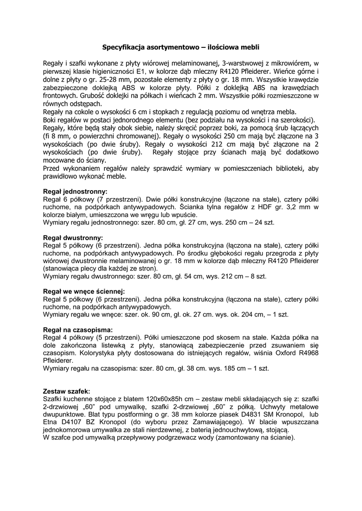 Specyfikacja asortymentowo – ilościowa mebli Regały i szafki wykonane z płyty wiórowej melaminowanej, 3-warstwowej z mikrowiórem, w pierwszej klasie higieniczności E1, w kolorze dąb mleczny R4120 Pfleiderer. Wieńce górne i dolne z płyty o gr. 25-28 mm, pozostałe elementy z płyty o gr. 18 mm. Wszystkie krawędzie zabezpieczone doklejką ABS w kolorze płyty. Półki z doklejką ABS na krawędziach frontowych. Grubość doklejki na półkach i wieńcach 2 mm. Wszystkie półki rozmieszczone w równych odstępach. Regały na cokole o wysokości 6 cm i stopkach z regulacją poziomu od wnętrza mebla. Boki regałów w postaci jednorodnego elementu (bez podziału na wysokości i na szerokości). Regały, które będą stały obok siebie, należy skręcić poprzez boki, za pomocą śrub łączących (fi 8 mm, o powierzchni chromowanej). Regały o wysokości 250 cm mają być złączone na 3 wysokościach (po dwie śruby). Regały o wysokości 212 cm mają być złączone na 2 wysokościach (po dwie śruby). Regały stojące przy ścianach mają być dodatkowo mocowane do ściany. Przed wykonaniem regałów należy sprawdzić wymiary w pomieszczeniach biblioteki, aby prawidłowo wykonać meble. Regał jednostronny: Regał 6 półkowy (7 przestrzeni). Dwie półki konstrukcyjne (łączone na stałe), cztery półki ruchome, na podpórkach antywypadowych. Ścianka tylna regałów z HDF gr. 3,2 mm w kolorze białym, umieszczona we wręgu lub wpuście. Wymiary regału jednostronnego: szer. 80 cm, gł. 27 cm, wys. 250 cm – 24 szt. Regał dwustronny: Regał 5 półkowy (6 przestrzeni). Jedna półka konstrukcyjna (łączona na stałe), cztery półki ruchome, na podpórkach antywypadowych. Po środku głębokości regału przegroda z płyty wiórowej dwustronnie melaminowanej o gr. 18 mm w kolorze dąb mleczny R4120 Pfleiderer (stanowiąca plecy dla każdej ze stron). Wymiary regału dwustronnego: szer. 80 cm, gł. 54 cm, wys. 212 cm – 8 szt. Regał we wnęce ściennej: Regał 5 półkowy (6 przestrzeni). Jedna półka konstrukcyjna (łączona na stałe), cztery półki ruchome, na podpórkach antywypadowych. Wymiary regału we wnęce: szer. ok. 90 cm, gł. ok. 27 cm. wys. ok. 204 cm, – 1 szt. Regał na czasopisma: Regał 4 półkowy (5 przestrzeni). Półki umieszczone pod skosem na stałe. Każda półka na dole zakończona listewką z płyty, stanowiącą zabezpieczenie przed zsuwaniem się czasopism. Kolorystyka płyty dostosowana do istniejących regałów, wiśnia Oxford R4968 Pfleiderer. Wymiary regału na czasopisma: szer. 80 cm, gł. 38 cm. wys. 185 cm – 1 szt. Zestaw szafek: Szafki kuchenne stojące z blatem 120x60x85h cm – zestaw mebli składających się z: szafki 2-drzwiowej „60” pod umywalkę, szafki 2-drzwiowej „60” z półką. Uchwyty metalowe dwupunktowe. Blat typu postforming o gr. 38 mm kolorze piasek D4831 SM Kronopol, lub Etna D4107 BZ Kronopol (do wyboru przez Zamawiającego). W blacie wpuszczana jednokomorowa umywalka ze stali nierdzewnej, z baterią jednouchwytową, stojącą. W szafce pod umywalką przepływowy podgrzewacz wody (zamontowany na ścianie). Garderoba naścienna we wnęce: Panel z płyty wiórowej melaminowanej gr.18 mm w kolorze jak regały. Wszystkie krawędzie zabezpieczone doklejką ABS w kolorze płyty. Wymiary panelu: szer. ok. 93 cm, wys. ok. 210 cm. Na płycie umocowane 6 wieszaków dwupoziomowych, np. RW08 firmy Gamet. Taboret na kółkach: taboret mobilny – ułatwia dostęp do wyższych półek biblioteki specjalny system trzech kółek pozwala na swobodne przemieszczanie w trakcie stawania, pod ciężarem człowieka, podstawa osiada na antypoślizgowych gumach system zapobiega wysunięciu podstawy z pod nóg 2 stopnie do wchodzenia wykonany z niezwykle mocnego plastiku duża powierzchnia pozwala na stabilne ułożenie stóp odporny na wyszczerbienie, zarysowania, pęknięcia posiada certyfikat GS maksymalne obciążenie: 150 kg średnica górna: 283 mm, średnica dolna: 433 mm wysokość pod obciążeniem: 410 mm wysokość bez obciążenia: 418 mm kolor szary, czarny, czerwony, niebieski – do wyboru przez Zamawiającego Ilość – 1 szt.