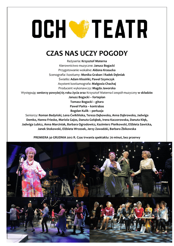 CZAS NAS UCZY POGODY Reżyseria: Krzysztof Materna Kierownictwo muzyczne: Janusz Bogacki Przygotowanie wokalne: Aldona Krasucka Scenografia i kostiumy: Monika Graban i Radek Dębniak Światło: Adam Kłosińki, Paweł Szymczyk Asystent kostiumografa: Małgosia Chachaj Producent wykonawczy: Magda Jaworska Występują: seniorzy powyżej 65 roku życia oraz Krzysztof Materna i zespół muzyczny w składzie: Janusz Bogacki – fortepian Tomasz Bogacki – gitara Paweł Pańta – kontrabas Bogdan Kulik – perkusja Seniorzy: Roman Bedyński, Lena Ćwiklińska, Teresa Dębowska, Anna Dąbrowska, Jadwiga Demko, Hanna Frieske, Mariola Gajos, Danuta Gołąbek, Irena Kaczorowska, Danuta Kłęk, Jadwiga Lubicz, Anna Marciniak, Barbara Ogrodowicz, Kazimierz Pieńkowski, Elżbieta Sawicka, Janek Stokowski, Elżbieta Wrzosek, Jerzy Zawadzki, Barbara Żbikowska PREMIERA 30 GRUDNIA 2012 R. Czas trwania spektaklu: 70 minut, bez przerwy Opis spektaklu: Spektakl muzyczny złożony z pereł polskiej muzyki rozrywkowej. Występować w nim - czyli śpiewać - będzie 19 osób wyłonionych na podstawie kilku przesłuchań. Są to starsi ludzie, amatorzy zajmujący się śpiewaniem od lat. Spektakl jest pomysłem Krzysztofa Materny, muzykę na żywo zagra zespół muzyczny pod kierownictwem Janusza Bogackiego. On też będzie autorem wszystkich aranżacji. Jak mówi Krzysztof Materna, jest to "spektakl o młodości w starości", czyli o tym, że wraz z wiekiem przybywa nam doświadczeń i mądrości, ale pozostaje też radość, energia, zachwyt nad światem czy chęć tworzenia. Będzie to antidotum na stereotypowe, "polskie" rozumienie starości. Usłyszymy między innymi tytułowy uwtór "Czas nas uczy pogody" czy też słynną piosenkę "Pamiętasz, była jesień". Fragmenty recenzji: „Punktem kulminacyjnym jest wstęp do piosenki „Jaskółka uwięziona”, kiedy przed mikrofonem staje niepozorna pani w granatowym żakiecie. Nagle wszyscy zamierają w bezruchu. Moc oddziaływania tego powalającego na kolana utworu, w tym konkretnym wykonaniu przerasta najśmielsze oczekiwania. Nie czekając na koniec linii melodycznej poderwałem się z siedzenia, a ze mną cała reszta publiczności i przy tej owacji na stojąco nie dało się już nie płakać. Śmiem zaryzykować stwierdzenie, że w tym momencie nie było ani jednej suchej powieki w całym teatrze.” Marek Kubiak ***** „Spektakl „Czas nas uczy pogody” powinien zobaczyć każdy, bez względu na wiek, płeć czy wykonywany zawód. To spektakl - koncert, który budzi nadzieję, uczy się cieszyć, a gdzieś między wierszami opowiada o prawdziwym sensie życia i kochania. O kochaniu życia.” Katarzyna Binkiewicz ***** „Cały zespół jest rewelacyjny, ale na pierwszy plan wybija się dwójka wykonawców: Janek Stokowski i Hanna Frieske. Stokowski, przedstawiający się w programie jako emerytowany kolejarz i kolekcjoner czapek, z prawdziwym bluesowym feelingiem i drapieżnością śpiewa "Kiedy byłem małym chłopcem" Breakoutów i "Czerwony jak cegła" Dżemu. Oba zespoły mogłyby go przyjąć na frontmana. Z kolei Frieske chwyta publiczność za gardło pełnym dramatyzmu wykonaniem "Jaskółki uwięzionej" z repertuaru Stana Borysa. W domu przesłuchałem dla porównania oryginalne wykonanie. Piosenkarz mógłby pani Frieske nosić nuty.” Roman Pawłowski ***** „Zachęcony tytułem poszedłem do warszawskiego Och-Teatru na przedstawienie CZAS NAS UCZY POGODY w reżyserii Krzysztofa Materny. Nie miałem pojęcia, na co idę, jacy artyści występują – nic. Nagle moim oczom ukazała się 20-osobowa kawalkada nie najmłodszych debiutantów pod nazwą Grupa 65 +. Uśmiechnięci, kolorowi, pełni wigoru i radości wkroczyli na scenę i zawładnęli nią przez ponad godzinę. Były kolejarz, biolog paleontolog, radczyni z Ministerstwa Finansów, makramistka po raz pierwszy na scenie, choć w wieku emerytalnym. Ze swoją tremą, niepewnością, ale też wielką odwagą, nadzieją i wiarą wzruszyli mnie tego wieczoru wielokrotnie.” Maciej Stuhr IMPRESARIAT TEATRU POLONIA I OCH-TEATRU: Iwona Gradkowska kom. 609 062 817 / email: [email protected] www.ochteatr.com.pl