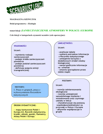MAGDALENA SZEWCZYK Dział programowy : Ekologia temat lekcji :ZANIECZYSZCZENIE ATMOSFERY W POLSCE i EUROPIE Cele lekcji w kategoriach czynności uczniów (cele operacyjne): UMIEJĘTNOŚCI: WIADOMOŚCI Uczeń: - wymienia rodzaje zanieczyszczeń - podaje źródła zanieczyszczeń powietrza - podaje podział zanieczyszczeń powietrza - definiuje pojęcie emisji transgranicznej Uczeń: - analizuje tabele - wybiera potrzebne informacje z Rocznika statystycznego - umiejętnie korzysta z dodatkowych źródeł wiedzy biologicznej - nanosi graficznie informacje na schemat - omawia sporządzone przez siebie mapki POSTAWY: METODY: 1. Praca w grupach, praca z wykorzystaniem Roczników statystycznych ŚRODKI DYDAKTYCZNE: - mapy konturowe Polski i Europy A3, Rocznik statystyczny, kredki, ołówki, gumki, flamastry, Atlasy Polski i Europy Uczeń: - rozwija zainteresowania ekologiczne - rozwija umiejętność samodzielnego myślenia i wnioskowania oraz czynnego udziału w lekcji - charakteryzuje się postawą współodpowiedzialności za przyrodę w Polsce i Europie - aktywnie współpracuje w grupie Przebieg lekcji I Faza wprowadzająca: 1. Przywitanie nauczyciela z uczniami i sprawdzenie listy obecności. 2. Odwołanie się do wiadomości z poprzedniej lekcji dotyczących zanieczyszczeń 3. Zapisanie tematu na tablicy i uświadomienie uczniom głównego celu lekcji. II Faza realizacyjna: 1. PRACA Z ROCZNIKAMI STATYSTYCZNYMI w GRUPACH. Nauczyciel dzieli klasę na 6 grup, którym zostaną przydzielone zadania. Każda grupa otrzymuje mapę konturową Polski lub Europy w formacie A3 (w załączniku mapy do skserowania na format A3) oraz roczniki statystyczne, Atlasy Polski i Europy Rodzaje grup: I grupa - mapa konturowa Polski – emisja zanieczyszczeń pyłowych wg województw II grupa - mapa konturowa Polski - emisja zanieczyszczeń pyłowych wg województw III grupa - mapa konturowa Polski – zakłady emitujące zanieczyszczenie powietrza wg województw IV grupa - mapa konturowa Europy – emisja gazów cieplarnianych wg rodzajów V grupa - mapa konturowa Europy - emisja gazów cieplarnianych wg źródeł VI grupa - mapa konturowa Europy – emisja lotnych związków organicznych Polecenie: Na mapkach konturowych Polski lub Europy zamalujcie różnymi odcieniami jednego koloru obszary o rożnym stężeniu zanieczyszczeń w powietrzu, podporządkowując najjaśniejszy kolor najczystszemu regionowi, a najciemniejszy zanieczyszczonemu. Niektórzy, w zależności od grupy, mogą na jednej mapce zaznaczyć stężenie różnych substancji używając nie tylko kolorów ale tez symboli. Duży symbol odpowiadać może dużej emisji wybranej substancji a mały- małej emisji wybranej substancji toksycznej w atmosferze. Potrzebne dane uzyskacie w Roczniku statystycznym z ostatnich lat. Pamiętajcie o dodaniu legendy. 2. PREZENTACJA I OMÓWIENIE MAPEK PRZEZ UCZNIÓW II Faza podsumowująca: 1. 1.Podsumowanie pracy uczniów przez nauczyciela. Wywieszenie mapek w sali biologicznej w celu późniejszego wykorzystania. 2. Nagrodzenie pracy uczniów punktami. 3. Zostawienie porządku w sali. ZAŁĄCZNIK