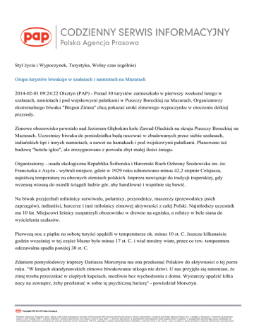Styl życia i Wypoczynek, Turystyka, Wolny czas (ogólnie) Grupa turystów biwakuje w szałasach i namiotach na Mazurach 2014-02-01 09:24:22 Olsztyn (PAP) - Ponad 30 turystów zamieszkało w pierwszy weekend lutego w szałasach, namiotach i pod wojskowymi pałatkami w Puszczy Boreckiej na Mazurach. Organizatorzy ekstremalnego biwaku "Biegun Zimna" chcą pokazać uroki zimowego wypoczynku w otoczeniu dzikiej przyrody. Zimowe obozowisko powstało nad Jeziorem Głębokim koło Zawad Oleckich na skraju Puszczy Boreckiej na Mazurach. Uczestnicy biwaku do poniedziałku będą nocować w zbudowanych przez siebie szałasach, indiańskich tipi i innych namiotach, a nawet na hamakach i pod wojskowymi pałatkami. Planowano też budowę "hotelu igloo", ale zrezygnowano z powodu zbyt małej ilości śniegu. Organizatorzy - osada ekologiczna Republika Ściborska i Harcerski Ruch Ochrony Środowiska im. św. Franciszka z Asyżu - wybrali miejsce, gdzie w 1929 roku odnotowano minus 42,2 stopnie Celsjusza, najniższą temperaturę na obecnych ziemiach polskich. Impreza nawiązuje do tradycji traperskiej, gdy wczesną wiosną do osiedli ściągali ludzie gór, aby handlować i wspólnie się bawić. Na biwak przyjechali miłośnicy surwiwalu, polarnicy, przyrodnicy, maszerzy (przewodnicy psich zaprzęgów), indianiści, harcerze i inni miłośnicy zimowej aktywności z całej Polski. Najmłodszy uczestnik ma 10 lat. Miejscowi leśnicy zaopatrzyli obozowisko w drewno na ogniska, a rolnicy w bele siana do wyścielenia szałasów. Pierwszą noc z piątku na sobotę turyści spędzili w temperaturze ok. minus 10 st. C. Jeszcze kilkanaście godzin wcześniej w tej części Mazur było minus 17 st. C. i wiał mroźny wiatr, przez co tzw. temperatura odczuwalna spadła poniżej 30 st. C. Zdaniem pomysłodawcy imprezy Dariusza Morsztyna ma ona przekonać Polaków do aktywności o tej porze roku. "W krajach skandynawskich zimowe biwakowanie nikogo nie dziwi. U nas przyjęło się natomiast, że zimę trzeba przeczekać w ciepłych kapciach, możliwie bez wychodzenia z domu. Wystarczy spędzić kilka nocy na zewnątrz, żeby przełamać w sobie tę psychiczną barierę" - powiedział Morsztyn. Copyright PAP SA 2014 http://csi.pap.pl Organizatorzy "Bieguna Zimna" chcą też pokazać, że Mazury są warte odwiedzenia zimą, gdy nie ma tłumów turystów. Na bazę wybrali Puszczę Borecką, co ma gwarantować kontakt z dziką przyrodą. Podczas wypraw terenowych uczestnicy pod nadzorem fachowego przewodnika będą szukali tropów wilków, rysi i innych leśnych zwierząt. Od sobotniego popołudnia obozowisko będzie otwarte dla zwiedzających. Zaplanowano turnieje traperskie, zabawy przy ognisku, pokazy psich zaprzęgów, zawody drwali, spotkania ze znanymi polarnikami, konkursy kulinarne i inne turystyczne atrakcje. (PAP) mbo/ pz/ Copyright PAP SA 2014 http://csi.pap.pl
