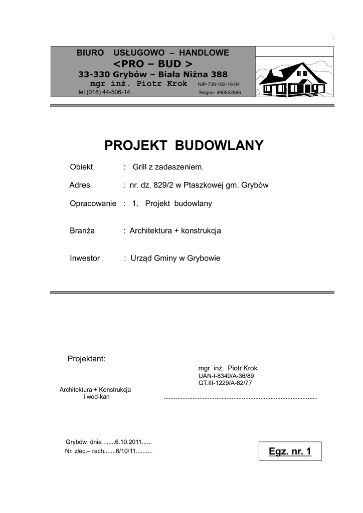 BIURO USŁUGOWO – HANDLOWE <PRO – BUD > 33-330 Grybów – Biała Niżna 388 mgr inż. Piotr Krok tel.(018) 44-506-14 NIP-738-183-18-04 Regon- 490552866 PROJEKT BUDOWLANY Obiekt : Grill z zadaszeniem. Adres : nr. dz. 829/2 w Ptaszkowej gm. Grybów Opracowanie : 1. Projekt budowlany Branża : Architektura + konstrukcja Inwestor : Urząd Gminy w Grybowie Projektant: mgr inż. Piotr Krok UAN-I-8340/A-36/89 GT.III-1229/A-62/77 Architektura + Konstrukcja i wod-kan Grybów dnia .......6.10.2011...... Nr. zlec.– rach.......6/10/11.......... ........................................................................................... Egz. nr. 1 OPIS TECHNICZ NY 1. Podstawa opracowania - umowa - zlecenie Inwestora - wizja lokalna w terenie - program użytkowy Inwestora - literatura i normy techniczne 2. Cel i zakres opracowania Opracowanie obejmuje projekt architektoniczny budowy grilla z zadaszeniem Opracowanie niniejsze będzie podstawą do uzyskania przez Inwestora pozwolenia na budowę. 3. Lokalizacja Grill zlokalizowany jest na działce położonej w Ptaszkowej gm. Grybów. Teren działki ze spadkiem 1 % w kierunku północnym. Działka nie ogrodzona dojazd z istniejącej drogi asfaltowej gminnej. Szczegółowa lokalizacja wg. wskazania inwestora. 4. Dane ogólne: Pow. zabudowy - 35.0 m2 5. Rozwiązania funkcjonalno użytkowe W poziomie parteru - projektuje się zadaszenie z grilem murowanym z cegły klinkierowej. Poziom zerowy zadaszenia znajduje się 5 cm nad poziomem terenu przyległego. Dojazd i dojście piesze do budynku o nawierzchni utwardzonej. 6. Opis konstrukcji. a. Posadowienie Zadaszenie posadowiony jest na ławach betonowych z betonu żwirowego. Szerokość ław fundamentowych 30 cm Posadowienie ław 120 cm od przylegającego terenu. Słupy drewniane zakotwione na uchwytach stalowych w fundamencie. b. Ściany Konstrukcja drewniana z drewna iglastego. Słupy drewniane zakotwione na uchwytach stalowych w fundamencie betonowym. Słupy zwieńczone związką 14x14 cm do której przymocowana będzie więźba dachowa. Część grilowa odeskowana szalunkiem z desek i zaimpregnowana. W części zadaszenia projektuję się barierkę. c. Dach Dach zaprojektowano w konstrukcji drewnianej Zadaszenie - dachem czterospadowym . Pokrycie - gąt papowy na pełnym deskowaniu. Konstrukcja dachu drewniana - krokwiowo - jętkowa. Drewno iglaste, zaimpregnować środkami owado i grzybobójczymi. Elementy więźby - przyjęto konstrukcyjnie wymiary elementów konstrukcyjnych: - słupy i związki - krokwie 14/14 6,3/14, d. Roboty wykończeniowe - posadzka z kostki ozdobnej na podsypce /piasek z cementem/. - rynny i rury spustowe z PCV - gril z cegły klinkierowej na fundamencie betonowym. /wg. rysunku/ - inne elementy i roboty: wokół budynku wykonać opaskę z kostki ozdobnej na podsypce piaskowej. 7. Uwagi końcowe. Roboty budowlane wykonać zgodnie ze sztuką budowlaną, warunkami i normami pod nadzorem osób uprawnionych. Ewentualne zmiany funkcjonalno - architektoniczne należy uzgodnić z projektantem i zleceniodawcą.