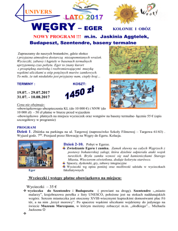 UNIVERS LATO 2006 WĘGRY – EGER KOLONIE I OBÓZ NOWY PROGRAM !!! m.in. Jaskinia Aggtelek, Budapeszt, Szentendre, baseny termalne Zapraszamy do naszych bratanków, gdzie słońce i przyjazna atmosfera dostarczą niezapomnianych wrażeń. Wycieczki, zabawy i kąpiele w basenach termalnych uprzyjemnią czas pobytu. Eger to znany kurort z przepiękną starówką i rozbrzmiewającymi muzyką wąskimi uliczkami u stóp potężnych murów zamkowych. To miłe, że tak niedaleko jest przyjazny nam, ciepły kraj… TERMINY : EGER ♥ KOSZT: 19.07. - 29.07.2017 31.07. - 10.08.2017 Cena nie obejmuje: -obowiązkowego ubezpieczenia KL (do 10 000 €) i NNW (do 10 000 zł) - 50 zł płatne w biurze przed wyjazdem -obowiązkowo płatnych na miejscu wycieczek oraz wstępów na baseny termalne- łącznie 55 € (opis szczegółowy w programie) PROGRAM Dzień 1. Zbiórka na parkingu na ul. Targowej (naprzeciwko Szkoły Filmowej – Targowa 61/63) . Wyjazd godz. 700. Przejazd przez Słowację na Węgry do Egeru. Kolacja. Dzień 2-10. Pobyt w Egerze. Zwiedzanie Egeru i zamku. Zamek sławny na całych Węgrzech z postawy bohaterskiej załogi, która dzielnie odpierała ataki wojsk tureckich. Bryła zamku wznosi się nad kamieniczkami Starego Miasta. Wieczorem oświetlona, dodaje kolorytu starówce. Eger Spacery, dyskoteki, gry, zabawy integracyjne Wycieczki wg opisu poniżej oraz możliwość udziału w wycieczkach fakultatywnych Wycieczki i wstępy płatne obowiązkowo na miejscu: Wycieczki – 35 €  wycieczka do Szentendre i Budapesztu ( prowiant na drogę). Szentendre -„miasto malarzy”, krajobrazowa perełka z listy UNESCO, położone jest na stokach naddunajskich wzgórz. Sercem miasteczka jest otoczony XVIII-wiecznymi kupieckimi domostwami plac Fő tér, a na nim „krzyż morowy”. Po spacerze wąskimi uliczkami wejdziemy do jedynego na świecie Muzeum Marcepanu, w którym możemy zobaczyć m.in. „słodkiego”... Michaela Jacksona   Budapeszt to jedna z najpiękniej położonych stolic Europy, którą UNESCO uznało za część Światowego Dziedzictwa. Od Placu Bohaterów dotrzemy parkiem do zamku Vajdahunyad. Przejedziemy głównym bulwarem Pesztu przyozdobionym w rzędy ambasad, pałaców i okazałych kamienic. Po stronie starej Budy na naddunajskim wzgórzu pospacerujemy od Baszty Rybackiej pośród zamkowych fortyfikacji. Wieczorem wjedziemy na Górę Gellerta z cytadelą na szczycie, skąd obejrzymy niezapomnianą panoramę Budapesztu, z widokiem na Dunaj, jego mosty i Parlament.  Wycieczka do Parków Narodowych Krasu Węgierskiego i Gór Bukowych ze wstępem do jaskini w Aggtelek. Pośród licznych atrakcji tej wycieczki niezapomniane są przede wszystkim: przejazd kolejką wąskotorową pośród pięknych gór i nieskażonej przyrody, spacer wzdłuż potoku i wodospadu Szalajka oraz zwiedzanie jaskini krasowej. Jaskinia Baradla w Aggtelek należy do najciekawszych atrakcji przyrodniczych Europy Środkowej. Wycieczka korytem podziemnej rzeki Styks m.in. przez Rajski Korytarz, Salę Koronkową, Korytarz Nietoperzy, wprowadzi nas w świat kolorów, fantazyjnych form skalnych i nieprawdopodobnej wielkości stalaktytów. Wstępy na baseny termalne – 20 €  dwa całodzienne termalnych wstępy na kompleks basenów w Egerze. W kompleksie: basen o wymiarach olimpijskich, basen rekr. (czepek !,), 3 baseny termalne (temp. 24 – 36o) - jeden z wysepkami i ze zjeżdżalniami. Zespół basenowy z biczami podwodnymi Na terenie kąpieliska miejsce do gier oraz gastronomia. www.egertermal.hu  wstęp popołudniowy do nowoczesnego Eger Szalok. Kąpielisko na wolnym powietrzu zasilają dwa gorące źródła. Niecodzienny, wręcz bajkowy widok: basen z gorącą wodą otoczony jest gęstym lasem i skałami pokrytymi białym osadem. .www.egerszalok.hu Możliwość dodatkowych wstępów na baseny w Egerze – do decyzji grup Fakultatywnie: wycieczka do Miszkolca na kąpielisko termalne w jaskiniach koszt ok. 15 € (grupa min. 35 os.). Ewenement na skalę europejską – bajkowe kąpielisko termalne w jaskini i wiele innych atrakcji wodnych. Wyjazd po obiedzie, powrót na kolację. Dzień 11. Po śniadaniu wyjazd do Polski. Planowany przyjazd na miejsce zbiórki ok. godz. 20.30 - 21.30 Uwaga: ostatni turnus zakończenie 10-go dnia. ŚWIADCZENIA:  Zakwaterowanie w internacie położonym w niedalekiej odległości od kompleksu basenów, zamku i zabytkowego centrum. Pokoje 3/4 osobowe z łazienkami. 10 noclegów  https://picasaweb.google.com/btunivers/EgerAkademik#5324664326384642050     Wyżywienie 3 razy dziennie - 10 świadczeń Transport autokarem. Wycieczki i atrakcje jak w programie. Opieka wykwalifikowanej kadry pedagogicznej, rezydenta i tłumacza. Na wyjazd konieczny jest paszport lub dowód osobisty. Wskazane posiadanie karty ubezp. EKUZ. UNIVERS – Biuro Turystyczne 90-307 Łódź Al. J. Piłsudskiego 35 tel. (42) 630 52 12 [email protected] fax (42) 633 79 00 www.btunivers.pl