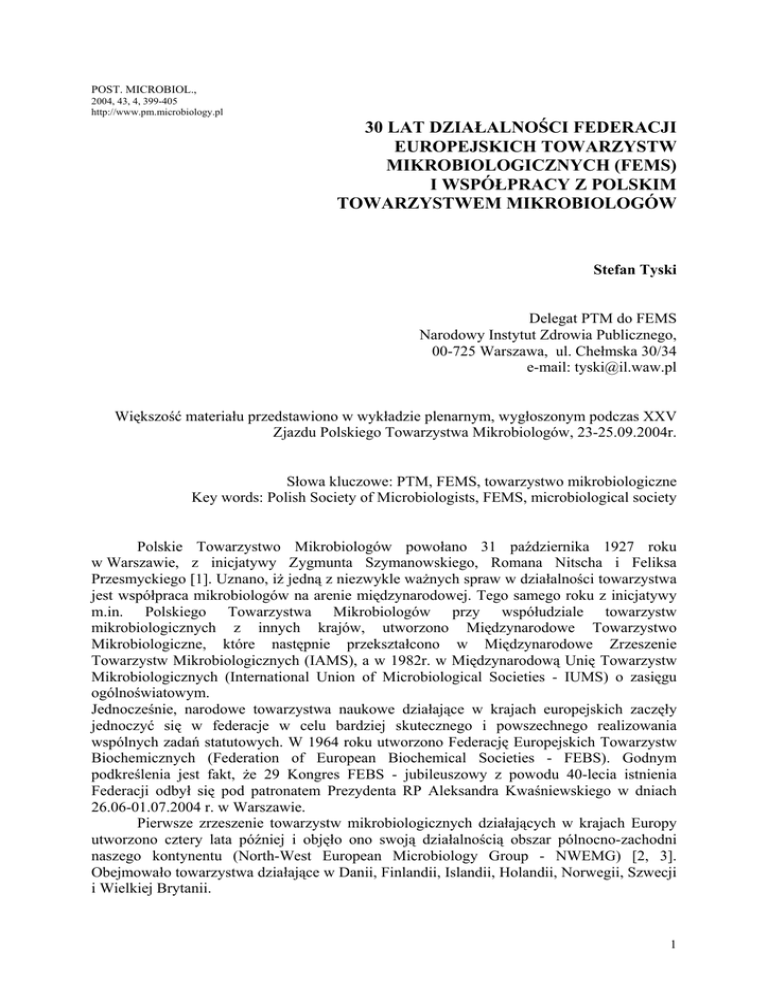 POST. MICROBIOL., 2004, 43, 4, 399-405 http://www.pm.microbiology.pl 30 LAT DZIAŁALNOŚCI FEDERACJI EUROPEJSKICH TOWARZYSTW MIKROBIOLOGICZNYCH (FEMS) I WSPÓŁPRACY Z POLSKIM TOWARZYSTWEM MIKROBIOLOGÓW Stefan Tyski Delegat PTM do FEMS Narodowy Instytut Zdrowia Publicznego, 00-725 Warszawa, ul. Chełmska 30/34 e-mail: [email protected] Większość materiału przedstawiono w wykładzie plenarnym, wygłoszonym podczas XXV Zjazdu Polskiego Towarzystwa Mikrobiologów, 23-25.09.2004r. Słowa kluczowe: PTM, FEMS, towarzystwo mikrobiologiczne Key words: Polish Society of Microbiologists, FEMS, microbiological society Polskie Towarzystwo Mikrobiologów powołano 31 października 1927 roku w Warszawie, z inicjatywy Zygmunta Szymanowskiego, Romana Nitscha i Feliksa Przesmyckiego [1]. Uznano, iż jedną z niezwykle ważnych spraw w działalności towarzystwa jest współpraca mikrobiologów na arenie międzynarodowej. Tego samego roku z inicjatywy m.in. Polskiego Towarzystwa Mikrobiologów przy współudziale towarzystw mikrobiologicznych z innych krajów, utworzono Międzynarodowe Towarzystwo Mikrobiologiczne, które następnie przekształcono w Międzynarodowe Zrzeszenie Towarzystw Mikrobiologicznych (IAMS), a w 1982r. w Międzynarodową Unię Towarzystw Mikrobiologicznych (International Union of Microbiological Societies - IUMS) o zasięgu ogólnoświatowym. Jednocześnie, narodowe towarzystwa naukowe działające w krajach europejskich zaczęły jednoczyć się w federacje w celu bardziej skutecznego i powszechnego realizowania wspólnych zadań statutowych. W 1964 roku utworzono Federację Europejskich Towarzystw Biochemicznych (Federation of European Biochemical Societies - FEBS). Godnym podkreślenia jest fakt, że 29 Kongres FEBS - jubileuszowy z powodu 40-lecia istnienia Federacji odbył się pod patronatem Prezydenta RP Aleksandra Kwaśniewskiego w dniach 26.06-01.07.2004 r. w Warszawie. Pierwsze zrzeszenie towarzystw mikrobiologicznych działających w krajach Europy utworzono cztery lata później i objęło ono swoją działalnością obszar pólnocno-zachodni naszego kontynentu (North-West European Microbiology Group - NWEMG) [2, 3]. Obejmowało towarzystwa działające w Danii, Finlandii, Islandii, Holandii, Norwegii, Szwecji i Wielkiej Brytanii. 1 Tabela I Prezydenci FEMS Andre Lwoff Orjan Ouchterlony Eduard Kellenberger Hans Veldkamp Marian Mordarski Joseph Alouf Helena Makela Cesar Nombela Raymond Auckenthaler Hans Truper Eliora Ron Francja Szwecja Szwajcaria Holandia Polska Francja Finlandia Hiszpania Szwajcaria XI.1974 - XI.1976 XI.1976 - IX.1980 IX.1980 - VII.1983 VII.1983 - IX.1986 IX.1986 - IX.1989 IX.1989 - IX.1992 IX.1992 - IX.1995 IX.1995 - IX.1998 IX.1998 - IX.2001 Niemcy Izrael IX.2001 - IX.2004 Od 11.IX.2004 Struktura i działalność FEBS, nie ograniczona geograficznie, posłużyła jako model dla utworzenia dużej europejskiej federacji towarzystw mikrobiologicznych. Dzięki poparciu działaczy brytyjskiego towarzystwa Society of General Microbiology (Sir David Evans, Harry Smith, Tony Rose i Andre Lwoff), w maju 1973 roku w Paryżu nastąpiło spotkanie przedstawicieli 13 europejskich towarzystw mikrobiologicznych, z których 9 poparło ideę utworzenia federacji na wzór FEBS. W następnym roboczym spotkaniu w styczniu 1974r w Londynie, reprezentowanych było 13 towarzystw a 5 kolejnych wykazało zainteresowanie ideą federacji. Opracowano projekt statutu Federation of European Microbiological Societies (FEMS), który został rozesłany do wszystkich towarzystw mikrobiologicznych działających w Europie. Zaproponowano aby tymczasowe władze FEMS miały swoją siedzibę w biurze Society of General Microbiology w Reading, Wielka Brytania. Godnym podkreślenia jest fakt, że prof. Marian Mordarski - prezes Polskiego Towarzystwa Mikrobiologów został wybrany obok A. Lwoffa (Francuskie Towarzystwo Mikrobiologów), A.H. Rosea i H. Smitha (Society for General Microbiology) oraz H. Seeligera (Deutsche Gesellschaft fűr Hygiene und Mikrobiologie) do tymczasowego zarządu (Executive Committee) FEMS. Grupa ta przygotowała pierwsze spotkanie - Council of the Federation, które odbyło się w Amsterdamie 22 listopada 1974 roku. Wybrano pierwszy zarząd FEMS. Prezydentem został A. Lwoff a wiceprezydentem prof. Marian Mordarski, skarbnikiem - H. Smith natomiast A.H. Rose sekretarzem generalnym a C.J.E.A. Bulder - sekretarzem spotkań. W tabelach I oraz II zamieszczono dotychczasowych prezydentów i wiceprezydentów FEMS. Równolegle z FEMS, przez 11 lat funkcjonowała Grupa NWEMG, aż do konferencji w Dublinie "Extracellular products of microorganisms" zorganizowanej we wrześniu 1979r, kiedy to podjęto decyzję o rozwiązaniu NWEMG. W Europie pozostało tylko jedno stowarzyszenie towarzystw mikrobiologicznych - FEMS [2, 3]. Oprócz Polskiego Towarzystwa Mikrobiologów, członkami założycielami FEMS były narodowe towarzystwa mikrobiologiczne z następujących krajów: Bułgarii, Danii, Finlandii, Francji, Grecji, Hiszpanii, Holandii, Izraela, Jugosławii, Niemiec, Norwegii, Portugalii, Szwajcarii, Szwecji i Wielkiej Brytanii oraz towarzystwa międzynarodowe: Society for Applied Bacteriology i Society for General Microbiology. Obecnie do FEMS należy 37 narodowych towarzystw mikrobiologicznych, 3 towarzystwa o charakterze ponad narodowym a także 6 afiliowanych towarzystw które współpracują w ramach FEMS - łącznie jest to ponad 30.000 osób zajmujących się rozmaitymi aspektami mikrobiologii [4]. Organem decyzyjnym federacji jest FEMS Council składający się z prezydenta, wiceprezydenta, sekretarza generalnego, skarbnika, przewodniczących komisji ds. publikacji, 2 Tabela II Wiceprezydenci FEMS Marian Mordarski Polska XI.1974 - IX.1980 IX.1980 - IX.1982 Elena Kondratieva Miloslav Kocur Cesar Nombela Raymond Auckenthaler Hans Truper Eliora Ron Milton S da Costa ZSRR Czechosłowacja Hiszpania Szwajcaria IX.1982 - IX.1988 IX.1988 - VII.1994 VII.1994 - IX.1995 IX.199