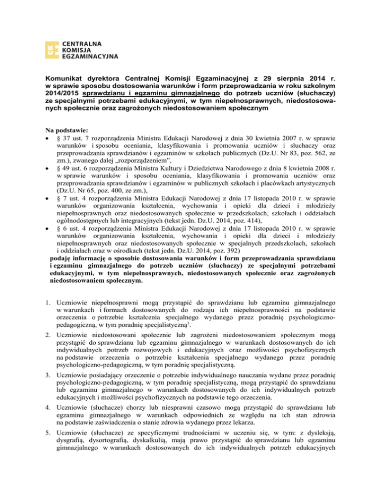 Komunikat dyrektora Centralnej Komisji Egzaminacyjnej z 29 sierpnia 2014 r. w sprawie sposobu dostosowania warunków i form przeprowadzania w roku szkolnym 2014/2015 sprawdzianu i egzaminu gimnazjalnego do potrzeb uczniów (słuchaczy) ze specjalnymi potrzebami edukacyjnymi, w tym niepełnosprawnych, niedostosowanych społecznie oraz zagrożonych niedostosowaniem społecznym Na podstawie: § 37 ust. 7 rozporządzenia Ministra Edukacji Narodowej z dnia 30 kwietnia 2007 r. w sprawie warunków i sposobu oceniania, klasyfikowania i promowania uczniów i słuchaczy oraz przeprowadzania sprawdzianów i egzaminów w szkołach publicznych (Dz.U. Nr 83, poz. 562, ze zm.), zwanego dalej „rozporządzeniem”, § 49 ust. 6 rozporządzenia Ministra Kultury i Dziedzictwa Narodowego z dnia 8 kwietnia 2008 r. w sprawie warunków i sposobu oceniania, klasyfikowania i promowania uczniów oraz przeprowadzania sprawdzianów i egzaminów w publicznych szkołach i placówkach artystycznych (Dz.U. Nr 65, poz. 400, ze zm.), § 7 ust. 4 rozporządzenia Ministra Edukacji Narodowej z dnia 17 listopada 2010 r. w sprawie warunków organizowania kształcenia, wychowania i opieki dla dzieci i młodzieży niepełnosprawnych oraz niedostosowanych społecznie w przedszkolach, szkołach i oddziałach ogólnodostępnych lub integracyjnych (tekst jedn. Dz.U. 2014, poz. 414), § 6 ust. 4 rozporządzenia Ministra Edukacji Narodowej z dnia 17 listopada 2010 r. w sprawie warunków organizowania kształcenia, wychowania i opieki dla dzieci i młodzieży niepełnosprawnych oraz niedostosowanych społecznie w specjalnych przedszkolach, szkołach i oddziałach oraz w ośrodkach (tekst jedn. Dz.U. 2014, poz. 392) podaję informację o sposobie dostosowania warunków i form przeprowadzania sprawdzianu i egzaminu gimnazjalnego do potrzeb uczniów (słuchaczy) ze specjalnymi potrzebami edukacyjnymi, w tym niepełnosprawnych, niedostosowanych społecznie oraz zagrożonych niedostosowaniem społecznym. 1. Uczniowie niepełnosprawni mogą przystąpić do sprawdzianu lub egzaminu gimnazjalnego w warunkach i formach dostosowanych do rodzaju ich niepełnosprawności na podstawie orzeczenia o potrzebie kształcenia specjalnego wydanego przez poradnię psychologicznopedagogiczną, w tym poradnię specjalistyczną1. 2. Uczniowie niedostosowani społecznie lub zagrożeni niedostosowaniem społecznym mogą przystąpić do sprawdzianu lub egzaminu gimnazjalnego w warunkach dostosowanych do ich indywidualnych potrzeb rozwojowych i edukacyjnych oraz możliwości psychofizycznych na podstawie orzeczenia o potrzebie kształcenia specjalnego wydanego przez poradnię psychologiczno-pedagogiczną, w tym poradnię specjalistyczną. 3. Uczniowie posiadający orzeczenie o potrzebie indywidualnego nauczania wydane przez poradnię psychologiczno-pedagogiczną, w tym poradnię specjalistyczną, mogą przystąpić do sprawdzianu lub egzaminu gimnazjalnego w warunkach dostosowanych do ich indywidualnych potrzeb edukacyjnych i możliwości psychofizycznych na podstawie tego orzeczenia. 4. Uczniowie (słuchacze) chorzy lub niesprawni czasowo mogą przystąpić do sprawdzianu lub egzaminu gimnazjalnego w warunkach odpowiednich ze względu na ich stan zdrowia na podstawie zaświadczenia o stanie zdrowia wydanego przez lekarza. 5. Uczniowie (słuchacze) ze specyficznymi trudnościami w uczeniu się, w tym: z dysleksją, dysgrafią, dysortografią, dyskalkulią, mają prawo przystąpić do sprawdzianu lub egzaminu gimnazjalnego w warunkach dostosowanych do ich indywidualnych potrzeb edukacyjnych i możliwości psychofizycznych na podstawie opinii poradni psychologiczno-pedagogicznej, w tym poradni specjalistycznej. 6. Uczniowie (słuchacze), którzy w roku szkolnym 2014/2015 są objęci pomocą psychologicznopedagogiczną w szkole ze względu na trudności adaptacyjne związane z wcześniejszym kształceniem za granicą, zaburzenia komunikacji językowej lub ze względu na sytuację kryzysową lub traumatyczną, mogą przystąpić do sprawdzianu lub egzaminu gimnazjalnego w warunkach dostosowanych do ich indywidualnych potrzeb edukacyjnych i możliwości psychofizycznych, na podstawie pozytywnej opinii rady pedagogicznej wydanej zgodnie z trybem określonym w § 37 ust. 5 rozporządzenia. 7. Za dostosowanie warunków i form przeprowadzania sprawdzianu lub egzaminu gimnazjalnego jest odpowiedzialny dyrektor szkoły jako przewodniczący szkolnego zespołu egzaminacyjnego. 8. Dyrektor szkoły dostosowuje odpowiednio warunki i formy przeprowadzania sprawdzianu lub egzaminu gimnazjalnego na podstawie wskazań rady pedagogicznej po uzyskaniu stanowiska rodziców (prawnych opiekunów) albo pełnoletniego słuchacza 9. Rada pedagogiczna wskazuje sposób lub sposoby dostosowania warunków i form przeprowadzania sprawdzianu lub egzaminu gimnazjalnego do potrzeb i możliwości uczniów, o których mowa w pkt 1–6, wybierając spośród możliwych sposobów dostosowania warunków i form przeprowadzania sprawdzianu lub egzaminu gimnazjalnego określonych w Tabeli 1. na podstawie: orzeczenia o potrzebie kształcenia specjalnego orzeczenia o potrzebie indywidualnego nauczania opinii poradni psychologiczno-pedagogicznej, w tym poradni specjalistycznej, o specyficznych trudnościach w uczeniu się 2 zaświadczenia o stanie zdrowia wydanego przez lekarza pozytywnej opinii rady pedagogicznej – wydanej na wniosek (a) nauczyciela lub (b) specjalisty wykonującego w szkole zadania z zakresu pomocy psychologicznopedagogicznej, prowadzących zajęcia z uczniem (słuchaczem) objętym pomocą psychologiczno-pedagogiczną ze względu na trudności adaptacyjne związane z wcześniejszym kształceniem za granicą, zaburzenia komunikacji językowej lub sytuację kryzysową lub traumatyczną, po uzyskaniu zgody rodziców (prawnych opiekunów) albo pełnoletniego ucznia (słuchacza) pozytywnej opinii rady pedagogicznej – wydanej na wniosek (c) rodziców (prawnych opiekunów) albo (d) pełnole