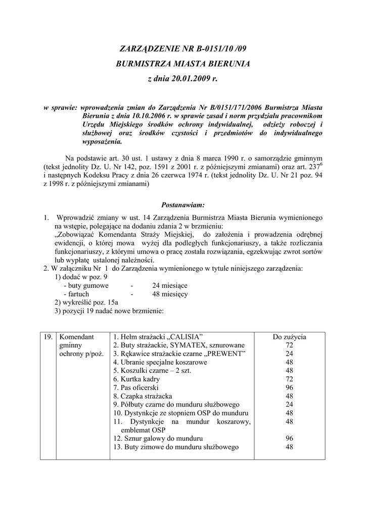 ZARZĄDZENIE NR B-0151/10 /09 BURMISTRZA MIASTA BIERUNIA z dnia 20.01.2009 r. w sprawie: wprowadzenia zmian do Zarządzenia Nr B/0151/171/2006 Burmistrza Miasta Bierunia z dnia 10.10.2006 r. w sprawie zasad i norm przydziału pracownikom Urzędu Miejskiego środków ochrony indywidualnej, odzieży roboczej i służbowej oraz środków czystości i przedmiotów do indywidualnego wyposażenia. Na podstawie art. 30 ust. 1 ustawy z dnia 8 marca 1990 r. o samorządzie gminnym (tekst jednolity Dz. U. Nr 142, poz. 1591 z 2001 r. z późniejszymi zmianami) oraz art. 2376 i następnych Kodeksu Pracy z dnia 26 czerwca 1974 r. (tekst jednolity Dz. U. Nr 21 poz. 94 z 1998 r. z późniejszymi zmianami) Postanawiam: 1. Wprowadzić zmiany w ust. 14 Zarządzenia Burmistrza Miasta Bierunia wymienionego na wstępie, polegające na dodaniu zdania 2 w brzmieniu: „Zobowiązać Komendanta Straży Miejskiej, do założenia i prowadzenia odrębnej ewidencji, o której mowa wyżej dla podległych funkcjonariuszy, a także rozliczania funkcjonariuszy, z którymi umowa o pracę została rozwiązania, egzekwując zwrot sortów lub wypłatę ustalonej należności. 2. W załączniku Nr 1 do Zarządzenia wymienionego w tytule niniejszego zarządzenia: 1) dodać w poz. 9 - buty gumowe 24 miesiące - fartuch 48 miesięcy 2) wykreślić poz. 15a 3) pozycji 19 nadać nowe brzmienie: 19. Komendant gminny ochrony p/poż. 1. Hełm strażacki „CALISIA” 2. Buty strażackie, SYMATEX, sznurowane 3. Rękawice strażackie czarne „PREWENT” 4. Ubranie specjalne koszarowe 5. Koszulki czarne – 2 szt. 6. Kurtka kadry 7. Pas oficerski 8. Czapka strażacka 9. Półbuty czarne do munduru służbowego 10. Dystynkcje ze stopniem OSP do munduru 11. Dystynkcje na mundur koszarowy, emblemat OSP 12. Sznur galowy do munduru 13. Buty zimowe do munduru służbowego Do zużycia 72 24 48 48 72 96 48 24 48 48 96 48 4) pozycja 19 staje się pozycją 20. 3. Załącznik Nr 2 otrzymuje brzmienie. Załącznik Nr 2 do Zarządzenia Nr B/0151/10/2009 Burmistrza Miasta Bierunia z dnia 20.01.2009 r. Lp. Nazwa odzieży i obuwia roboczego Cena 2 3 1 1. Bluzka wizytowa 2. Buty gumowe 3. Buty skórzane wizytowe 4. Buty profilaktyczne tekstylne 50,- 5. Fartuch syntetyczny 50,- 6. Garsonka 7. Hełm ochronny 30,- 8. Kamizelka ciepłochronna 60,- 9. Koszula flanelowa 40,- 10. Koszula wizytowa 100,- 11. Krawat 12. Kurtka ciepłochronna 300,- 13. Kurtka przeciwdeszczowa 150,- 14. Ręcznik frotowy 15. Rękawice gumowe 5,- 16. Rękawice ochronne drelichowe 6,- 17. Teczka służbowa 18. Ubranie męskie wizytowe 19. Marynarka 200,- 20. Spodnie 100,- 21. Hełm strażacki „CALISIA” 500,- 22. Buty strażackie skórzane SYMPATEX sznurowane 470,- 23. Rękawice strażackie czarne „PREWENT” 100,- 24. Ubranie specjalne koszarowe 300,- 120,70,220,- 600,- 50,- 35,- 600,1.100,- 25. Koszulki czarne 50,- 26. Kurtka kadry 300,- 27. Pas oficerski 100,- 28. Czapka strażacka 29. Półbuty czarne do munduru służbowego 30. Dystynkcje ze stopniem OSP do munduru 30,- 31. Dystynkcje na mundur koszarowy, emblemat OSP 30,- 32. Sznur galowy do munduru 50,- 33. Buty zimowe do munduru służbowego 250,- 34. Torba do przechowywania gotówki 100,- 70,150,- 4. Wykonanie Zarządzenia powierzam Kierownikowi Referatu Administracji, Naczelnikom Wydziałów i Kierownikom Referatów, w których zatrudni są pracownicy uprawnieni do otrzymywania sortów oraz Komendantowi Straży Miejskiej. 5. Zarządzenie wchodzi w życie z dniem podjęcia. Załącznik Nr 1 Lp. Stanowisko pracy 1 1. 2. 2 Burmistrz Zastępca Burmistrza 3. Kierownik USC 4. Z-ca Kierownika USC 5. 6. 7. 8. Skarbnik Sekretarz Radca Prawny Kierownik ADM 9. Kierowca samochodu służbowego 10. Inspektor ds archiwum 11. Inspektor d/s Lokalowych Inspektor Spraw Obywatelskich Konserwator 12. 13. do Zarządzenia Nr B/0151/10/2009 Burmistrza Miasta Bierunia z dnia 20.01.2009 r. Zakres wyposażenia: Przewidywany okres R – odzież i obuwie robocze używalności w mieO – ochrony indywidualnej siącach, w okresach zimowych (o.z.) i do zużycia 3 4 Teczka służbowa 36 1. Teczka służbowa 36 2. R – buty skórzane 12 3. O – buty gumowe 24 4. O – kurtka ciepłochronna 3 o.z. 5. O – kurtka przeciwdeszczowa 36 6. O – hełm ochronny do zużycia 1. Reprezentacyjny ubiór służbowy: - ubranie męskie służbowe 24 - koszula wizytowa – 2 kpl. 24 - krawat 12 - buty skórzane 24 1. Garsonka 24 2. Bluzka – 2 kpl. 24 3. Buty skórzane 24 Teczka służbowa 36 Teczka służbowa 36 Teczka służbowa 36 1. Teczka służbowa 36 2. Buty skórzane 12 3. Spodnie 12 4. Bluzka 12 1. Teczka służbowa 48 2. Marynarka 24 3. Koszula 24 4. Spodnie 24 5. Krawat 24 6. Buty skórzane 24 7. Buty gumowe 24 8. Fartuch 24 1. R – fartuch z tkaniny syntetycznej do zużycia (min. 36) 2. O – kamizelka ciepłochronna do zużycia 1. R – buty skórzane 36 2. R – kurtka ciepłochronna 36 1. Teczka służbowa 36 1. R – koszula flanelowa 2. R – buty skórzane 3. O – rękawice ochronne drelich. 24 24 do zużycia 1 14. 15. 16. 17. 18. 19. 20. 2 Sprzątaczka Naczelnik GK Z-ca naczelnika GK Kierownik RZM Naczelnik IMiR Z-ca naczelnika IMiR Naczelnik GPN Kierownik OŚRL Inspektor OŚRL Inspektorzy nadzoru Pracownik Wydz. GK odpowiedzialny za pobieranie opłat na płatnym parkingu gminnym Inspektorzy Wydz. GPN 3 1. R – fartuch z tkaniny syntetycznej 2. R – buty profilaktyczne tekstylne - 2 pary 3. O – rękawice gumowe 1. R – buty skórzane 2. O – buty gumowe 3. O – kurtka ciepłochronna 4. O – kurtka przeciwdeszczowa 5. 0 – hełm ochronny do zużycia 12 24 4 o.z. 48 do zużycia 1. Bury skórzane 2. R – kurtka przeciwdeszczowa 3. Kurtka ciepłochronna 4. R – torba na pasku 24 24 4 o.z. do zużycia 1. R – buty skórzane 2. O – buty gumowe 3. O – hełm ochronny Naczelnik FN i kasa 1. Teczka służbowa Komendant gminny 1. Hełm strażacki „CALISIA” ochrony p/pożarowej 2. Buty strażackie, SYMPATEX, sznurowane 3. rękawice str