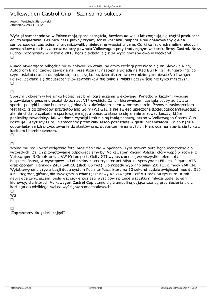 AutoRok.PL / DesignForum.PL Volkswagen Castrol Cup - Szansa na sukces Autor: Wojciech Sierpowski Zmieniony 28.11.2012. Wyścigi samochodowe w Polsce mają sporo szczęścia, bowiem od wielu lat znajdują się chętni producenci do ich wspierania. Bez nich nasz jedyny czynny tor w Poznaniu niepodzielnie opanowałaby giełda samochodowa, zaś ściganci organizowaliby nielegalne wyścigi uliczne. Od kilku lat o adrenalinę młodych zawodników dba Kia, a teraz na tory powraca Volkswagen przy tradycyjnym wsparciu firmy Castrol. Nowy Puchar rozgrywany w sezonie 2013 będzie składał się z 14 wyścigów (po dwa w weekend). Runda otwierająca odbędzie się w połowie kwietnia, po czym wyścigi przeniosą się na Slovakia Ring, Autodrom Brno, znowu zawitają na Torze Poznań, następnie pojadą na Red Bull Ring i Hungaroring, po czym ostatnia runda odbędzie się na początku października znowu w rodzinnym mieście Volkswagen Polska. Zakłada się dopuszczenie 24 zawodników nie tylko z Polski i oczywiście nie tylko mężczyzn. Sporym ukłonem w kierunku kobiet jest brak ograniczenia wiekowego. Ponadto w każdym wyścigu przewidziano gościnny udział dwóch aut VIP-owskich. Za ich kierownicami zasiądą osoby ze świata sportu, polityki i show businessu, jednakże z doświadczeniem w motorsporcie. Pewnym zaskoczeniem jest fakt, iż do zawodów przygotowano Golfy (VI) GTI, a nie świeżo upieczone „siódemki”, ale nie chciano czekać na sportową wersję, a ponadto starano się zminimalizować koszty, które ponieśliby zawodnicy. Jak wiadomo wyścigi i tak nie są tanią zabawą; sezon w Volkswagen Castrol Cup kosztuje 39 tysięcy Euro. Samochody przez cały sezon pozostaną w gestii organizatora. To on będzie odpowiadał za ich przygotowanie do startów oraz dostarczenie na wyścigi. Kierowca ma stawić się tylko z kaskiem i kombinezonem. Wolno mu regulować wyłącznie fotel oraz ciśnienie w oponach. Tym samym auta będą identyczne dla wszystkich. Za ich przygotowanie odpowiedzialny był Volkswagen Racing Polska, który współpracował z Volkswagen R GmbH oraz z VW Motorsport. Golfy GTI wyposażone są we wszystkie elementy bezpieczeństwa, w wyścigowy układ jezdny z amortyzatorami Bilstein, sprężynami Eibach, felgami ATS oraz oponami Hankook 240/ 640-18 (slick lub wet). Do napędu wybrano silnik 2.0 TSI o mocy 260 KM. Wyjątkowy smak rywalizacji doda system Push-to-Pass, który na 10 sekund będzie zwiększał moc do 310 KM. Nagrodą główną dla zwycięzcy pucharu jest nowy Volkswagen Golf VII oraz 30 tys Euro. A tak naprawdę zwycięzcami będą wszyscy entuzjaści wyścigów i przede wszystkim młodzi utalentowani kierowcy, dla których Volkswagen Castrol Cup stanie się trampoliną dającą szansę przeniesienia się z kartingu do wielkiego świata wyścigów samochodowych. WS Zapraszamy do galerii zdjęć http://mas.auto.pl Kreator PDF Utworzono 3 March, 2017, 16:32