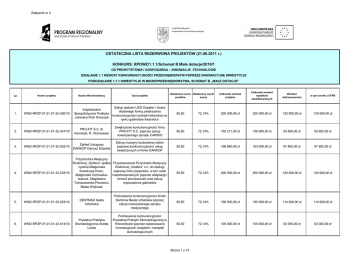 Załącznik nr 2 Urząd Marszałkowski Województwa Zachodniopomorskiego OSTATECZNA LISTA REZERWOWA PROJEKTÓW (21.06.2011 r.) KONKURS: RPOWZ/1.1.1/Schemat B Małe dotacje/2010/1 OŚ PRIORYTETOWA I GOSPODARKA – INNOWACJE -TECHNOLOGIE DZIAŁANIE 1.1 WZROST KONKURENCYJNOŚCI PRZEDSIĘBIORSTW POPRZEZ INNOWACYJNE INWESTYCJE PODDZIAŁANIE 1.1.1 INWESTYCJE W MIKROPRZEDSIĘBIORSTWA, SCHEMAT B „MAŁE DOTACJE” Lp. Całkowita wartość projektu Całkowita wartość wydatków kwalifikowalnych Wartość dofinansowania w tym środki z EFRR 72,14% 200 000,00 zł 200 000,00 zł 120 000,00 zł 120 000,00 zł 50,50 72,14% 192 211,00 zł 156 000,00 zł 93 600,00 zł 93 600,00 zł 50,50 72,14% 198 860,00 zł 163 000,00 zł 97 800,00 zł 97 800,00 zł 50,50 72,14% 200 000,00 zł 200 000,00 zł 120 000,00 zł 120 000,00 zł Ostateczna suma Ostateczny wynik punktów oceny Numer projektu Nazwa Wnioskodawcy Tytuł projektu 1. WND-RPZP.01.01.01-32-350/10 Indywidualna Specjalistyczna Praktyka Lekarska Piotr Smoczyk Zakup aparatu USG Doppler i lasera diodowego formą zwiększenia konkurencyjności praktyki lekarskiej na rynku gabinetów lekarskich 50,50 2. WND-RPZP.01.01.01-32-347/10 PRO-FIT S.C. B. Kamiński, R. Wiśniewski Zwiększenie konkurencyjności firmy PRO-FIT S.C. poprzez zakup nowoczesnego sprzętu CARDIO 3. WND-RPZP.01.01.01-32-052/10 Zakład Usługowy DARKOP Dariusz Strzelak Zakup maszyny budowlanej celem poprawy konkurencyjności usług świadczonych w firmie DARKOP 4. Przychodnia Medycyny Rodzinnej „Szafera” spółka Przystosowanie Przychodni Medycyny cywilna Małgorzata Rodzinnej „Szafera” s.c. do obsługi Kowalczyk-Kram, większej ilości pacjentów, w tym osób WND-RPZP.01.01.01-32-233/10 Małgorzata Ostrowska- niepełnosprawnych poprzez adaptację i Iwaniuk, Magdalena remont pomieszczeń oraz zakup Tomaszewska-Pacewicz, wyposaŜenia gabinetów Beata Wojtczak 5. 6. WND-RPZP.01.01.01-32-253/10 DENTMAX beata Urbańska Podniesienie konkurencyjności kliniki Dentmax Beata Urbańska poprzez zakup nowoczesnego sprzętu medycznego 50,50 72,14% 190 000,00 zł 190 000,00 zł 114 000,00 zł 114 000,00 zł WND-RPZP.01.01.01-32-014/10 Prywatna Praktyka Stomatologiczna Anetta Lubas Podniesienie konkurencyjności Prywatnej Praktyki Stomatologicznej w Wierzchowie poprzez zastosowanie innowacyjnych urządzeń i narzędzi stomatologicznych 50,50 72,14% 105 000,00 zł 105 000,00 zł 63 000,00 zł 63 000,00 zł Strona 1 z 13 WND-RPZP.01.01.01-32-509/10 Indywidualna specjalistyczna praktyka lekarska Jolanta Kosela Specjalista chorób oczu Podniesienie konkurencyjności gabinetu okulistycznego przez wyposaŜenie w innowacyjny sprzęt 50,00 71,43% 167 459,33 zł 167 459,33 zł 100 475,50 zł 100 475,50 zł 8. WND-RPZP.01.01.01-32-425/10 "Geodezja Informatyka Wycena Chojnacki & Przesmycki" Wioletta Chojnacka WdroŜenie innowacyjnej technologii pomiarowej oraz zakup środka transportu kluczem do wzrostu konkurencyjności firmy "Geodezja Informatyka Wycena Chojnacki&Przesmycki" Wioletta Chojnacka 50,00 71,43% 199 584,00 zł 163 293,00 zł 97 975,80 zł 97 975,80 zł 9. WND-RPZP.01.01.01-32-201/10 50,00 71,43% 69 540,00 zł 57 000,00 zł 34 200,00 zł 34 200,00 zł 7. Zwiększenie konkurencyjności firmy Eko-enea Korsak Jarosław Eko-enea poprzez zakup niezbędnych urządzeń WND-RPZP.01.01.01-32-131/10 INDYWIDUALNA PRAKTYKA STOMATOLOGICZNA SŁAWOMIR KLUZEK Nowoczesne metody diagnostyki i leczenia stomatologicznego, ze specjalizacją w dziedzinie chirurgii i implantologii- Indywidualna Praktyka Stomatologiczna Sławomir Kluzek 50,00 71,43% 200 000,00 zł 200 000,00 zł 120 000,00 zł 120 000,00 zł 11. WND-RPZP.01.01.01-32-468/10 Multimed NZOZ Ginekologiczno-PołoŜniczy Błasiński,Bukowiec,Sallou m Spółka z ograniczoną odpowiedzialnością Wzrost konkurencyjności przedsiębiorstwa poprzez zakup innowacyjnego ultrasonografu 50,00 71,43% 199 450,62 zł 199 450,62 zł 119 670,37 zł 119 670,37 zł 12. WND-RPZP.01.01.01-32-329/10 B&B PIOTR BOBA SPÓŁKA JAWNA Wzrost konkurencyjności poprzez unowocześnienie wyposaŜenia reklamowego 50,00 71,43% 199 200,38 zł 161 279,00 zł 96 767,40 zł 96 767,40 zł Indywidualna Podniesienie jakości usług w specjalistyczna praktyka Indywidualnej Specjalistycznej Praktyce lekarska dr hab. n. med. Lekarskiej GraŜyna Teresa Czaja-Bulsa GraŜyna Czaja-Bulsa , przez zakup specjalistycznego sprzętu specjalista pediatra, do kompleksowego wyposaŜenia specjalista alergolog, gabinetu specjalista gastroenterolog 50,00 71,43% 194 511,23 zł 194 511,23 zł 116 706,73 zł 116 706,73 zł 10. 13. WND-RPZP.01.01.01-32-106/10 14. WND-RPZP.01.01.01-32-394/10 Natango Halina Górajek Uruchomienie szkoły kształcenia Ŝeglarskiego celem zwiększenia konkurencyjności na rynku regionalnym 49,50 70,71% 198 616,00 zł 162 800,00 zł 97 680,00 zł 97 680,00 zł 15. WND-RPZP.01.01.01-32-168/10 Jovela Utworzenie "Szkoły Korepetycji & Akademii Językowej"(SK&AJ) 49,50 70,71% 104 200,00 zł 104 200,00 zł 62 520,00 zł 62 520,00 zł 16. Niepubliczny Zakład Opieki Zdrowotnej "LIDENT" Laser w stomatologii- nowoczesność i WND-RPZP.01.01.01-32-205/10 Gabinety Stomatologiczne precyzja w leczeniu stomatologicznym Izabella Ligocka 49,50 70,71% 170 824,00 zł 170 624,00 zł 102 370,00 zł 102 370,00 zł 49,50 70,71% 61 100,00 zł 61 100,00 zł 36 660,00 zł 36 660,00 zł 17. WND-RPZP.01.01.01-32-021/10 Indywidualna Specjalistyczna Praktyka Lekarska LipSil, dr n.med. Aleksandra Janicka Gabinet chirurgii twarzy i medycyny estetycznej LipSil Strona 2 z 13 18. WND-RPZP.01.01.01-32-010/10 Interior Design Studio Maciej Panek Podniesienie konkurencyjności pracowni architektonicznej Interior Design Studio Maciej Panek poprzez wdroŜenie nowoczesnego wyposaŜenia oraz specjalistycznego oprogramowania projektowego 19. WND-RPZP.01.01.01-32-369/10 AUTO-WEST-SZPITUN Zbigniew Szpitun WdroŜenie nowych usług w firmie AUTO-WEST-SZPITUN 49,00 70,00% 195 200,00 zł 160 000,00 zł 96 000,00 zł 96 000,00 zł 20. W