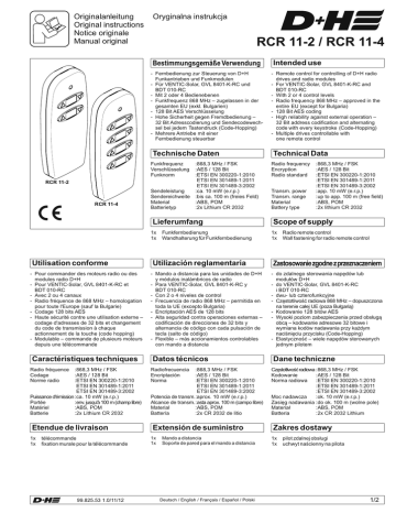 Originalanleitung Original instructions Notice originale Manual original Oryginalna instrukcja RCR 11-2 / RCR 11-4 Bestimmungsgemäße Verwendung - Fernbedienung zur Steuerung von D+H Funkantrieben und Funkmodulen - Für VENTIC-Solar, GVL 8401-K-RC und BDT 010-RC - Mit 2 oder 4 Bedienebenen - Funkfrequenz 868 MHz – zugelassen in der gesamten EU (exkl. Bulgarien) - 128 Bit AES Verschlüsselung - Hohe Sicherheit gegen Fremdbedienung – 32 Bit Adresscodierung und Sendecodewechsel bei jedem Tastendruck (Code-Hopping) - Mehrere Antriebe mit einer Fernbedienung steuerbar Technische Daten Funkfrequenz Verschlüsselung Funknorm RCR 11-2 RCR 11-4 :868,3 MHz / FSK :AES / 128 Bit :ETSI EN 300220-1:2010 ETSI EN 301489-1:2011 ETSI EN 301489-3:2002 Sendeleistung :ca. 10 mW (e.r.p.) Sendereichweite :bis ca. 100 m (freies Feld) Material :ABS, POM Batterietyp :2x Lithium CR 2032 Lieferumfang 1x 1x Utilisation conforme - Pour commander des moteurs radio ou des modules radio D+H - Pour VENTIC-Solar, GVL 8401-K-RC et BDT 010-RC - Avec 2 ou 4 canaux - Radio fréquence de 868 MHz – homologation pour toute l'Europe (sauf la Bulgarie) - Codage 128 bits AES - Haute sécurité contre une utilisation externe – codage d'adresses de 32 bits et changement du code de transmission à chaque actionnement de la touche (code hopping) - Modulable – commande de plusieurs moteurs depuis une télécommande Caractéristiques techniques Radio fréquence Codage Norme radio :868,3 MHz / FSK :AES / 128 Bit :ETSI EN 300220-1:2010 ETSI EN 301489-1:2011 ETSI EN 301489-3:2002 Puissance d'émission :ca. 10 mW (e.r.p.) Portée :env. jusqu'à 100 m (champ libre) Matériel :ABS, POM Batterie :2x Lithium CR 2032 Etendue de livraison 1x 1x télécommande fixation murale pour la télécommande 99.825.53 1.0/11/12 Funkfernbedienung Wandhalterung für Funkfernbedienung Utilización reglamentaria - Mando a distancia para las unidades de D+H y módulos inalámbricos de radio - Para VENTIC-Solar, GVL 8401-K-RC y BDT 010-RC - Con 2 o 4 niveles de control - Frecuencia de radio 868 MHz – permitida en toda la UE (excepto Bulgaria) - Encriptación AES de 128 bits - Alta seguridad contra operaciones externas – codificación de direcciones de 32 bits y alternancia de código con cada pulsación de tecla (salto de código) - Flexible – más accionamientos controlables con mando a distancia Datos técnicos Radiofrecuencia Encriptación Norma :868,3 MHz / FSK :AES / 128 Bit :ETSI EN 300220-1:2010 ETSI EN 301489-1:2011 ETSI EN 301489-3:2002 Potencia de transm.:aprox. 10 mW (e.r.p.) Alcance de transm.:asta aprox. 100 m (campo libre) Material :ABS, POM Battería :2x CR 2032 de litio Extensión de suministro 1x 1x Mando a distancia Soporte de pared para el mando a distancia Deutsch / English / Français / Español / Polski Intended use - Remote control for controlling of D+H radio drives and radio modules - For VENTIC-Solar, GVL 8401-K-RC and BDT 010-RC - With 2 or 4 control levels - Radio frequency 868 MHz – approved in the entire EU (except for Bulgaria) - 128 Bit AES coding - High reliability against external operation – 32 Bit address codification and alternating code with every keystroke (Code-Hopping) - Multiple drives controllable with one remote control Technical Data Radio frequency Encryption Radio standard Transm. power Transm. range Material Battery type :868,3 MHz / FSK :AES / 128 Bit :ETSI EN 300220-1:2010 :ETSI EN 301489-1:2011 :ETSI EN 301489-3:2002 :app. 10 mW (e.r.p.) :up to app. 100 m (free field) :ABS, POM :2x lithium CR 2032 Scope of supply 1x 1x Radio remote control Wall fastening for radio remote control Zastosowaniezgodnezprzeznaczeniem - do zdalnego sterowania napędów lub modułów D+H - do VENTIC-Solar, GVL 8401-K-RC i BDT 010-RC - dwu- lub czterofunkcyjne - Częstotliwość radiowa 868 MHz – dopuszczona na terenie całej UE (poza Bułgarią) - Kodowanie 128 bitów AES - Wysoki poziom zabezpieczenia przed obsługą obcą – kodowanie adresowe 32 bitowe i wymiana kodów nadawania przy każdym naciśnięciu przycisku (Code-Hopping) - Elastyczność – wiele napędów sterowanych jednym pilotem Dane techniczne Częstotliwość radiowa :868,3 MHz / FSK Kodowanie :AES / 128 Bit Norma radiowa :ETSI EN 300220-1:2010 :ETSI EN 301489-1:2011 :ETSI EN 301489-3:2002 Moc nadawcza :ok. 10 mW (e.r.p.) Zasięg nadawania :do ok. 100 m (wolne pole) Materiał :ABS, POM Batteria :2x CR 2032 Lithium Zakres dostawy 1x 1x pilot zdalnej obsługi uchwyt naścienny na pilota 1/2 Fernbedienung anlernen / Pairing remote control / Réglage de la télécommande / Programar el mando a distancia / Programowanie pilota Start VENTIC-Solar GVL 8401-K-RC BDT 010-RC SET / S1 Bedienung / Operation / Commande / Operación / Obsługa >5 Sec. 1 1 2 Le ve l 5 Sec. 5 Sec. >2 Sec. RCR 11 1 2 2 5 Sec. STOP Le ve l 5 Sec. RCR 11 VENTIC-Solar GVL 8401-K-RC BDT 010-RC Le ve l 3 1 5 Sec. 5 Sec. 2 RCR 11 VENTIC-Solar GVL 8401-K BDT 010-RC Jede Betätigung einer Taste wird mit einem Blinken der Sendeanzeige quittiert. Wenn nicht, ist die Batterie zu wechseln. / Every operation of a button will be acknowledged by a flashing of the transmitting LED. If not, replace the battery. / L'actionnement de la touche est confirmé par le clignotement de l'affichage de transmission. Sinon, remplacez la batterie. / Cada accionamiento de la tecla se confirma con un parpadeo del indicador de transmisión. Si no, la pila tiene que cambiarse. / Każde naciśnięcie przycisku jest potwierdzane mignięciem wskaźnika nadawania. Jeśli nie, należy wymienić baterię. Exit SET 1x Wandhalterung / Wall fastening / Fixation murale / Soporte de pared / Uchwytu naściennego C R 2 3V 03 2 C R 2 3V 03 2 Batteriewechsel / Battery replacement / Remplacement des piles / Sustitución de las pilas / Wymiana baterii Li 60mm 19mm m m 45 m m 11 0 80mm 67mm Tel.: +4940-605 65 239 Fax: +4940-605 65 254 E-Mail: [email protected] 15mm D+H Mechatronic AG Georg-Sasse-Str. 28-32 22949 Ammersbek, German