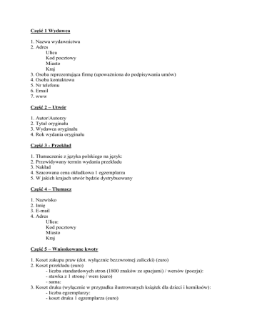 Część 1 Wydawca 1. Nazwa wydawnictwa 2. Adres Ulica Kod pocztowy Miasto Kraj 3. Osoba reprezentująca firmę (upoważniona do podpisywania umów) 4. Osoba kontaktowa 5. Nr telefonu 6. Email 7. www Część 2 – Utwór 1. Autor/Autorzy 2. Tytuł oryginału 3. Wydawca oryginału 4. Rok wydania oryginału Część 3 - Przekład 1. Tłumaczenie z języka polskiego na język: 2. Przewidywany termin wydania przekładu 3. Nakład 4. Szacowana cena okładkowa 1 egzemplarza 5. W jakich krajach utwór będzie dystrybuowany Część 4 – Tłumacz 1. Nazwisko 2. Imię 3. E-mail 4. Adres Ulica: Kod pocztowy Miasto Kraj Część 5 – Wnioskowane kwoty 1. Koszt zakupu praw (dot. wyłącznie bezzwrotnej zaliczki) (euro) 2. Koszt przekładu (euro) - liczba standardowych stron (1800 znaków ze spacjami) / wersów (poezja): - stawka z 1 stronę / wers (euro) - suma: 3. Koszt druku (wyłącznie w przypadku ilustrowanych książek dla dzieci i komiksów): - liczba egzemplarzy: - koszt druku 1 egzemplarza (euro) - całkowity koszt druku 4. Całkowita suma wnioskowana przez wydawcę - Kwota na zakup praw (euro) - Kwota na przekład (euro) - Kwota na druk (euro) - Suma (euro) 5. Inne źródła finansowania Nazwa instytucji/organizacji Kwota wsparcia (euro): Na jaki cel wsparcie będzie przeznaczone Część 6 – Dodatkowe informacje Część 7 - Załączniki Proszę załączyć kopię podpisanej umowy licencyjnej kopię podpisanej umowy z tłumaczem bibliografię tłumacza informacje o wydawcy (katalog wydawniczy, opis profilu itp.) opis dystrybucji i promocji utworu