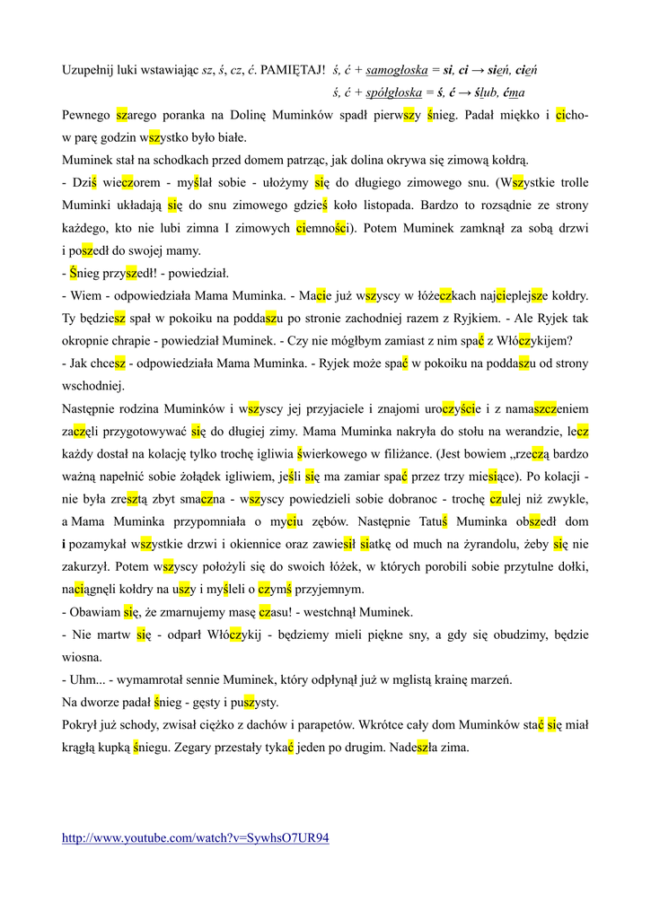 Uzupełnij luki wstawiając sz, ś, cz, ć. PAMIĘTAJ! ś, ć + samogłoska = si, ci → sień, cień ś, ć + spółgłoska = ś, ć → ślub, ćma Pewnego szarego poranka na Dolinę Muminków spadł pierwszy śnieg. Padał miękko i cichow parę godzin wszystko było białe. Muminek stał na schodkach przed domem patrząc, jak dolina okrywa się zimową kołdrą. - Dziś wieczorem - myślał sobie - ułożymy się do długiego zimowego snu. (Wszystkie trolle Muminki układają się do snu zimowego gdzieś koło listopada. Bardzo to rozsądnie ze strony każdego, kto nie lubi zimna I zimowych ciemności). Potem Muminek zamknął za sobą drzwi i poszedł do swojej mamy. - Śnieg przyszedł! - powiedział. - Wiem - odpowiedziała Mama Muminka. - Macie już wszyscy w łóżeczkach najcieplejsze kołdry. Ty będziesz spał w pokoiku na poddaszu po stronie zachodniej razem z Ryjkiem. - Ale Ryjek tak okropnie chrapie - powiedział Muminek. - Czy nie mógłbym zamiast z nim spać z Włóczykijem? - Jak chcesz - odpowiedziała Mama Muminka. - Ryjek może spać w pokoiku na poddaszu od strony wschodniej. Następnie rodzina Muminków i wszyscy jej przyjaciele i znajomi uroczyście i z namaszczeniem zaczęli przygotowywać się do długiej zimy. Mama Muminka nakryła do stołu na werandzie, lecz każdy dostał na kolację tylko trochę igliwia świerkowego w filiżance. (Jest bowiem „rzeczą bardzo ważną napełnić sobie żołądek igliwiem, jeśli się ma zamiar spać przez trzy miesiące). Po kolacji nie była zresztą zbyt smaczna - wszyscy powiedzieli sobie dobranoc - trochę czulej niż zwykle, a Mama Muminka przypomniała o myciu zębów. Następnie Tatuś Muminka obszedł dom i pozamykał wszystkie drzwi i okiennice oraz zawiesił siatkę od much na żyrandolu, żeby się nie zakurzył. Potem wszyscy położyli się do swoich łóżek, w których porobili sobie przytulne dołki, naciągnęli kołdry na uszy i myśleli o czymś przyjemnym. - Obawiam się, że zmarnujemy masę czasu! - westchnął Muminek. - Nie martw się - odparł Włóczykij - będziemy mieli piękne sny, a gdy się obudzimy, będzie wiosna. - Uhm... - wymamrotał sennie Muminek, który odpłynął już w mglistą krainę marzeń. Na dworze padał śnieg - gęsty i puszysty. Pokrył już schody, zwisał ciężko z dachów i parapetów. Wkrótce cały dom Muminków stać się miał krągłą kupką śniegu. Zegary przestały tykać jeden po drugim. Nadeszła zima. http://www.youtube.com/watch?v=SywhsO7UR94
