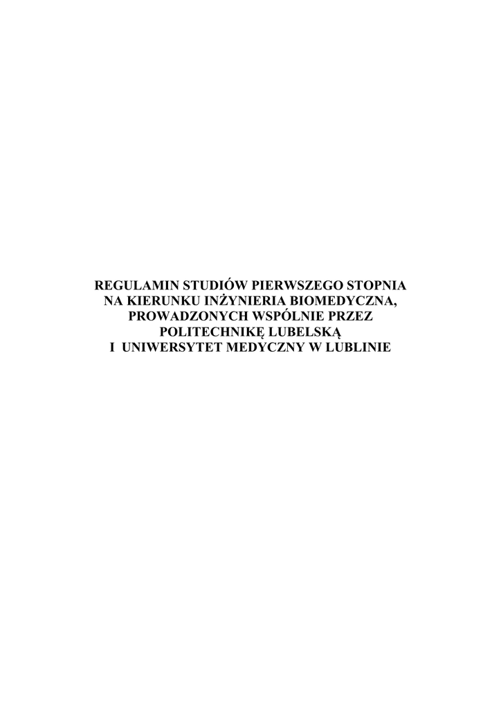 REGULAMIN STUDIÓW PIERWSZEGO STOPNIA NA KIERUNKU INŻYNIERIA BIOMEDYCZNA, PROWADZONYCH WSPÓLNIE PRZEZ POLITECHNIKĘ LUBELSKĄ I UNIWERSYTET MEDYCZNY W LUBLINIE I. PRZEPISY OGÓLNE § 1. Przepisy niniejszego Regulaminu mają zastosowanie do studiów pierwszego stopnia kierunku inżynieria biomedyczna, prowadzonych wspólnie przez Politechnikę Lubelską i Uniwersytet Medyczny w Lublinie, w formie studiów stacjonarnych i niestacjonarnych. § 2. Prawa i obowiązki studenta określa Ustawa z dnia 27 lipca 2005 r. Prawo o szkolnictwie wyższym, rozporządzenia wykonawcze do ustawy, postanowienia niniejszego Regulaminu i Regulaminu studiów obowiązujących w Politechnice Lubelskiej, stanowiącego załącznik do Uchwały Nr 14/2009/III Senatu PL z dnia 30 kwietnia 2009 r., o ile nie są sprzeczne z zapisami niniejszego Regulaminu. § 3. 1. Studia na kierunku inżynieria biomedyczna prowadzone są wspólnie przez Wydział Mechaniczny Politechniki Lubelskiej oraz I Wydział Lekarski z Oddziałem Stomatologicznym Uniwersytetu Medycznego w Lublinie, na podstawie porozumienia zawartego przez obie Uczelnie. 2. Wydział Mechaniczny Politechniki Lubelskiej jest jednostką wiodącą dla kierunku studiów inżynieria biomedyczna pod względem organizacji studiów, dokumentacji ich przebiegu, pomocy materialnej dla studentów i innych spraw związanych z tokiem studiów. § 4. 1. Studia niestacjonarne są studiami odpłatnymi na zasadach określonych w Uchwale Senatu Politechniki Lubelskiej w sprawie szczegółowych zasad pobierania opłat za świadczone usługi edukacyjne. 2. Warunki odpłatności za studia określa umowa zawarta między Politechniką Lubelską a studentem. § 5. Studia na kierunku inżynieria biomedyczna prowadzone są na podstawie planów studiów i programów nauczania uchwalanych przez Radę Wydziału Mechanicznego Politechniki Lubelskiej i Radę I Wydziału Lekarskiego z Oddziałem Stomatologicznym Uniwersytetu Medycznego w Lublinie. II. PRAWA I OBOWIĄZKI STUDENTÓW § 6. 1. W trakcie odbywania studiów student obowiązany jest w szczególności do: 1) przestrzegania przepisów obowiązujących w Politechnice Lubelskiej; 2) uczestniczenia w zajęciach dydaktycznych i organizacyjnych, składania egzaminów, odbywania praktyk oraz spełniania innych wymogów określonych w planie studiów i programie nauczania; 3) przestrzegania dobrych obyczajów wspólnoty akademickiej; 4) dbania o godność studenta i dobre imię obu Uczelni; 5) terminowego wnoszenia opłat na rzecz Politechniki Lubelskiej zgodnie z odrębnymi przepisami; 6) zapoznawania się z zarządzeniami, poleceniami i informacjami ogłaszanymi przez dziekana wydziału wiodącego i właściwego na nie reagowania. 2. Student obowiązany jest ponadto: 1) do przestrzegania przepisów obowiązujących w Uniwersytecie Medycznym w Lublinie, dotyczących uczestnictwa w zajęciach dydaktycznych prowadzonych na terenie tej Uczelni i szpitali klinicznych; 2) przed rozpoczęciem praktycznej nauki zawodu (zajęć praktycznych, praktyk zawodowych lub zajęć klinicznych), jednak nie później niż do 30 października danego roku akademickiego wykonać: − badania lekarskie i laboratoryjne dla celów sanitarno-epidemiologicznych, − szczepienie przeciw WZW typu B. § 7. 1. Student ma prawo do: 1) studiowania według indywidualnego planu studiów i programu nauczania; 2) studiowania według indywidualnej organizacji toku studiów; 3) zgłaszania do dziekana wydziału wiodącego postulatów dotyczących planów studiów, programów nauczania, toku studiów, procesu nauczania i wychowania, warunków socjalno-bytowych oraz wszystkich innych spraw środowiska akademickiego; 4) otrzymywania nagród i wyróżnień za dobre wyniki i osiągnięcia w nauce; 5) prowadzenia działalności samorządowej i społecznej; 6) zrzeszania się w kołach lub sekcjach naukowych oraz uczestniczenia w badaniach naukowych prowadzonych w obu Uczelniach; 7) zrzeszania się w organizacjach społecznych i politycznych na zasadach określonych w odrębnych przepisach; 8) zrzeszania się w organizacjach kulturalnych, sportowych i turystycznych; 9) wyrażania opinii o prowadzonych zajęciach i innych obowiązkach dydaktycznych poprzez: wypowiedzi przedstawicieli studentów w organach kolegialnych, udział w ankietach, udział w konkursach, itp. organizowanych przez obie Uczelnie. 2. Dla realizacji prawa do nauki oraz praw wyszczególnionych w ust. l student może korzystać z pomieszczeń, urządzeń i innych środków materialnych obu Uczelni oraz pomocy ze strony nauczycieli akademickich i organów Uczelni na zasadach określonych przez obowiązujące przepisy. § 8. 1. Studenci i rodziny studenckie (niepracujący współmałżonkowie oraz dzieci) mają prawo do: 1) opieki lekarskiej i ochrony zdrowia, na zasadach określonych w przepisach prawa; 2) pomocy materialnej, jeżeli spełniają warunki określone w odrębnych przepisach. 2. Studentom na kierunku inżynieria biomedyczna pomoc materialna przyznawana jest według zasad i na warunkach określonych w stosownym Regulaminie wydanym przez Politechnikę Lubelską. § 9. Student może ubiegać się o przeniesienie ze studiów stacjonarnych na studia niestacjonarne, a także odwrotnie na warunkach określonych przez dziekana wydziału wiodącego. § 10. 1. Dziekan wydziału wiodącego powołuje spośród nauczycieli akademickich opiekuna lat studiów. 2. Reprezentantem grupy studenckiej wobec władz i pracowników Uczelni jest starosta grupy, zaś roku – starosta roku. Ich zadania wynikają z Regulaminu Samorządu Studenckiego Politechniki Lubelskiej. § 11. Zasady odpowiedzialności dyscyplinarnej studentów oraz tryb postępowania dyscyplinarnego określają odrębne przepisy, a postępowanie to prowadzi Politechnika Lubelska. § 12. Student obowiązany jest powiadomić niezwłocznie dziekana wydziału wiodącego w formie pisemnej o zmianie kierunku studiów, rezygnacji ze studiów, o zmianie nazwiska, stanu 