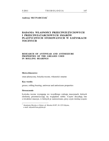 5-2011 TRIBOLOGIA 147 Andrzej MŁYNARCZAK* BADANIA WŁASNOŚCI PRZECIWZUŻYCIOWYCH I PRZECIWZATARCIOWYCH SMARÓW PLASTYCZNYCH STOSOWANYCH W ŁOŻYSKACH TOCZNYCH RESEARCH OF ANTIWEAR AND ANTISEIZURE PROPERTIES OF THE GREASES USED IN ROLLING BEARINGS Słowa kluczowe: smar plastyczny, łożyska toczne, własności smarne Key words: grease, rolling bearing, antiwear and antiseizure properties Streszczenie Łożyska toczne występują we wszelkiego rodzaju maszynach, których elementy przemieszczają się względem siebie. Często decydują one o trwałości maszyn, w których je zastosowano, przy czym istotną (często * Akademia Morska w Gdyni, ul. Morska 81/87, 81-225 Gdynia, e-mail: [email protected]. 148 TRIBOLOGIA 5-2011 niedocenianą) rolę odgrywa tutaj czynnik smarujący. Efektem oddziaływania medium smarującego (oleju lub smaru plastycznego) jest zmniejszenie oporów ruchu przemieszczających się względem siebie elementów oraz zmniejszenie ich zużycia. W większości przypadków łożyska toczne smarowane są smarami plastycznymi, co znacznie ułatwia lub całkowicie eliminuje obsługę, upraszcza konstrukcję i w konsekwencji obniża koszty eksploatacji. W praktyce przemysłowej stosowane są smary plastyczne różnych producentów. O ich przydatności w określonych warunkach pracy decydują takie cechy jak: konsystencja, zakres temperatur pracy, odporność na działanie wody oraz smarność. W artykule przedstawiono ogólną charakterystykę smarów plastycznych oraz porównawcze wyniki badań własności smarnych wybranych smarów stosowanych w łożyskach tocznych. Badania wykazały, że smary plastyczne Motor Life zdecydowanie polepszają własności smarne węzła tarcia, który tym samym jest zdolny przenosić większe obciążenia i temperatury. Zastosowanie smaru plastycznego o lepszych własnościach przeciwzużyciowych i przeciwzatarciowych może w trudnych warunkach pracy łożyska uchronić je przed zatarciem, a tym samym zwiększyć trwałość maszyny, w której łożysko to zostało zamontowane. WPROWADZENIE Łożyska toczne zwykle wykorzystywane są w konstrukcji podpór łożyskowych wałów maszyn wirnikowych, silników elektrycznych, przekładni zębatych i wałów śrubowych. Często decydują one o trwałości maszyn, w których je zastosowano, przy czym istotną (często niedocenianą) rolę odgrywa tutaj czynnik smarujący. Efektem oddziaływania medium smarującego (oleju lub smaru plastycznego) jest zmniejszenie oporów ruchu przemieszczających się względem siebie elementów oraz zmniejszenie ich zużycia. Czynniki smarujące przyczyniają się zatem do zwiększenia trwałości maszyn, gdyż wpływają w znacznym stopniu na trwałość stosowanych w nich łożysk tocznych. Na powierzchniach łożysk tocznych można niekiedy zaobserwować lokalne odbarwienia jako efekt przegrzania towarzyszącego zazwyczaj zacieraniu się łożyska spowodowanego niewłaściwym (zbyt małym lub zbyt dużym) luzem, niedostatecznym smarowaniem, niewspółosiowością pierścieni lub zanieczyszczeniami stałymi w czynniku smarującym. W walcowych łożyskach tocznych silników elektrycznych charakteryzujących się wysokim wskaźnikiem mocy niekiedy występuje problem zbyt 5-2011 TRIBOLOGIA 149 małego luzu roboczego łożyska. Sytuacja taka może mieć miejsce wtedy, gdy łożysko zostanie zmontowane z podzespołów, których odchyłki wykonawcze tworzą niekorzystny układ znacznie zmniejszający luz promieniowy łożyska zamontowanego (np. czop łożyskowy wału wykonany z górną odchyłką, a otwór komory łożyskowej wykonany z dolną odchyłką). Wodne chłodzenie tych silników kanałami umieszczonymi tylko w kadłubie powoduje, iż między pierścieniami wewnętrznym i zewnętrznym łożysk tocznych występuje duża różnica temperatur, która powoduje termiczne zmniejszanie się luzu roboczego łożysk. Jeżeli sytuacja taka dotyczy silnika, w którym zamontowano łożyska z opisanym wyżej niekorzystnym układem odchyłek wymiarowych podzespołów, to rzeczywisty luz łożyska w temperaturze pracy może być bliski zeru. Dla łożysk walcowych skutkuje to zwykle zatarciem i w konsekwencji unieruchomieniem silnika elektrycznego. W tych szczególnych warunkach pracy łożyska istotną rolę ma do spełnienia czynnik smarujący charakteryzujący się odpowiednimi własnościami przeciwzużyciowymi i przeciwzatarciowymi. W artykule przedstawiono porównawcze wyniki badań własności przeciwzużyciowych i przeciwzatarciowych dwóch grup smarów plastycznych stosowanych w łożyskach tocznych. Grupa pierwsza obejmowała smary plastyczne zalecane przez producentów silników elektrycznych, natomiast w skład grupy drugiej wchodziły smary ogólnego stosowania. SKŁAD I BUDOWA SMARÓW PLASTYCZNYCH Z chemicznego punktu widzenia smary plastyczne są to układy koloidalne, w których fazą rozpraszającą jest olej, a fazą rozproszoną zagęszczacz. Smary plastyczne zawierają zwykle od 70 do 90% fazy ciekłej (oleju bazowego). Jako oleje bazowe stosuje się najczęściej następujące rodzaje substancji: oleje mineralne, oleje syntetyczne węglowodorowe, oleje poliglikolowe, syntetyczne estry, oleje silikonowe, tłuszcze roślinne i zwierzęce oraz estry kwasów tłuszczowych i alkoholi monowodorotlenowych lub wielowodorotlenowych (smary biodegradowalne), estry polifenylowe, chlorofluorowęglowodory i in. Mikroskopowy obraz smaru plastycznego przypomina gąbkę nasyconą cieczą. W tym wyobrażeniu gąbkę stanowi zagęszczacz, który tworzy elastyczną, przestrzenną strukturę sieciową wiążącą fazę ciekłą. Najczęściej stosowanym zagęszczaczem są sole (mydła) wyższych kwasów tłuszczowych takich metali, jak 150 TRIBOLOGIA 5-2011 wapń, sód, potas, lit, ołów i glin. Stosowane są również substancje inne niż mydła, np.: woski, stałe węglowodory, polimery, bentonity, hydrolizowana krzemionka i in. Oprócz wymienionych wyżej składników sma