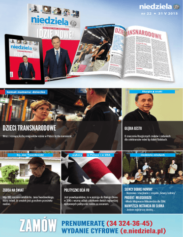 niedziela T Y G O D N nr 22 K DZIECI TRANSNARODOWE K liturgia temat numeru: dziecko A T O L I C K 31 V 2015 znaki O znaczeniu liturgicznych znaków i zadaniach dla celebransów mówi bp Adam Bałabuch. wybory w Polsce i w USA niedziela mlodych ZGODA NA ŚWIAT POLITYCZNE DÉJÁ VU SIEWCY DOBREJ NOWINY Mija 100. rocznica urodzin ks. Jana Twardowskiego, który mówił, że smutek jest grzechem przeciwko nadziei. Jest prawdopodobne, że w wyścigu do Białego Domu w 2016 r. wezmą udział członkowie dwóch najbardziej wpływowych politycznie rodzin za oceanem. PROJEKT: MIŁOSIERDZIE – Rozmowa z muzykami z zespołu „Siewcy Lednicy”. –Młodzi Misjonarze Miłosierdzia dla ŚDM. NAJWYŻSZA INSTANCJA OD SŁOIKA – Jestem najstarszą siostrą… ZAMÓW I GŁĘBIA GESTU Wraz z rosnącą liczbą emigrantów rośnie w Polsce liczba eurosierot. ks. Jan Twardowski I PRENUMERATĘ (34 324-36-45) WYDANIE CYFROWE (e.niedziela.pl) Zapraszamy do lektury 22. numeru „Niedzieli” na 31 maja 2015 r. Proponujemy m.in. artykuły: Głębia gestu O znaczeniu liturgicznych znaków i zadaniach dla celebransów mówi bp Adam Bałabuch. Zgoda na świat Mija 100. rocznica urodzin ks. Jana Twardowskiego, który mówił, że smutek jest grzechem przeciwko nadziei. Dzieci transnarodowe Wraz z rosnącą liczbą emigrantów rośnie w Polsce liczba eurosierot. Polityczne déjá vu Jest prawdopodobne, że w wyścigu do Białego Domu w 2016 r. wezmą udział członkowie dwóch najbardziej wpływowych politycznie rodzin za oceanem. Czy w małżeństwie jest jak w zakonie? Jezus jest nauczycielem i mistrzem dialogu małżeńskiego. Jan od...perkusji Rzeszowski koncert „Jednego Serca, Jednego Ducha” jest autorskim pomysłem Jana Budziaszka, znanego perkusisty i rekolekcjonisty. W „Niedzieli Młodych”: * SIEWCY DOBREJ NOWINY – Rozmowa z muzykami z zespołu „Siewcy Lednicy”. * PROJEKT: MIŁOSIERDZIE – Młodzi Misjonarze Miłosierdzia dla ŚDM. * NAJWYŻSZA INSTANCJA OD SŁOIKA – Jestem najstarszą siostrą…