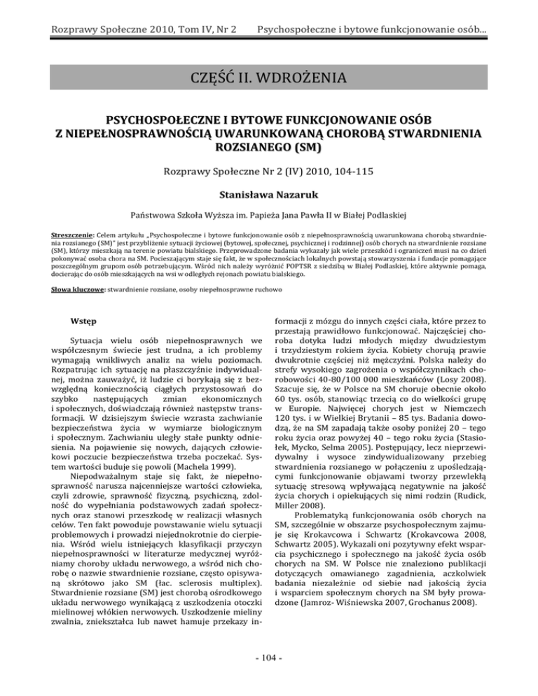 Rozprawy Społeczne 2010, Tom IV, Nr 2 Psychospołeczne i bytowe funkcjonowanie osób... CZĘŚĆ II. WDROŻENIA PSYCHOSPOŁECZNE I BYTOWE FUNKCJONOWANIE OSÓB Z NIEPEŁNOSPRAWNOŚCIĄ UWARUNKOWANĄ CHOROBĄ STWARDNIENIA ROZSIANEGO (SM) Rozprawy Społeczne Nr 2 (IV) 2010, 104-115 Stanisława Nazaruk Państwowa Szkoła Wyższa im. Papieża Jana Pawła II w Białej Podlaskiej Streszczenie: Celem artykułu ,,Psychospołeczne i bytowe funkcjonowanie osób z niepełnosprawnością uwarunkowana chorobą stwardnienia rozsianego (SM)” jest przybliżenie sytuacji życiowej (bytowej, społecznej, psychicznej i rodzinnej) osób chorych na stwardnienie rozsiane (SM), którzy mieszkają na terenie powiatu bialskiego. Przeprowadzone badania wykazały jak wiele przeszkód i ograniczeń musi na co dzień pokonywać osoba chora na SM. Pocieszającym staje się fakt, że w społecznościach lokalnych powstają stowarzyszenia i fundacje pomagające poszczególnym grupom osób potrzebującym. Wśród nich należy wyróżnić POPTSR z siedzibą w Białej Podlaskiej, które aktywnie pomaga, docierając do osób mieszkających na wsi w odległych rejonach powiatu bialskiego. Słowa kluczowe: stwardnienie rozsiane, osoby niepełnosprawne ruchowo Wstęp Sytuacja wielu osób niepełnosprawnych we współczesnym świecie jest trudna, a ich problemy wymagają wnikliwych analiz na wielu poziomach. Rozpatrując ich sytuację na płaszczyźnie indywidualnej, można zauważyć, iż ludzie ci borykają się z bezwzględną koniecznością ciągłych przystosowań do szybko następujących zmian ekonomicznych i społecznych, doświadczają również następstw transformacji. W dzisiejszym świecie wzrasta zachwianie bezpieczeństwa życia w wymiarze biologicznym i społecznym. Zachwianiu uległy stałe punkty odniesienia. Na pojawienie się nowych, dających człowiekowi poczucie bezpieczeństwa trzeba poczekać. System wartości buduje się powoli (Machela 1999). Niepodważalnym staje się fakt, że niepełnosprawność narusza najcenniejsze wartości człowieka, czyli zdrowie, sprawność fizyczną, psychiczną, zdolność do wypełniania podstawowych zadań społecznych oraz stanowi przeszkodę w realizacji własnych celów. Ten fakt powoduje powstawanie wielu sytuacji problemowych i prowadzi niejednokrotnie do cierpienia. Wśród wielu istniejących klasyfikacji przyczyn niepełnosprawności w literaturze medycznej wyróżniamy choroby układu nerwowego, a wśród nich chorobę o nazwie stwardnienie rozsiane, często opisywaną skrótowo jako SM (łac. sclerosis multiplex). Stwardnienie rozsiane (SM) jest chorobą ośrodkowego układu nerwowego wynikającą z uszkodzenia otoczki mielinowej włókien nerwowych. Uszkodzenie mieliny zwalnia, zniekształca lub nawet hamuje przekazy in- formacji z mózgu do innych części ciała, które przez to przestają prawidłowo funkcjonować. Najczęściej choroba dotyka ludzi młodych między dwudziestym i trzydziestym rokiem życia. Kobiety chorują prawie dwukrotnie częściej niż mężczyźni. Polska należy do strefy wysokiego zagrożenia o współczynnikach chorobowości 40-80/100 000 mieszkańców (Losy 2008). Szacuje się, że w Polsce na SM choruje obecnie około 60 tys. osób, stanowiąc trzecią co do wielkości grupę w Europie. Najwięcej chorych jest w Niemczech 120 tys. i w Wielkiej Brytanii – 85 tys. Badania dowodzą, że na SM zapadają także osoby poniżej 20 – tego roku życia oraz powyżej 40 – tego roku życia (Stasiołek, Mycko, Selma 2005). Postępujący, lecz nieprzewidywalny i wysoce zindywidualizowany przebieg stwardnienia rozsianego w połączeniu z upośledzającymi funkcjonowanie objawami tworzy przewlekłą sytuację stresową wpływającą negatywnie na jakość życia chorych i opiekujących się nimi rodzin (Rudick, Miller 2008). Problematyką funkcjonowania osób chorych na SM, szczególnie w obszarze psychospołecznym zajmuje się Krokavcowa i Schwartz (Krokavcowa 2008, Schwartz 2005). Wykazali oni pozytywny efekt wsparcia psychicznego i społecznego na jakość życia osób chorych na SM. W Polsce nie znaleziono publikacji dotyczących omawianego zagadnienia, aczkolwiek badania niezależnie od siebie nad jakością życia i wsparciem społecznym chorych na SM były prowadzone (Jamroz- Wiśniewska 2007, Grochanus 2008). - 104 - Rozprawy Społeczne 2010, Tom IV, Nr 2 Psychospołeczne i bytowe funkcjonowanie osób... Zamierzeniem niniejszego opracowania jest przybliżenie wyników badań przeprowadzonych wśród osób chorych na SM ze szczególnym ukierunkowaniem na poznanie ograniczeń i niezbędnych form pomocy, które usprawnią życie wymienionym osobom. Cel badań Poznanie funkcjonowania osób z niepełnosprawnością uwarunkowaną chorobą SM w ich codziennym życiu, zdiagnozowanie ograniczeń, oczekiwań i możliwości pomocy. Problemy badawcze 1. Jakie zmiany nastąpiły w życiu u osób po zdiagnozowaniu u nich choroby SM? 2. Jak osoby chore na SM funkcjonują w rodzinie i najbliższym środowisku? 3. W jaki sposób osoby z niepełnosprawnością ruchową radzą sobie w pokonywaniu barier? 4. Z jakich form pomocy korzystają a jakich oczekują i od kogo? 5. Jakie mają wyobrażenia o swojej przyszłości osoby chore na SM? Materiał i metody badań Badania przeprowadzono w lipcu i sierpniu 2008 roku podczas turnusów rehabilitacyjnych zorganizowanych przez Podlaski Oddział Polskiego Towarzystwa Stwardnienia Rozsianego – organizacji zrzeszającej osoby chore na SM z siedzibą w Białej Podlaskiej. Ze względu na charakter i problematykę badań (empiryczno-eksploracyjne) w badaniach zastosowano metodę sondażu diagnostycznego i analizy dokumentów. Kwestionariusz ankiety skierowano do osób chorych na SM w celu zdiagnozowania ich sytuacji (w wymiarze społeczno- psychologicznym, bytowym, rodzinnym i in.,) zrzeszonych w Podlaskim Oddziale PTSR. Pytania w kwestionariuszu pogrupowano w 6 obszarów o tematyce przedstawionej w szcz