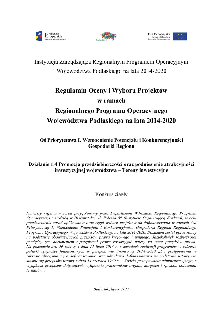 Instytucja Zarządzająca Regionalnym Programem Operacyjnym Województwa Podlaskiego na lata 2014-2020 Regulamin Oceny i Wyboru Projektów w ramach Regionalnego Programu Operacyjnego Województwa Podlaskiego na lata 2014-2020 Oś Priorytetowa I. Wzmocnienie Potencjału i Konkurencyjności Gospodarki Regionu Działanie 1.4 Promocja przedsiębiorczości oraz podniesienie atrakcyjności inwestycyjnej województwa – Tereny inwestycyjne Konkurs ciągły Niniejszy regulamin został przygotowany przez Departament Wdrażania Regionalnego Programu Operacyjnego z siedzibą w Białymstoku, ul. Poleska 89 (Instytucję Organizującą Konkurs), w celu przedstawienia zasad aplikowania oraz reguł wyboru projektów do dofinansowania w ramach Osi Priorytetowej I. Wzmocnienie Potencjału i Konkurencyjności Gospodarki Regionu Regionalnego Programu Operacyjnego Województwa Podlaskiego na lata 2014-2020. Dokument został opracowany na podstawie obowiązujących przepisów prawa krajowego i unijnego. Jakiekolwiek rozbieżności pomiędzy tym dokumentem a przepisami prawa rozstrzygać należy na rzecz przepisów prawa. Na podstawie art. 50 ustawy z dnia 11 lipca 2014 r. o zasadach realizacji programów w zakresie polityki spójności finansowanych w perspektywie finansowej 2014–2020 „Do postępowania w zakresie ubiegania się o dofinansowanie oraz udzielania dofinansowania na podstawie ustawy nie stosuje się przepisów ustawy z dnia 14 czerwca 1960 r. – Kodeks postępowania administracyjnego, z wyjątkiem przepisów dotyczących wyłączenia pracowników organu, doręczeń i sposobu obliczania terminów”. Białystok, lipiec 2015 ZAWARTOŚĆ REGULAMINU Spis treści 1. PODSTAWY PRAWNE ....................................................................................................... 3 2. PRZEDMIOT KONKURSU ................................................................................................ 5 3. BUDŻET DZIAŁANIA I KONKURSU .............................................................................. 7 4. WARTOŚCI PROJEKTÓW ................................................................................................ 7 5. KWOTA I POZIOM DOFINANSOWANIA ORAZ WKŁAD WŁASNY BENEFICJENTA ................................................................................................................ 8 6. POMOC PUBLICZNA ........................................................................................................ 8 7. FORMA KONKURSU ......................................................................................................... 9 8. PROCES WYBORU PROJEKTÓW ................................................................................... 9 9. TERMIN, MIEJSCE I FORMA SKŁADANIA WNIOSKÓW O DOFINANSOWANIE 9 10. ZASADY PRZYGOTOWANIA I WYPEŁNIENIA WNIOSKU O DOFINANSOWANIE PROJEKTU........................................................................................................................ 11 11. WERYFIKACJA WYMOGÓW FORMALNYCH WE WNIOSKU O DOFINANSOWANIE ORAZ SPOSÓB UZUPEŁNIANIA BRAKÓW FORMALNYCH I POPRAWY OCZYWISTYCH OMYŁEK. ...................................................................... 12 11. OCENA WNIOSKÓW O DOFINANSOWANIE I OGŁOSZENIE WYNIKÓW KONKURSU ...................................................................................................................... 14 12. ROZSTRZYGNIĘCIE KONKURSU I WYBÓR PROJEKTÓW DO DOFINANSOWANIA ....................................................................................................... 15 13. PODPISANIE UMOWY O UDZIELENIE WSPARCIA ................................................. 15 14. PROCEDURA ODWOŁAWCZA ...................................................................................... 17 15. WYDATKI KWALIFIKUJĄCE SIĘ DO DOFINANSOWANIA .................................... 21 16. OGÓLNE ZASADY PROMOCJI PROJEKTÓW FINANSOWANYCH ZE ŚRODKÓW EUROPEJSKIEGO FUNDUSZU ROZWOJU REGIONALNEGO W RAMACH REGIONALNEGO PROGRAMU OPERACYJNEGO WOJEWÓDZTWA PODLASKIEGO NA LATA 2014-2020 ............................................................................ 23 17. INNE UWAGI .................................................................................................................... 23 18. ELEMENTY DOKUMENTACJI KONKURSOWEJ ....................................................... 24 1. Podstawy prawne Akty prawa UE: Rozporządzenie Parlamentu Europejskiego i Rady (UE) nr 1301/2013 z dnia 17 grudnia 2013 r. w sprawie Europejskiego Funduszu Rozwoju Regionalnego i przepisów szczególnych dotyczących celu „Inwestycje na rzecz wzrostu i zatrudnienia” oraz w sprawie uchylenia rozporządzenia (WE) nr 1080/2006 (Dz. Urz. UE z 20.12.2013 r., Nr L 347/289); Rozporządzenie Parlamentu Europejskiego i Rady (UE) nr 1303/2013 z dnia 17 grudnia 2013 r. ustanawiające wspólne przepisy dotyczące Europejskiego Funduszu Rozwoju Regionalnego, Europejskiego Funduszu Społecznego, Funduszu Spójności, Europejskiego Funduszu Rolnego na rzecz Rozwoju Obszarów Wiejskich oraz Europejskiego Funduszu Morskiego i Rybackiego oraz ustanawiające przepisy ogólne dotyczące Europejskiego Funduszu Rozwoju Regionalnego, Europejskiego Funduszu Społecznego, Funduszu Spójności i Europejskiego Funduszu Morskiego i Rybackiego oraz uchylające rozporządzenie Rady (WE) nr 1083/2006 (Dz. Urz. UE z 20.12.2013 r., Nr L 347/320 z późn. zm.); Rozporządzenie Parlamentu Europejskiego i Rady (UE) nr 1300/2013 z dnia 17 grudnia 2013 r. w sprawie Funduszu Spójności i uchylającego rozporządzenie (WE) 1084/2006 (Dz. Urz. UE z 20.12.2013 r., Nr L 347/281); Rozporządzenie Parlamentu Europejskiego i Rady (UE, EURATOM) nr 966/2012 z dnia 25.10.2012 r. w sprawie zasad finansowych mających zastosowanie do budżetu ogólnego Unii oraz uchylające rozporządzenie Rady (WE, Euratom) nr 1605/2002 (Dz. Urz. UE z 26.10.2012 r., Nr L 298/1 z późn. zm.); Dyrektywa nr 2003/4/WE Parlamentu Europejskiego i Rady z dnia 28 stycz