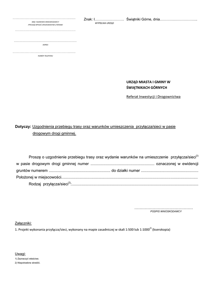 …………………………………………………………............ IMIĘ I NAZWISKO WNIOSKODAWCY /PROSZĘ WPISAĆ DRUKOWANYMI LITERAMI/ Znak: I…………………….. Świątniki Górne, dnia………………………….. WYPEŁNIA URZĄD ……………………………………………………………………. ........................................................................................... ADRES ………………………………….….…………………….......... NUMER TELEFONU URZĄD MIASTA I GMINY W ŚWIĄTNIKACH GÓRNYCH Referat Inwestycji i Drogownictwa Dotyczy: Uzgodnienia przebiegu trasy oraz warunków umieszczenia przyłącza/sieci w pasie drogowym drogi gminnej. Proszę o uzgodnienie przebiegu trasy oraz wydanie warunków na umieszczenie przyłącza/sieci2) w pasie drogowym drogi gminnej numer ........................................................... oznaczonej w ewidencji gruntów numerem ......................................................... do działki numer ..................................................... Położonej w miejscowości.............................................................................................................................. Rodzaj przyłącza/sieci2):..................................................................................................................... ……………………………………… PODPIS WNIOSKODAWCY Załączniki: 2) 1. Projekt wykonania przyłącza/sieci, wykonany na mapie zasadniczej w skali 1:500 lub 1:1000 (kserokopia) Uwagi: 1) Zaznaczyć właściwe. 2) Niepotrzebne skreślić.