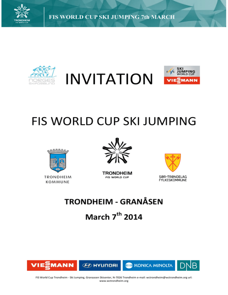 FIS WORLD CUP SKI JUMPING 7th MARCH INVITATION FIS WORLD CUP SKI JUMPING TRONDHEIM - GRANÅSEN March 7th 2014 FIS World Cup Trondheim - Ski Jumping, Granaasen Skisenter, N-7026 Trondheim e-mail: [email protected] url: www.wctrondheim.org FIS WORLD CUP SKI JUMPING 7th MARCH On behalf of the International Ski Federation, the Norwegian Ski Association and the Organizing Committee of FIS World Cup Ski Jumping, in Granåsen, Trondheim, we have the pleasure of inviting all Member Associations of the International Ski Federation (FIS) to participate in: FIS WORLD CUP SKI JUMPING Granåsen, Trondheim 07th March 2014 FIS World Cup Trondheim - Ski Jumping, Granaasen Skisenter, N-7026 Trondheim e-mail: [email protected] url: www.wctrondheim.org FIS WORLD CUP SKI JUMPING 7th MARCH PROGRAMME Thursday March 06th 09:00 Team Captains meeting at Rica Nidelven Hotel 16:00 Official Training 18:00 Qualification Friday March 07th 15:45 Trial round 16:45 First round Prize giving ceremony will be right after the competition FIS World Cup Trondheim - Ski Jumping, Granaasen Skisenter, N-7026 Trondheim e-mail: [email protected] url: www.wctrondheim.org FIS WORLD CUP SKI JUMPING 7th MARCH Competition Management / jury FIS Race Director Walter Hofer (FIS) Technical Delegate FIS Sandro Pertile (ITA) Assistant Technical Delegate FIS Peter Knoll (GER) Chief of Competition Hroar Stjernen (NOR) FIS Assistant Race Director Miran Tepeš (FIS) Equipment Control Sepp Gratzer (FIS) Jumping Judges Inge Eriksrød (NOR) Johann Bachmayer (AUT) Mika Jukkara (FIN) Jörg Schmeider (GER) Jost Bojan (SLO) FIS World Cup Trondheim - Ski Jumping, Granaasen Skisenter, N-7026 Trondheim e-mail: [email protected] url: www.wctrondheim.org FIS WORLD CUP SKI JUMPING 7th MARCH Organization The organizer World Cup Trondheim - Ski Jumping Granåsen Skisenter Arenabygg Langrenn N-7026 Trondheim Tel: +47 91824644 Fax: +47 72844972 E-mail: [email protected] URL: www.wctrondheim.org Location of the event Granåsen Ski Centre - 10 km south of Trondheim Entries by FIS Online Entry System The entries and accommodation reservations must be done by FIS online Entry System on www.fis-ski.com. Deadline for preliminary entries is 10th of February 2014. Deadline for final numbers, arrival/departure information and transportation is 24rd of February 2014. In case of late entries, we unfortunately can’t be able to guarantee all services according to Rules. Participation The number of participants in the competitions must comply with official FIS competition rules and regulations. Insurance All athletes have to be insured through their national ski federations. The organizer is not responsible for any personal injuries or damage to property that might occur. FIS World Cup Trondheim - Ski Jumping, Granaasen Skisenter, N-7026 Trondheim e-mail: [email protected] url: www.wctrondheim.org FIS WORLD CUP SKI JUMPING 7th MARCH All participants must have an adequate insurance cover against accidents, illness and civil liability Accommodation The Organizers´payment of costs for the athletes will be according to FIS Rules. In case of less competitors and officials than entered, no-show has to be paid. Please fill in the information in FIS online entry system. Hotels Teams and officials will be located at: Rica Nidelven Hotel Havnegt. 1-3 NO-7400 Trondheim Tlf: +47 73568000, Fax: +47 73568001 E-mail: [email protected] Press/media We don’t have an official press hotel, but please don’t hesitate to contact us at [email protected] if you need accommodation. Economy The organizer covers the accommodation for the athletes and their officials according to the FIS Rules. All other financial conditions are according to the FIS Rules and regulations. The prize-money and travel-money will be transferred electronically to bank account Doping Control Doping control may be carried out at any FIS competition according to FIS Anti-Doping Rules. Competition rules The competitions will be held in compliance with FIS Competition Rules. FIS World Cup Trondheim - Ski Jumping, Granaasen Skisenter, N-7026 Trondheim e-mail: [email protected] url: www.wctrondheim.org FIS WORLD CUP SKI JUMPING 7th MARCH Charter flight In cooperation with the OC in Kuopio we will organize a charter flight from Kuopio to Trondheim. The price will be EUR 395,- . Registration form for the flight is attached. Please fill in the form and send it by email to [email protected] no later than 10th of February . FIS officials and the athletes will have 1st priority. We need at least 80 persons to go through with the arrangement. If there’s not enough passengers on the flight, we reserve the right to cancel the flight due too financial reasons Transport service We offer free transportation during your stay in Trondheim and Granåsen, including pick-up and delivery service at the airport. Please give as detailed information as possible around your travel plans and needs for transportation during your stay in Trondheim in the FIS online entry system. Race Office Race office will be at Rica Nidelven Hotel Opening Times: Wednesday March 5th 10:00 - 22:00 Thursday March 6th 08:00 - 22:00 Friday March 7th 08:00 - 22:00 Saturday March 8th 08:00 - 12:00 email to: [email protected] Website: http://www.wctrondheim.org Team Captains Meeting Thursday March 6th 09:00 - Rica Nidelven Hotel SKI WAXING and SERVICE AREA There will be no ski-waxing rooms available at the hotel. Ski wax cabins will be located at the team area at the hill. FIS World Cup Trondheim - Ski Jumping, Granaasen Skisenter, N-7026 Trondheim e-mail: [email protected] url: www.wctrondheim.org FIS WORLD CUP SKI JUMPING 7th MARCH We hope to provide you with all the necessary information on the event. Should you have any further question do not hesitate to get back to us. FIS World Cup Trondheim - Ski Jumping, Granaasen Skisenter, N-7026 Trondheim e-mail: [email protected] url: www.wctrondheim.org