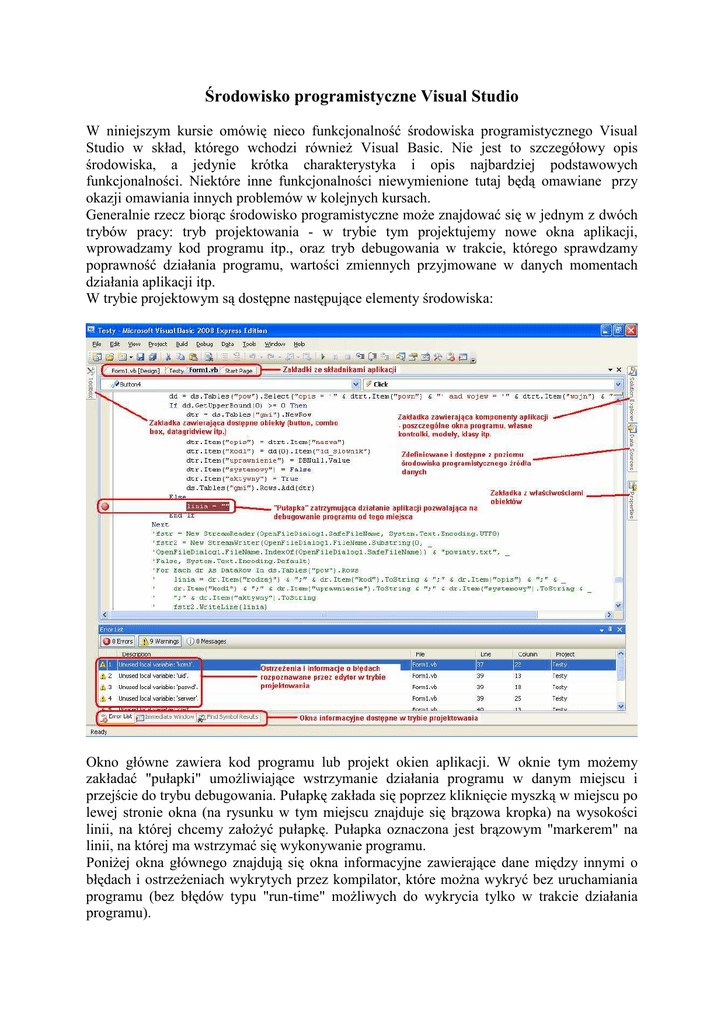 Środowisko programistyczne Visual Studio W niniejszym kursie omówię nieco funkcjonalność środowiska programistycznego Visual Studio w skład, którego wchodzi równieŜ Visual Basic. Nie jest to szczegółowy opis środowiska, a jedynie krótka charakterystyka i opis najbardziej podstawowych funkcjonalności. Niektóre inne funkcjonalności niewymienione tutaj będą omawiane przy okazji omawiania innych problemów w kolejnych kursach. Generalnie rzecz biorąc środowisko programistyczne moŜe znajdować się w jednym z dwóch trybów pracy: tryb projektowania - w trybie tym projektujemy nowe okna aplikacji, wprowadzamy kod programu itp., oraz tryb debugowania w trakcie, którego sprawdzamy poprawność działania programu, wartości zmiennych przyjmowane w danych momentach działania aplikacji itp. W trybie projektowym są dostępne następujące elementy środowiska: Okno główne zawiera kod programu lub projekt okien aplikacji. W oknie tym moŜemy zakładać "pułapki" umoŜliwiające wstrzymanie działania programu w danym miejscu i przejście do trybu debugowania. Pułapkę zakłada się poprzez kliknięcie myszką w miejscu po lewej stronie okna (na rysunku w tym miejscu znajduje się brązowa kropka) na wysokości linii, na której chcemy załoŜyć pułapkę. Pułapka oznaczona jest brązowym "markerem" na linii, na której ma wstrzymać się wykonywanie programu. PoniŜej okna głównego znajdują się okna informacyjne zawierające dane między innymi o błędach i ostrzeŜeniach wykrytych przez kompilator, które moŜna wykryć bez uruchamiania programu (bez błędów typu "run-time" moŜliwych do wykrycia tylko w trakcie działania programu). Po lewej stronie okna głównego znajduje się zakładka "Toolbox" zawierająca komponenty uŜyteczne do projektowania okien aplikacji takie jak przyciski, róŜnego rodzaju listy, tabele itp. Po stronie prawej znajdują się zakładki "Solution Explorer" zawierająca wszystkie składniki aplikacji takie jak projekty okien, kontrolek uŜytkownika, moduły i klasy wraz z kodami obsługującymi te składniki. Zakładka "Properties" zawierająca właściwości poszczególnych komponentów okien jak równieŜ właściwości samych okien. W zakładce tej dostępne są między innymi takie właściwości jak: rozmiar, połoŜenie, uŜywana czcionka, kolory tła i inne określające zachowanie się danej kontrolki i dostępne dla niej róŜnego rodzaju wartości. Zakładka "Data Sources" zawiera zdefiniowane na etapie projektowania aplikacji dostępne źródła danych. Tryb debugowania dostępny jest w sytuacji gdy następuje wstrzymanie działania programu na skutek napotkania "pułapki" lub błędu typu "run-time" i w trybie tym dostępne są następujące elementy: Okno główne identyczne jak w trybie projektowania. W oknie tym Ŝółtym "markerem" zaznaczona jest linia, która będzie wykonana w najbliŜszym kroku wykonywania programu. Cenną właściwością jest to, Ŝe linię tę moŜna przesuwać z powrotem do linii, które juŜ się wykonały, aby powtórzyć wykonywanie programu od linii, które wykonały się wcześniej, ale chcemy ponownie wykonać tę część programu np. po zmianie kodu lub zmianie wartości zmiennej, aby sprawdzić jak zachowa się program po tych zmianach. Aby przesunąć tą linię naleŜy ustawić kursor na Ŝółtej strzałce po lewej stronie i przy wciśniętym lewym przycisku myszy przesunąć ją w miejsce, od którego chcemy zacząć ponownie wykonywać program. W trybie debugowania (czyli w trakcie wykonywania się programu "krokowo") moŜemy dokonywać modyfikacji kodu programu (ale nie wyglądu okien i ich właściwości) oraz dokonywać zmiany wartości zmiennych w oknie informacyjnym (choć w niektórych rzadkich przypadkach jest to niemoŜliwe). PoniŜej okna głównego znajdują się zakładki informacyjne: "Locals" zawierająca wartości zmiennych zdefiniowanych w aplikacji w danej chwili wykonywania programu, "Watch" pozwalająca uzyskać informacje o wartości zmiennych i wyraŜeń wprowadzonych w kolumnie "Name". W kolumnie tej moŜna wprowadzać nazwy tak samych zmiennych jak równieŜ róŜnorodne wyraŜenia z udziałem zmiennych lokalnych i stałych i sprawdzić wartości tych zmiennych i wyraŜeń, jakie przyjmują w danym momencie wykonywania programu. Zakładka "Immediate Window" zawiera między innymi informacje o błędach typu "run-time", które mogą pojawić się dopiero w trakcie wykonywania programu. W trybie debugowania szczególnie istotne są następujące przyciski: - Continue powodujący wznowienie "normalnego" działania programu aŜ do następnej "pułapki" w programie; - Stop Debugging - zatrzymanie działania programu i przejście w tryb projektowania; - Step Into - wykonanie bieŜącej linii (oznaczonej kolorem Ŝółtym), a jeŜeli jest to procedura lub funkcja to przejście do pierwszej linii tej procedury lub funkcji; - Step Over - wykonanie bieŜącej linii, a jeŜeli dana linia jest wywołaniem procedury lub - Step funkcji to wykonanie "w tle" tej procedury lub funkcji i przejście do następnej linii; Out - wykonanie bieŜącej linii i jeŜeli jest to procedura lub funkcja "wewnętrzna" do której "weszliśmy" za pomocą "Step Into" to wykonanie "w tle" wszystkich pozostałych linii tej procedury lub funkcji i przejście do następnej linii w procedurze/funkcji nadrzędnej. To byłoby wszystko z zakresu omówienia środowiska programistycznego. Ze względu na fakt, iŜ kurs ten dotyczy "faktycznego" programowania to opis środowiska został potraktowany siłą rzeczy mocno zdawkowo, jednak zostały zasygnalizowane pewne istotne właściwości bardzo pomocne szczególnie przy debugowaniu. Część właściwości środowiska będą równieŜ sygnalizowane i krótko omówione przy poszczególnych problemach programistycznych. Więcej informacji o środowisku moŜna znaleźć w literaturze lub w necie.