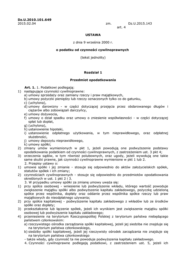 Dz.U.2010.101.649 2015.02.04 zm. Dz.U.2015.143 art. 4 USTAWA z dnia 9 września 2000 r. o podatku od czynności cywilnoprawnych (tekst jednolity) Rozdział 1 Przedmiot opodatkowania Art. 1. 1. Podatkowi podlegają: 1) następujące czynności cywilnoprawne: a) umowy sprzedaży oraz zamiany rzeczy i praw majątkowych, b) umowy pożyczki pieniędzy lub rzeczy oznaczonych tylko co do gatunku, c) (uchylona), d) umowy darowizny - w części dotyczącej przejęcia przez obdarowanego długów i ciężarów albo zobowiązań darczyńcy, e) umowy dożywocia, f) umowy o dział spadku oraz umowy o zniesienie współwłasności - w części dotyczącej spłat lub dopłat, g) (uchylona), h) ustanowienie hipoteki, i) ustanowienie odpłatnego użytkowania, w tym nieprawidłowego, oraz odpłatnej służebności, j) umowy depozytu nieprawidłowego, k) umowy spółki; 2) zmiany umów wymienionych w pkt 1, jeżeli powodują one podwyższenie podstawy opodatkowania podatkiem od czynności cywilnoprawnych, z zastrzeżeniem ust. 3 pkt 4; 3) orzeczenia sądów, w tym również polubownych, oraz ugody, jeżeli wywołują one takie same skutki prawne, jak czynności cywilnoprawne wymienione w pkt 1 lub 2. 2. Przepisy ustawy o: 1) umowie spółki i jej zmianie - stosuje się odpowiednio do aktów założycielskich spółek, statutów spółek i ich zmiany; 2) czynnościach cywilnoprawnych - stosuje się odpowiednio do przedmiotów opodatkowania określonych w ust. 1 pkt 2 i 3. 3. W przypadku umowy spółki za zmianę umowy uważa się: 1) przy spółce osobowej - wniesienie lub podwyższenie wkładu, którego wartość powoduje zwiększenie majątku spółki albo podwyższenie kapitału zakładowego, pożyczkę udzieloną spółce przez wspólnika, dopłaty oraz oddanie przez wspólnika spółce rzeczy lub praw majątkowych do nieodpłatnego używania; 2) przy spółce kapitałowej - podwyższenie kapitału zakładowego z wkładów lub ze środków spółki oraz dopłaty; 3) przekształcenie lub łączenie spółek, jeżeli ich wynikiem jest zwiększenie majątku spółki osobowej lub podwyższenie kapitału zakładowego; 4) przeniesienie na terytorium Rzeczypospolitej Polskiej z terytorium państwa niebędącego państwem członkowskim: a) rzeczywistego ośrodka zarządzania spółki kapitałowej, jeżeli jej siedziba nie znajduje się na terytorium państwa członkowskiego, b) siedziby spółki kapitałowej, jeżeli jej rzeczywisty ośrodek zarządzania nie znajduje się na terytorium państwa członkowskiego - także wtedy, gdy czynność ta nie powoduje podwyższenia kapitału zakładowego. 4. Czynności cywilnoprawne podlegają podatkowi, z zastrzeżeniem ust. 5, jeżeli ich przedmiotem są: 1) rzeczy znajdujące się na terytorium Rzeczypospolitej Polskiej lub prawa majątkowe wykonywane na terytorium Rzeczypospolitej Polskiej; 2) rzeczy znajdujące się za granicą lub prawa majątkowe wykonywane za granicą, w przypadku gdy nabywca ma miejsce zamieszkania lub siedzibę na terytorium Rzeczypospolitej Polskiej i czynność cywilnoprawna została dokonana na terytorium Rzeczypospolitej Polskiej. 5. Umowa spółki oraz jej zmiana podlega podatkowi, jeżeli w chwili dokonania czynności na terytorium Rzeczypospolitej Polskiej znajduje się: 1) w przypadku spółki osobowej - siedziba tej spółki; 2) w przypadku spółki kapitałowej: a) rzeczywisty ośrodek zarządzania albo b) siedziba tej spółki - jeżeli jej rzeczywisty ośrodek zarządzania nie znajduje się na terytorium innego państwa członkowskiego. 6. (uchylony). 7. (uchylony). 8. (uchylony). Art. 1a. Użyte w ustawie określenia oznaczają: 1) spółka osobowa - spółkę: cywilną, jawną, partnerską, komandytową lub komandytowoakcyjną; 2) spółka kapitałowa - spółkę: z ograniczoną odpowiedzialnością, akcyjną lub europejską; 3) siedziba spółki - siedzibę spółki określoną w umowie spółki; 4) rzeczywisty ośrodek zarządzania - miejscowość, w której ma siedzibę organ zarządzający spółki kapitałowej; 5) państwo członkowskie - państwo członkowskie Unii Europejskiej lub państwo członkowskie Europejskiego Porozumienia o Wolnym Handlu (EFTA) - strona umowy o Europejskim Obszarze Gospodarczym; 6) (uchylony); 7) podatek od towarów i usług - podatek od towarów i usług w rozumieniu ustawy z dnia 11 marca 2004 r. o podatku od towarów i usług (Dz. U. Nr 54, poz. 535, z późn. zm.) lub podatek od wartości dodanej pobierany na podstawie przepisów obowiązujących w państwach członkowskich. Art. 2. Nie podlegają podatkowi: 1) czynności cywilnoprawne w sprawach: a) alimentacyjnych, opieki, kurateli i przysposobienia, b) ubezpieczenia społecznego, ubezpieczenia zdrowotnego, opieki społecznej, ulg określonych w przepisach szczególnych dla żołnierzy niezawodowych i osób odbywających służbę zastępczą oraz ich rodzin, a także uprawnień dla osób niepełnosprawnych i osób objętych przepisami o szczególnych uprawnieniach dla kombatantów, c) wyboru Prezydenta Rzeczypospolitej Polskiej, wyborów do Sejmu, Senatu i organów samorządu terytorialnego oraz referendum, d) powszechnego obowiązku obrony, e) zatrudnienia, świadczeń socjalnych i wynagrodzeń za pracę, f) nauki, szkolnictwa i oświaty pozaszkolnej oraz zdrowia, g) podlegających przepisom o gospodarce nieruchomościami lub przepisom o autostradach płatnych, h) podlegających przepisom o szczególnych zasadach przygotowania i realizacji inwestycji w zakresie dróg krajowych, i) (uchylona), j) podlegających przepisom o szczególnych zasadach odbudowy, remontów i rozbiórek obiektów budowlanych zniszczonych lub uszkodzonych w wyniku działania żywiołu; 2) umowy sprzedaży nieruchomości lub prawa użytkowania wieczystego zawieranej w związku z realizacją roszczeń wynikających z ograniczenia sposobu korzystania z nieruchomości na podstawie przepisów o ochronie środowiska; 2a) umowy sprzedaży lokali mieszkalnych, których stroną je