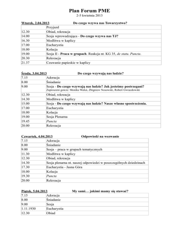 Plan Forum PME 2-5 kwietnia 2013 Wtorek, 2.04.2013 Do czego wzywa nas Towarzystwo? Przyjazd 12.30 Obiad, rekreacja 14.00 Sesja wprowadzająca - Do czego wzywa nas TJ? 16.30 Modlitwa w kaplicy 17.00 Eucharystia 18.00 Kolacja 19.00 Sesja II - Praca w grupach. Reakcja nt. KG 35, de statu. Puncta. 20.30 Rekreacja 21.37 Czuwanie papieskie w kaplicy Środa, 3.04.2013 Do czego wzywają nas ludzie? 7.15 Adoracja 8.00 Śniadanie 9.00 Sesja - Do czego wzywają nas ludzie? Jak jesteśmy postrzegani? Zaproszeni goście: Monika Waluś, Zbigniew Nosowski, Robert Gwiazdowski 12.30 14.30 15.00 17.00 18.00 19.00 19.45 20.00 Obiad, rekreacja Modlitwa w kaplicy Sesja - Do czego wzywają nas ludzie? Nasze własne spostrzeżenia. Eucharystia Kolacja Sesja Plenarna Puncta Rekreacja Czwartek, 4.04.2013 Odpowiedź na wezwanie 7.15 Adoracja 8.00 Śniadanie 9.00 Sesja – praca w grupach tematycznych 11.30 Modlitwa w kaplicy 12.30 Obiad, rekreacja 14.30 Sesja plenarna nt. naszej odpowiedzi w poszczególnych dziedzinach 17.30 Eucharystia - Jasna Góra 18.00 Kolacja 19.30 Puncta 20.00 Rekreacja Piątek, 5.04.2013 7.15 Adoracja 8.00 Śniadanie 9.00 Sesja 1.11.1930 Eucharystia 12.30 Obiad My sami… jakimi mamy się stawać?