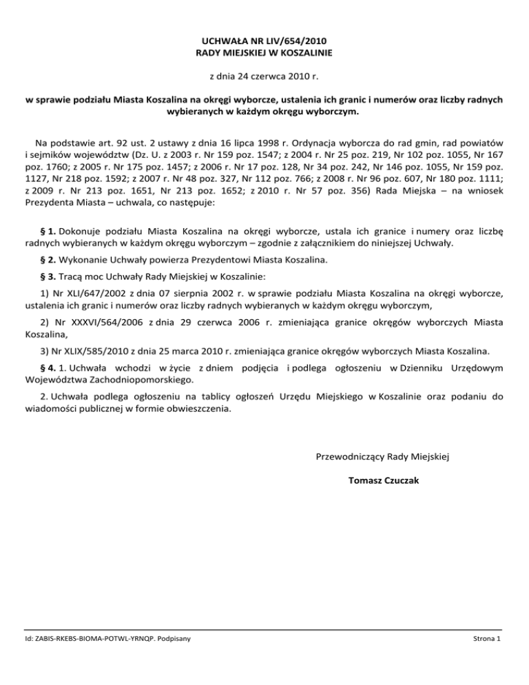 UCHWAŁA NR LIV/654/2010 RADY MIEJSKIEJ W KOSZALINIE z dnia 24 czerwca 2010 r. w sprawie podziału Miasta Koszalina na okręgi wyborcze, ustalenia ich granic i numerów oraz liczby radnych wybieranych w każdym okręgu wyborczym. Na podstawie art. 92 ust. 2 ustawy z dnia 16 lipca 1998 r. Ordynacja wyborcza do rad gmin, rad powiatów i sejmików województw (Dz. U. z 2003 r. Nr 159 poz. 1547; z 2004 r. Nr 25 poz. 219, Nr 102 poz. 1055, Nr 167 poz. 1760; z 2005 r. Nr 175 poz. 1457; z 2006 r. Nr 17 poz. 128, Nr 34 poz. 242, Nr 146 poz. 1055, Nr 159 poz. 1127, Nr 218 poz. 1592; z 2007 r. Nr 48 poz. 327, Nr 112 poz. 766; z 2008 r. Nr 96 poz. 607, Nr 180 poz. 1111; z 2009 r. Nr 213 poz. 1651, Nr 213 poz. 1652; z 2010 r. Nr 57 poz. 356) Rada Miejska – na wniosek Prezydenta Miasta – uchwala, co następuje: § 1. Dokonuje podziału Miasta Koszalina na okręgi wyborcze, ustala ich granice i numery oraz liczbę radnych wybieranych w każdym okręgu wyborczym – zgodnie z załącznikiem do niniejszej Uchwały. § 2. Wykonanie Uchwały powierza Prezydentowi Miasta Koszalina. § 3. Tracą moc Uchwały Rady Miejskiej w Koszalinie: 1) Nr XLI/647/2002 z dnia 07 sierpnia 2002 r. w sprawie podziału Miasta Koszalina na okręgi wyborcze, ustalenia ich granic i numerów oraz liczby radnych wybieranych w każdym okręgu wyborczym, 2) Nr XXXVI/564/2006 z dnia 29 czerwca 2006 r. zmieniająca granice okręgów wyborczych Miasta Koszalina, 3) Nr XLIX/585/2010 z dnia 25 marca 2010 r. zmieniająca granice okręgów wyborczych Miasta Koszalina. § 4. 1. Uchwała wchodzi w życie z dniem podjęcia i podlega ogłoszeniu w Dzienniku Urzędowym Województwa Zachodniopomorskiego. 2. Uchwała podlega ogłoszeniu na tablicy ogłoszeń Urzędu Miejskiego w Koszalinie oraz podaniu do wiadomości publicznej w formie obwieszczenia. Przewodniczący Rady Miejskiej Tomasz Czuczak Id: ZABIS-RKEBS-BIOMA-POTWL-YRNQP. Podpisany Strona 1 Załącznik do Uchwały Nr LIV/654/2010 Rady Miejskiej w Koszalinie z dnia 24 czerwca 2010 r. Numer GRANICE OKRĘGU okręgu wyborczego Liczba wybieranych radnych I Adama Próchnika, Adama Śnieżka, Akademicka, Arki Bożka, Bliska, Boczna, Chełmska, Daleka, Darłowska, Dobra, Doktora Jerzego Kostenckiego, Gajowa, Gdańska, Gracjana Bojara-Fijałkowskiego, Hugo Kołłątaja, Ignacego Chrzanowskiego, Ignacego Kuczkowskiego, Izydora Maćkowicza, Jadwigi Jelec, Jana Baczewskiego, Jana Bauera,Jana Pawła II, Jerzego Fitio, Joachima Lelewela, Juliana Krzyżanowskiego, Kazimierza Wyki, Kędzierzyńska, Kielecka, Klaudiusza Górskiego, Krakowska, Księdza Bolesława Domańskiego, Księdza Jerzego Popiełuszki, Księdza Maksymiliana Grochowskiego, Kujawska, Lubuska, Macierzy, Maksymiliana Golisza, Malownicza, Małopolska, Marii Magdaleny Gąszczak, Mazowiecka, Mazurska, Michała Kajki, Michała Żebrowskiego Młodości, Na Skwierzynkę, Oskara Lange, Podlaska, Pomorska,Prosta, Radości, Rodła, Ryszarda Siennickiego, Romana Sierocińskiego,Seweryna Pieniężnego, Stanisława Staszica, Sudecka, Śląska, Śniadeckich, Śmiała, Tadeusza Kotarbińskiego, Tradycji, Wacława Sierpińskiego, Warmińska, Wąwozowa, Wesoła, Weteranów, Wielkopolska, Witolda Doroszewskiego, Władysława Spasowskiego, Władysława Tatarkiewicza, Władysława Turowskiego, Władysława IV od nr 50 do końca (strona parzysta), Własna, Wspólna, Zenona Klemensiewicza. 5 II Adama Asnyka, Adama Mickiewicza, Aleja Monte Cassino od nr 2 do nr 16 (strona parzysta) i od nr 7 do nr 13 (strona nieparzysta), Bartosza Głowackiego, Cypriana Norwida, Doktora Andrzeja Zientarskiego, Feliksa Nowowiejskiego, Franciszka Zubrzyckiego, Fryderyka Chopina, Grodzka, Hanki Sawickiej, Henryka Jagoszewskiego, Henryka Wieniawskiego, Hołdu Pruskiego, Jana Kochanowskiego,Jana Matejki, Jedności, Józefa Mireckiego, Józefa Wybickiego, Juliana Fałata, Juliana Tuwima, Karola Szymanowskiego, Konstantego Ildefonsa Gałczyńskiego, Krucza, Leopolda Okulickiego, Lucjana Szenwalda, Ludwika Waryńskiego, Marszałka Józefa Piłsudskiego, Melchiora Wańkowicza, Michała Ogińskiego, Mieczysława Karłowicza od nr 1 do nr 5 (strona nieparzysta) i od nr 2 do nr 32 (strona parzysta), Mikołaja Kopernika, Mikołaja Reja, Młyńska, Ogrodowa, Orląt Lwowskich, Partyzantów, Piastowska, Pionierów, Plac Kilińskiego, Plac Polonii, Projektantów, Rolna, Romualda Traugutta, Rotmistrza Witolda Pileckiego, Słupska, Sportowa, Stanisława Moniuszki, Tadeusza Kościuszki, Tadeusza Rejtana, Tadeusza Sygietyńskiego, Władysława IV od nr 2 do nr 48 (strona parzysta) i od nr 1 do nr 91 (strona nieparzysta), Władysława Broniewskiego,Zgoda. 5 III 4-go Marca, Akacjowa, Andrzeja Struga, Artura Grottgera, Artylerzystów, Azaliowa, Bajkowa, Bartłomieja,Bażancia, Bławatków, Bonifacego, Borówkowa, Botaniczna, Bożydara, Bratków, Brzoskwiniowa, Bzów, Cedrowa, Cicha, Cisowa, Chabrów, Cyprysowa, Czeremchowa, Czereśniowa, Czwartaków, Dębowa, Diamentowa, Dywizji Drezdeńskiej, Dzierżęcińska, Ferdynanda Ruszczyca, Fiołków, Generała Józefa Bema, Generała Józefa Sowińskiego, Gerberowa, Gęsia, Głogowa, Gnieźnieńska, Gołębia, Goździków, Grabowa, Hebanowa, Heleny Modrzejewskiej, Hubalczyków, Ignacego Paderewskiego, Indycza, Irysów, Jabłoniowa, Jagodowa, Jałowcowa, Jana Kasprowicza, Janka Stawisińskiego, Janusza Korczaka, Jarzębinowa, Jaskrów, Jaskółek, Jaśminowa, Jaworowa, Jesionowa, Jeziorna, Jeżynowa, Jodłowa, Józefa Chełmońskiego, Julisza Słowackiego, Jutrzenki, Kacza, Kaczeńców, Kadetów, Kalinowa, Kamieniarska, Kasztanowa, Karola Chodkiewicza, Kazimierza Tetmajera, Klonowa, Komunalna, Konwalii, Korzenna, Krawiecka, Krokusów, Księżycowa, Kubusia Puchatka, Kupiecka, Laurowa, Lawendy, Legnicka, Leopolda Staffa, Leśna, Leszczynowa, Limbowa, Lotników, Lubiatowska, Ludwika Zamenhofa, Łąkowa, Łubinów, Macieja, Magnolii, Mahoniowa, Maków, Malinowa, Malw, Manowska, Marii Curie-Skłodowskiej, Marii Konopnickiej, Mieczysława Karłowicza od nr 
