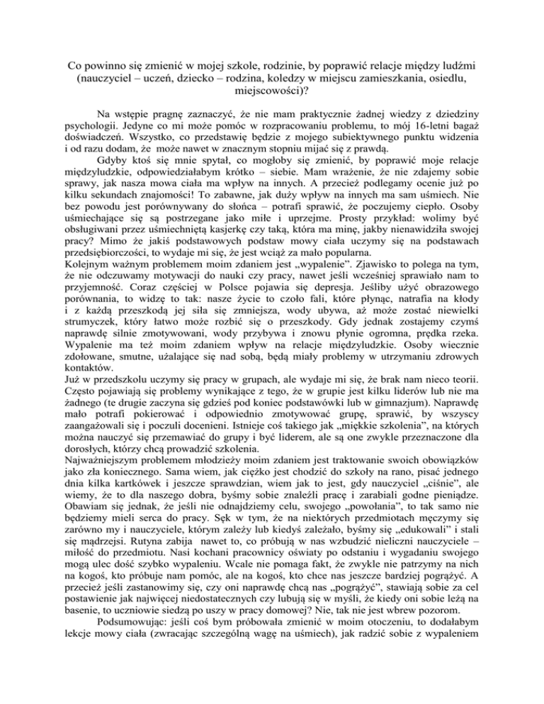 Co powinno się zmienić w mojej szkole, rodzinie, by poprawić relacje między ludźmi (nauczyciel – uczeń, dziecko – rodzina, koledzy w miejscu zamieszkania, osiedlu, miejscowości)? Na wstępie pragnę zaznaczyć, że nie mam praktycznie żadnej wiedzy z dziedziny psychologii. Jedyne co mi może pomóc w rozpracowaniu problemu, to mój 16-letni bagaż doświadczeń. Wszystko, co przedstawię będzie z mojego subiektywnego punktu widzenia i od razu dodam, że może nawet w znacznym stopniu mijać się z prawdą. Gdyby ktoś się mnie spytał, co mogłoby się zmienić, by poprawić moje relacje międzyludzkie, odpowiedziałabym krótko – siebie. Mam wrażenie, że nie zdajemy sobie sprawy, jak nasza mowa ciała ma wpływ na innych. A przecież podlegamy ocenie już po kilku sekundach znajomości! To zabawne, jak duży wpływ na innych ma sam uśmiech. Nie bez powodu jest porównywany do słońca – potrafi sprawić, że poczujemy ciepło. Osoby uśmiechające się są postrzegane jako miłe i uprzejme. Prosty przykład: wolimy być obsługiwani przez uśmiechniętą kasjerkę czy taką, która ma minę, jakby nienawidziła swojej pracy? Mimo że jakiś podstawowych podstaw mowy ciała uczymy się na podstawach przedsiębiorczości, to wydaje mi się, że jest wciąż za mało popularna. Kolejnym ważnym problemem moim zdaniem jest „wypalenie”. Zjawisko to polega na tym, że nie odczuwamy motywacji do nauki czy pracy, nawet jeśli wcześniej sprawiało nam to przyjemność. Coraz częściej w Polsce pojawia się depresja. Jeśliby użyć obrazowego porównania, to widzę to tak: nasze życie to czoło fali, które płynąc, natrafia na kłody i z każdą przeszkodą jej siła się zmniejsza, wody ubywa, aż może zostać niewielki strumyczek, który łatwo może rozbić się o przeszkody. Gdy jednak zostajemy czymś naprawdę silnie zmotywowani, wody przybywa i znowu płynie ogromna, prędka rzeka. Wypalenie ma też moim zdaniem wpływ na relacje międzyludzkie. Osoby wiecznie zdołowane, smutne, użalające się nad sobą, będą miały problemy w utrzymaniu zdrowych kontaktów. Już w przedszkolu uczymy się pracy w grupach, ale wydaje mi się, że brak nam nieco teorii. Często pojawiają się problemy wynikające z tego, że w grupie jest kilku liderów lub nie ma żadnego (te drugie zaczyna się gdzieś pod koniec podstawówki lub w gimnazjum). Naprawdę mało potrafi pokierować i odpowiednio zmotywować grupę, sprawić, by wszyscy zaangażowali się i poczuli docenieni. Istnieje coś takiego jak „miękkie szkolenia”, na których można nauczyć się przemawiać do grupy i być liderem, ale są one zwykle przeznaczone dla dorosłych, którzy chcą prowadzić szkolenia. Najważniejszym problemem młodzieży moim zdaniem jest traktowanie swoich obowiązków jako zła koniecznego. Sama wiem, jak ciężko jest chodzić do szkoły na rano, pisać jednego dnia kilka kartkówek i jeszcze sprawdzian, wiem jak to jest, gdy nauczyciel „ciśnie”, ale wiemy, że to dla naszego dobra, byśmy sobie znaleźli pracę i zarabiali godne pieniądze. Obawiam się jednak, że jeśli nie odnajdziemy celu, swojego „powołania”, to tak samo nie będziemy mieli serca do pracy. Sęk w tym, że na niektórych przedmiotach męczymy się zarówno my i nauczyciele, którym zależy lub kiedyś zależało, byśmy się „edukowali” i stali się mądrzejsi. Rutyna zabija nawet to, co próbują w nas wzbudzić nieliczni nauczyciele – miłość do przedmiotu. Nasi kochani pracownicy oświaty po odstaniu i wygadaniu swojego mogą ulec dość szybko wypaleniu. Wcale nie pomaga fakt, że zwykle nie patrzymy na nich na kogoś, kto próbuje nam pomóc, ale na kogoś, kto chce nas jeszcze bardziej pogrążyć. A przecież jeśli zastanowimy się, czy oni naprawdę chcą nas „pogrążyć”, stawiają sobie za cel postawienie jak najwięcej niedostatecznych czy lubują się w myśli, że kiedy oni sobie leżą na basenie, to uczniowie siedzą po uszy w pracy domowej? Nie, tak nie jest wbrew pozorom. Podsumowując: jeśli coś bym próbowała zmienić w moim otoczeniu, to dodałabym lekcje mowy ciała (zwracając szczególną wagę na uśmiech), jak radzić sobie z wypaleniem i jak pracować w grupie. Przede wszystkim te zajęcia nie powinny być obowiązkowe, by nie stały się kolejnym z przedmiotów, na którym odrabia się prace domowe czy słucha muzyki. Oprócz tego zrobiłabym coś, by każdy uczeń traktował nauczyciela jak kogoś, kto chce mu pomóc, nie jak zło wcielone Ewa Brzeziecka
