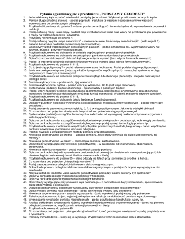 Pytania egzaminacyjne z przedmiotu „PODSTAWY GEODEZJI” 1. 2. 3. 4. 5. 6. 7. 8. 9. 10. 11. 12. 13. 14. 15. 16. 17. 18. 19. 20. 21. 22. 23. 24. 25. 26. 27. 28. 29. 30. 31. 32. 33. 34. 35. 36. 37. 38. 39. 40. 41. 42. 43. 44. 45. 46. 47. 48. 49. 50. 51. 52. Jednostki miary kąta – podać zależności pomiędzy jednostkami. Wykonać przeliczenie podanych kątów. Pomiar długości taśmą stalową - podać poprawki i redukcje (z wzorami i oznaczeniami we wzorach) wprowadzane do pomierzonych odległości. Przykład obliczeniowy do pytania 2 – dane: pomierzona długość i inne niezbędne do wprowadzenia poprawek i redukcji. Podaj definicję mapy, skali mapy, podział map w zależności od skali oraz wzory na przeliczanie pól powierzchni z mapy na wartości terenowe i odwrotnie. Przykłady rachunkowe do pytania 4. Podaj definicję pojęcia „mapa zasadnicza” – stosowane skale, treść mapy zasadniczej itp. (instrukcja K 1) Zasada konstrukcji podziałki poprzecznej (transwersalnej). Geodezyjny układ współrzędnych prostokątnych płaskich – podać oznaczenia osi, wyprowadzić wzory na: azymut, długość i przyrosty współrzędnych. Przykład rachunkowy na obliczenia w układzie współrzędnych prostokątnych płaskich. Przykład rachunkowy na obliczenie współrzędnych punktów na domiarach prostokątnych. Opisać (z wzorami) kolejność obliczeń kątowego wcięcia w przód (bez użycia form rachunkowych). Podać (z wzorami) kolejność obliczeń liniowego wcięcia w przód (bez użycia form rachunkowych). Przykład rachunkowy do pytania 11 i 12. Co to jest ciąg poligonowy? – podać elementy mierzone i obliczane. Podać podział ciągów poligonowych. Jakie warunki geometryczne (dotyczące kątów i przyrostów współrzędnych) muszą być spełnione w ciągu poligonowym otwartym i zamkniętym? Przykład rachunkowy na obliczenie poligonu zamkniętego lub otwartego (dane kąty i długości oraz azymut jednego boku). Średnia arytmetyczna – podać wzór, i jej własności. Średnia arytmetyczna ogólna – podać wzór i jej własności. Co to jest waga obserwacji. Systematyka (podział) błędów obserwacji – opisać każdy z podanych błędów. Podać wzory na błędy średnie: pojedynczego spostrzeżenia, błąd średniej arytmetycznej (dla obserwacji jednakowo i niejednakowo dokładnych) oraz błąd funkcji obserwacji. Wyjaśnić znaczenie użytych oznaczeń. Przykład rachunkowy do pytania 17 i 18. Przykład rachunkowy na obliczenie błędu średniego funkcji obserwacji. Opisać w punktach kolejność wyrównania sieci poligonowej metodą punktów węzłowych – podać wzory (gdy potrzebne). Podaj znaczenie geometryczne odchyłek fβ, fx, fy, fl w ciągu poligonowym. Jak się te odchyłki oblicza? Co rozumiesz pod pojęciem dowiązanie bezpośrednie i pośrednie ciągu poligonowego? Systematyka (podział) szczegółów terenowych w zależności od wymaganej dokładności pomiaru (zgodnie z instrukcją techniczną). Opisz w punktach pomiar szczegółów metodą domiarów prostokątnych – podaj sprzęt, technologię pomiaru itp. Opisz w punktach pomiar szczegółów metodą biegunową– podaj sprzęt, technologię pomiaru itp. Przykład rachunkowy z obliczania współrzędnych pikiet pomierzonych metodą biegunową – dane: współrzędne punktów nawiązania, pomierzone kierunki i odległości. Podział niwelacji z uwzględnieniem metody pomiaru oraz dokładności. Niwelacja geometryczna ze środka – zasada pomiaru. Jakie błędy eliminują się dzięki zastosowaniu tej metody? Niwelacja geometryczna „w przód” – technologia pomiaru i zastosowanie. Opisz błędy występujące przy niwelacji geometrycznej – w zależności od: instrumentu, obserwatora, środowiska. Niwelacja techniczna reperów – podaj w punktach zasady pomiaru. Opisz w punktach kolejność sprawdzania poziomości osi celowej (w niwelatorach samopoziomujących) lub nierównoległości osi celowej do osi libeli (w niwelatorach z libelą). Przykład rachunkowy do pytania 35 – dane odczyty na łatach przy pomiarze ze środka i z końca. Co rozumiesz pod pojęciem „interpolacja warstwic” ? Podaj zasadę pomiaru odległości dalmierzem elektromagnetycznym. Dokładność pomiaru odległości dalmierzem elektromagnetycznym – podaj wzór i opisz występujące w nim zależności. Narysuj układ osi teodolitu. Jakie warunki geometryczne pomiędzy osiami powinny być spełnione? Opisz w punktach sposób wyznaczania kolimacji w teodolicie. Opisz w punktach sposób wyznaczania inklinacji w teodolicie. Opisz błędy występujące przy pomiarze kąta poziomego – z podziałem na błędy instrumentu, spowodowane przez obserwatora, i środowisko. Dlaczego pomiar kątów poziomych wykonujemy przy dwóch położeniach koła pionowego? Opisz metody pomiaru kąta poziomego – podaj technologię i wzory (gdy potrzebne) Niwelacja trygonometryczna – zasada wyznaczania różnic wysokości, podaj wzory gdy potrzebne. Refrakcja pionowa –co to jest; wyjaśnij jaki wpływ ma refrakcja na dokładność pomiaru kąta pionowego. Wyznaczanie wysokości punktów niedostępnych - podaj przykładowe konstrukcje, wzory itp. Analiza dokładności wyznaczania różnicy wysokości metodą niwelacji trygonometrycznej – dane: kąt pionowy odległość pomierzona, współczynnik refrakcji pionowej i ich błędy. Przykład rachunkowy do pytania 49. Co rozumiemy pod pojęciem „sieć geodezyjna lokalna” i „sieć geodezyjna nawiązana” – podaj przykłady wraz z rysunkami. Pomiary mimośrodowe – kiedy się je wykonuje. Wyprowadzić wzór na mimośród celu i stanowiska.