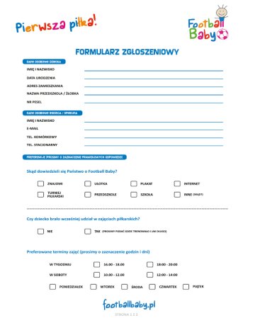 deklaracja członkowska § 1. 1. Przedmiotem deklaracji jest przystąpienie Podopiecznego do zajęć piłkarskich organizowanych przez Football Baby na warunkach określonych w niniejszej deklaracji i załączonym regulaminie. §2 1. Opiekun oświadcza, iż Podopieczny będzie uczestniczył w zajęciach raz w tygodniu organizowanych w miejscowości ……………………..........., w terminach ustalonych przez Trenera właściwej grupy. §3 1. Opłata miesięczna (abonament) za przedmiot umowy wynosi ………...,- zł niezależnie od liczby zajęć przypadających w poszczególnych miesiącach, płatnych z góry za dany miesiąc do 10 dnia każdego miesiąca na podstawie dostarczonej faktury VAT Pro-forma. 2. Opłatę miesięczną nalicza się w przypadku choćby jednej obecności Podopiecznego na zajęciach Football Baby w danym miesiącu. 3. W przypadku całkowitej nieobecności Podopiecznego w danym miesiącu na zajęciach Football Baby naliczane jest 50% opłaty miesięcznej określonej w pkt 1. chyba, że uczestnik zrezygnował z zajęć, o czym wcześniej poinformował managera swojego oddziału Football Baby. 4. Każdy ośrodek Football Baby może dowolnie modyfikować zasady naliczania opłat, w tym zwolnić z opłaty całkowicie lub ją zredukować ze względu np. na długotrwałą chorobę Podopiecznego lub nieobecności spowodowane czynnikami niezależnymi od Opiekunów, jedynie po wcześniejszym ustaleniu z managerem swojego ośrodka Football Baby. 5. Opiekun po dniu rozpoczęcia zajęć przez Podopiecznego ma możliwość zamówienia stroju sportowego Football Baby. Po złożeniu zamówienia zobowiązany jest do wpłacenia kaucji w kwocie ..........., zł (słownie ................................... złotych 00/100) za wyżej wymieniony strój. 6. Kaucja, o której mowa w punkcie 5 zostanie zwrócona Opiekunowi w przypadku rezygnacji z uczestnictwa w zajęciach swojego Podopiecznego do końca miesiąca kalendarzowego, w którym strój zamówił, jeśli stroju nie otrzymał. 7. W chwili otrzymania stroju przez Opiekuna przechodzi on na własność Opiekuna, a wniesiona kaucja zostaje zaliczona jako cena należna Football Baby. §4 1. Opiekun potwierdza, że zapoznał się z regulaminem Football Baby, który stanowi integralną część niniejszej deklaracji, akceptując go bez zastrzeżeń. Football Baby zobowiązuje się powiadomić Opiekuna o wszelkich zmianach regulaminu na piśmie. 2. Formularz zgłoszeniowy wypełniony przez Opiekuna stanowi integralną część niniejszej deklaracji. Opiekun zobowiązuje się powiadomić Football Baby o każdej zmianie informacji zawartych w formularzu. f tballbaby.pl §5 1. Opiekun oświadcza, iż Podopieczny został poddany stosownym badaniom oraz że stan zdrowia Podopiecznego jest dobry i umożliwia mu udział w zajęciach, a nadto oświadcza, iż nie są mu znane jakiekolwiek przeciwwskazania do udziału Podopiecznego w zajęciach Football Baby. §6 1. Opiekun wyraża zgodę na wykorzystywanie wizerunku Podopiecznego w zakresie promocji marki Football Baby oraz podmiotów współpracujących, produktów oferowanych przez Football Baby i podmioty współpracujące. 2. Podmiotami współpracującymi w rozumieniu niniejszej deklaracji są: adidas Poland sp. z o.o., North Coast (przedstawiciel marki Isostar), Learning Systems Poland (właściciel marki empik school), Playarena sp. z o.o., Egmont Polska Sp. z o.o., Electronic Arts Sp. z o.o. oraz ........... §7 1. W sprawach nieuregulowanych niniejszą deklaracją zastosowanie mają właściwe przepisy. §8 1. Niniejsza deklaracja została sporządzona w dwóch jednobrzmiących egzemplarzach, po jednym dla Opiekuna i Football Baby. f tballbaby.pl / REGULAMIN ŚWIADCZENIA USŁUG TRENINGU PIŁKARSKIEGO 1. Na potrzeby niniejszego regulaminu ustala się następujące znaczenia poniższych pojęć: • Usługodawca – Fundacja Football Academy Group; • Organizator treningu – Fundacja Football Academy Group oraz wszystkie podmiotu działające w imieniu lub/i na rzecz Fundacji Football Academy Group; • Podopieczny – dziecko w wieku do 4 lat, którego Opiekun deklaruje chęć udziału w zajęciach piłkarskich; • Opiekun – rodzic lub inny podmiot upoważniony na podstawie ustawy do działania w imieniu i na rzecz Podopiecznego; • Abonament – opłata miesięczna za usługę; • Strony – Fundacja Football Academy Group, Podopieczny, Opiekun; • Okres rozliczeniowy – miesiąc kalendarzowy. 2. Niniejszy Regulamin określa zasady świadczenia usług organizacji zajęć piłkarskich przez Fundację Football Academy Group, warunki uczestnictwa w treningu Podopiecznych oraz obowiązki Stron. 3. Podstawą świadczenia usług pomiędzy stronami stanowi przyjęta przez Fundację Football Academy Group Deklaracja złożona przez Opiekuna Podopiecznego. Odmowę przyjęcia Deklaracji Football Baby przekaże Opiekunowi bezzwłocznie. 4. Fundacja Football Academy Group prowadzi zajęcia piłkarskie dla dzieci w wieku do 4. roku życia. 5. Fundacja Football Academy Group organizuje zajęcia przy pomocy osób trzecich, na co Opiekun wyraża zgodę. 6. Fundacja Football Academy Group zobowiązuje się do organizacji zajęć z określoną w Deklaracji Uczestnictwa częstotliwością, dochowując przy tym należytej staranności. 7. Fundacja Football Academy Group zapewnia we własnym zakresie pełną organizację zajęć, w szczególności zawiera umowy z osobami trzecimi. 8. Wysokość oraz termin zapłaty wynagrodzenia Fundacji Football Academy Group ustalone zostają w Deklaracji Uczestnictwa zawartej między Fundacją Football Academy Group a Opiekunem. 9. Wypadek losowy i siła wyższa mogą prowadzić do odwołania zajęć, o czym Opiekun zostanie poinformowany przez Organizatora SMSem i/lub drogą mailową oraz przez stronę www.footballbaby.pl, najpóźniej na 6 godzin przed zajęciami. f tballbaby.pl 10. Opiekun ma prawo do zmiany grupy Podopiecznego po uzgodnieniu z Fundacj