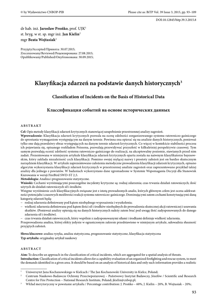© by Wydawnictwo CNBOP-PIB Please cite as: BiTP Vol. 39 Issue 3, 2015, pp. 93–109 DOI:10.12845/bitp.39.3.2015.8 dr hab. inż. Jarosław Prońko, prof. UJK1 st. bryg. w st. sp. mgr inż. Jan Kielin2 mgr Beata Wojtasiak 2 Przyjęty/Accepted/Принята: 30.07.2015; Zrecenzowany/Reviewed/Рецензирована: 27.08.2015; Opublikowany/Published/Опубликована: 30.09.2015; Klasyfikacja zdarzeń na podstawie danych historycznych3 Classification of Incidents on the Basis of Historical Data Классификация событий на основе исторических данных ABSTRAKT Cel: Opis metody klasyfikacji zdarzeń krytycznych stanowiącej uzupełnienie przestrzennej analizy zagrożeń. Wprowadzenie: Klasyfikacja zdarzeń krytycznych pozwala na ocenę zdolności zorganizowanego systemu ratowniczo-gaśniczego do sprostania wymaganiom występującym na danym terenie. Powinna ona opierać się na analizie danych historycznych, ponieważ tylko one dają prawdziwy obraz występujących na danym terenie zdarzeń krytycznych. Co więcej w kontekście stabilności procesu ich pojawiania się, opisanego rozkładem Poissona, pozwalają przewidywać przyszłość w kilkuletniej perspektywie czasowej. Tym samym pozwalają ocenić zdolność systemu ratowniczo-gaśniczego do realizacji, na akceptowalny poziomie, stawianych przed nim zadań. Prezentowana w niniejszym artykule klasyfikacja zdarzeń krytycznych oparta została na naiwnym klasyfikatorze bayesowskim, który zakłada niezależność cech klasyfikacji. Pomimo swojej mylącej nazwy i prostoty założeń jest on bardzo skutecznym narzędziem klasyfikacji. W artykule zaprezentowano założenia metodyczne prowadzenia klasyfikacji zdarzeń krytycznych, opisano algorytm wykorzystania klasyfikacji zdarzeń krytycznych w przestrzennej analizie zagrożeń oraz zaprezentowano przykład takiej analizy dla jednego z powiatów. W badaniach wykorzystano dane zgromadzone w Systemie Wspomagania Decyzji dla Stanowisk Kierowania w wersji FireBird SWD-ST 2,5. Metodologia: Analiza i prognozowanie statystyczne. Wnioski: Cechami wyróżniającymi poszczególne incydenty krytyczne są: rodzaj zdarzenia; czas trwania działań ratowniczych; ilość użytych do działań ratowniczych sił i środków. Wstępne wyróżnienie cech klasyfikacyjnych związane jest z istotą prowadzonych analiz, których głównym celem jest ocena adekwatności potencjału i czasowych możliwości reakcji systemu ratowniczo-gaśniczego. Dominującymi zatem cechami konstytuującymi daną kategorię zdarzeń będą: - rodzaj zdarzenia definiowany pod kątem niezbędnego wyposażenia i wyszkolenia; - wielkość zdarzenia definiowana pod kątem ilości sił i środków niezbędnych do prowadzenia skutecznej akcji ratowniczej i usuwania skutków. (Ponieważ analizy opierają się na danych historycznych należy zatem brać pod uwagę ilość zadysponowanych do danego zdarzenia sił i środków). - czas trwania działań ratowniczych, który wspólnie z zadysponowanymi siłami i środkami definiuje wielkość zdarzenia. Przeprowadzona analiza, której efekty jedynie w ograniczonym zakresie przedstawiono w niniejszym artykule, udowadnia słuszność przyjętych założeń. Słowa kluczowe: analiza ryzyka, analiza statystyczna, prognozowanie statystyczne, klasyfikacja statystyczna Typ artykułu: oryginalny artykuł naukowy ABSTRACT Aim: To describe an approach in the classification of critical incidents, which are aggregated for a spatial analysis of threats. Introduction: Classification of critical incidents allows for a capability evaluation of an organized firefighting and rescue system, to meet the demands identified in a given area. It should be based on an analysis of historical data and only such information provides a realistic Uniwersytet Jana Kochanowskiego w Kielcach / The Jan Kochanowski University in Kielce, Poland; Centrum Naukowo-Badawcze Ochrony Przeciwpożarowej – Państwowy Instytut Badawczy, Józefów / Scientific and Research Centre for Fire Protection – National Research Institute, Poland; [email protected]; 3 Wkład merytoryczny w powstanie artykułu / Percentage contribution: J. Prońko – 60%, J. Kielin – 20%, B. Wojtasiak – 20%; 1 2 93 BADANIA I ROZWÓJ BiTP Vol. 39 Issue 3, 2015, pp. 93–109 DOI:10.12845/bitp.39.3.2015.8 representation of critical incidents, which occur in a given area. In the context of process stability, this profile can be illustrated by the Poisson distribution and will facilitate short term forecasting. Additionally, such data allows for performance evaluation of the firefighting and rescue system in context of tasks placed upon the system. The critical incident classification, presented in this article, is based on the naive Bayesian codifier, which assumes the independence of classification characteristics. Despite the misleading name and simplified assumptions, it is a very effective tool in the classification process. The article presents methodological assumptions for grading of critical events, describes the algorithm used for the codification of such incidents in the course of spatial threat analysis and provides an example of such an analysis for one of the districts. The study used data stored in the support system for decision making in Command and Control Centres, Fire Bird version 2.5 SWD-ST. Methodology: Statistical analysis and forecasting. Conclusions: The distinguishing features of critical incidents are: type of event, operation duration and volume of resources used during incidents. The initial distinction of classification features is linked to the essence of the analysis, whose main objective is to assess the adequacy of potential and timely response of the firefighting and rescue system. Therefore, dominant features for a given category of incident will be: type of event, defined in terms of required equipment and training; the size of incident, defined in terms of the volume of resou
