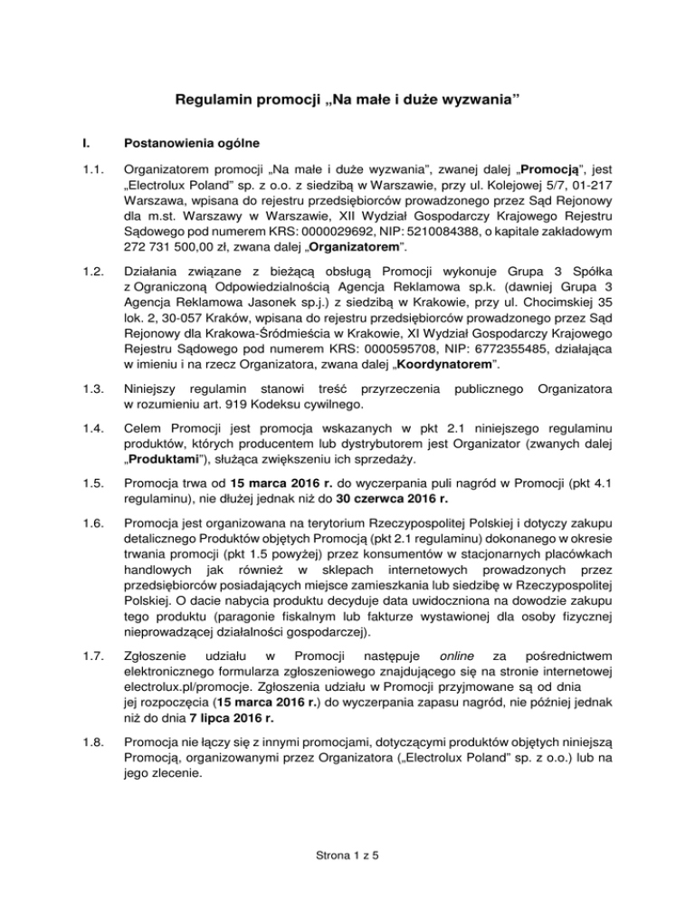 Regulamin promocji „Na małe i duże wyzwania” I. Postanowienia ogólne 1.1. Organizatorem promocji „Na małe i duże wyzwania”, zwanej dalej „Promocją”, jest „Electrolux Poland” sp. z o.o. z siedzibą w Warszawie, przy ul. Kolejowej 5/7, 01-217 Warszawa, wpisana do rejestru przedsiębiorców prowadzonego przez Sąd Rejonowy dla m.st. Warszawy w Warszawie, XII Wydział Gospodarczy Krajowego Rejestru Sądowego pod numerem KRS: 0000029692, NIP: 5210084388, o kapitale zakładowym 272 731 500,00 zł, zwana dalej „Organizatorem”. 1.2. Działania związane z bieżącą obsługą Promocji wykonuje Grupa 3 Spółka z Ograniczoną Odpowiedzialnością Agencja Reklamowa sp.k. (dawniej Grupa 3 Agencja Reklamowa Jasonek sp.j.) z siedzibą w Krakowie, przy ul. Chocimskiej 35 lok. 2, 30-057 Kraków, wpisana do rejestru przedsiębiorców prowadzonego przez Sąd Rejonowy dla Krakowa-Śródmieścia w Krakowie, XI Wydział Gospodarczy Krajowego Rejestru Sądowego pod numerem KRS: 0000595708, NIP: 6772355485, działająca w imieniu i na rzecz Organizatora, zwana dalej „Koordynatorem”. 1.3. Niniejszy regulamin stanowi treść przyrzeczenia w rozumieniu art. 919 Kodeksu cywilnego. 1.4. Celem Promocji jest promocja wskazanych w pkt 2.1 niniejszego regulaminu produktów, których producentem lub dystrybutorem jest Organizator (zwanych dalej „Produktami”), służąca zwiększeniu ich sprzedaży. 1.5. Promocja trwa od 15 marca 2016 r. do wyczerpania puli nagród w Promocji (pkt 4.1 regulaminu), nie dłużej jednak niż do 30 czerwca 2016 r. 1.6. Promocja jest organizowana na terytorium Rzeczypospolitej Polskiej i dotyczy zakupu detalicznego Produktów objętych Promocją (pkt 2.1 regulaminu) dokonanego w okresie trwania promocji (pkt 1.5 powyżej) przez konsumentów w stacjonarnych placówkach handlowych jak również w sklepach internetowych prowadzonych przez przedsiębiorców posiadających miejsce zamieszkania lub siedzibę w Rzeczypospolitej Polskiej. O dacie nabycia produktu decyduje data uwidoczniona na dowodzie zakupu tego produktu (paragonie fiskalnym lub fakturze wystawionej dla osoby fizycznej nieprowadzącej działalności gospodarczej). 1.7. Zgłoszenie udziału w Promocji następuje online za pośrednictwem elektronicznego formularza zgłoszeniowego znajdującego się na stronie internetowej electrolux.pl/promocje. Zgłoszenia udziału w Promocji przyjmowane są od dnia jej rozpoczęcia (15 marca 2016 r.) do wyczerpania zapasu nagród, nie później jednak niż do dnia 7 lipca 2016 r. 1.8. Promocja nie łączy się z innymi promocjami, dotyczącymi produktów objętych niniejszą Promocją, organizowanymi przez Organizatora („Electrolux Poland” sp. z o.o.) lub na jego zlecenie. Strona 1 z 5 publicznego Organizatora II. Warunki uczestnictwa w Promocji 2.1. Promocją objęte są następujące Produkty – odkurzacze marki Electrolux: a) b) c) d) e) f) g) h) i) j) k) 2.2. PowerForce ZPFCLASSIC; PowerForce ZPFPARKETT; PowerForce ZPFALLFLOOR; PowerForce ZPFANIMAL; SilentPerformer ZSPCLASSIC; SilentPerformer ZSPPARKETT; SilentPerformer ZSPREACH; SilentPerformer ZSPALLFLOOR; SilentPerformer Cyclonic ZSPCCLASSIC; SilentPerformer Cyclonic ZSPCPARKETT; SilentPerformer Cyclonic ZSPCSILENT. Promocja jest przeznaczona dla osób fizycznych, które spełniają wszystkie poniższe warunki (dalej „Uczestnicy”): a) b) c) d) e) posiadają miejsce stałego zamieszkania na terytorium Rzeczypospolitej Polskiej; ukończyły 18. rok życia i posiadają pełną zdolność do czynności prawnych; zakupiły jeden z Produktów w okresie wskazanym w pkt 1.5 Regulaminu w punkcie sprzedaży, o którym mowa w pkt 1.6, jako konsumenci w rozumieniu art. 221 Kodeksu cywilnego; zachowały oryginał dowodu zakupu nabytego Produktu (paragon fiskalny lub fakturę wystawioną dla osoby fizycznej nieprowadzącej działalności gospodarczej); dokonały zgłoszenia uczestnictwa w Promocji na zasadach określonych w pkt 3.1 i następnych Regulaminu w czasie przyjmowania zgłoszeń udziału w Promocji (pkt 1.7). 2.3. W Promocji nie mogą uczestniczyć właściciele (współwłaściciele), wspólnicy lub osoby zatrudnione w jakiejkolwiek formie prawnej (na podstawie umowy o pracę, umowy cywilnoprawnej etc.) w punktach sprzedaży detalicznej lub hurtowej, prowadzących sprzedaż produktów Organizatora, w przedsiębiorstwie Organizatora lub Koordynatora oraz członkowie najbliższej rodziny takich osób. 2.4. Przez członków najbliższej rodziny, o których mowa w pkt 2.3 powyżej, rozumie się: wstępnych, zstępnych, rodzeństwo, małżonków, małżonków rodzeństwa, rodziców małżonków i osoby pozostające w stosunku przysposobienia. 2.5. Udział w Promocji i podanie związanych z tym danych jest całkowicie dobrowolne. III. Zgłoszenie uczestnictwa w Promocji 3.1. Zgłoszenie uczestnictwa w Promocji następuje online za pośrednictwem elektronicznego formularza zgłoszeniowego dostępnego na stronie internetowej Organizatora, pod adresem electrolux.pl/promocje 3.2. Jeden Uczestnik może skorzystać z Promocji tylko jeden raz i otrzymać tylko jedną nagrodę. Strona 2 z 5 3.3. Dokonując zgłoszenia uczestnictwa w Promocji Uczestnik na formularzu, o którym mowa w pkt 3.1, podaje: a) b) c) imię, nazwisko, adres zamieszkania lub adres do korespondencji (miejscowość, ulica, numer domu lub lokalu, kod pocztowy); numer telefonu kontaktowego i kontaktowy adres e-mail; dane dotyczące zakupionego Produktu: model zakupionego Produktu, jego numer seryjny, numer produktu (PNC) oraz miejsce zakupu Produktu (miejscowość i nazwę sklepu). 3.4. Do formularza, o którym mowa powyżej, Uczestnik dołącza za pomocą udostępnionego mechanizmu czytelny skan lub fotografię cyfrową dowodu zakupu Produktu (paragonu fiskalnego lub faktury wystawionej dla osoby fizycznej nieprowadzącej działalności gospodarczej). 3.5. Dane zawarte w dokumencie, o którym mowa w pkt 3.4, powinny być zgodne z danymi podanymi 