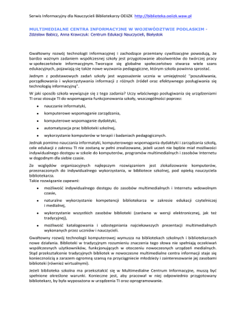 Serwis Informacyjny dla Nauczycieli Bibliotekarzy OEIiZK http://biblioteka.oeiizk.waw.pl MULTIMEDIALNE CENTRA INFORMACYJNE W WOJEWÓDZTWIE PODLASKIM Zdzisław Babicz, Anna Krawczuk: Centrum Edukacji Nauczycieli, Białystok Gwałtowny rozwój technologii informacyjnej i zachodzące przemiany cywilizacyjne powodują, że bardzo ważnym zadaniem współczesnej szkoły jest przygotowanie absolwentów do twórczej pracy w społeczeństwie informacyjnym. Tworzące się globalne społeczeństwo stwarza wiele szans edukacyjnych, pojawiają się także nowe wyzwania pedagogiczne, którym szkoła powinna sprostać. Jednym z podstawowych zadań szkoły jest wyposażenie ucznia w umiejętność "poszukiwania, porządkowania i wykorzystywania informacji z różnych źródeł oraz efektywnego posługiwania się technologią informacyjną". W jaki sposób szkoła wywiązuje się z tego zadania? Uczy właściwego posługiwania się urządzeniami TI oraz stosuje TI do wspomagania funkcjonowania szkoły, wszczególności poprzez: nauczanie informatyki, komputerowe wspomaganie zarządzania, komputerowe wspomaganie dydaktyki, automatyzacja prac biblioteki szkolnej, wykorzystanie komputerów w terapii i badaniach pedagogicznych. Jednak pomimo nauczania informatyki, komputerowego wspomagania dydaktyki i zarządzania szkołą, cele edukacji z zakresu TI nie zostaną w pełni zrealizowane, jeżeli uczeń nie będzie miał możliwości indywidualnego dostępu w szkole do komputerów, programów multimedialnych i zasobów Internetu w dogodnym dla siebie czasie. Ze względów organizacyjnych najlepszym rozwiązaniem jest zlokalizowanie komputerów, przeznaczonych do indywidualnego wykorzystania, w bibliotece szkolnej, pod opieką nauczyciela bibliotekarza. Takie rozwiązanie zapewni: możliwość indywidualnego dostępu do zasobów multimedialnych i Internetu wdowolnym czasie, naturalne wykorzystanie kompetencji bibliotekarza w zakresie edukacji czytelniczej i medialnej, wykorzystanie wszystkich zasobów biblioteki (zarówno w wersji elektronicznej, jak też tradycyjnej), możliwość katalogowania i udostępniania najciekawszych prezentacji multimedialnych wykonanych przez uczniów i nauczycieli. Gwałtowny rozwój technologii komputerowej wymusza na bibliotekach szkolnych i bibliotekarzach nowe działania. Biblioteki w tradycyjnym rozumieniu znaczenia tego słowa nie spełniają oczekiwań współczesnych użytkowników, funkcjonujących w otoczeniu nowoczesnych urządzeń medialnych. Stąd przekształcenie tradycyjnych bibliotek w nowoczesne multimedialne centra informacji staje się koniecznością a zarazem ogromną szansą na przyciągniecie młodzieży i zainteresowanie jej zasobami biblioteki (również wirtualnymi). Jeżeli biblioteka szkolna ma przekształcić się w Multimedialne Centrum Informacyjne, muszą być spełnione określone warunki. Konieczne jest, aby pracował w niej odpowiednio przygotowany bibliotekarz, by była wyposażona w urządzenia TI oraz oprogramowanie. Serwis Informacyjny dla Nauczycieli Bibliotekarzy OEIiZK http://biblioteka.oeiizk.waw.pl W roku ubiegłym MENiS rozpoczął tworzenie Multimedialnych Centrów Informacyjnych w wybranych szkołach ponadgimnazjalnych, wyposażając je w niezbędny sprzęt. Inne szkoły we własnym zakresie podjęły trud udostępnienia komputerów do indywidualnej pracy uczniom. Problematykę organizacji Multimedialnych Centrów Informacji w szkołach województwa podlaskiego uczyniliśmy przedmiotem naszych badań, które przeprowadziliśmy w kwietniu 2002 roku. Celem badań realizowanych metodą sondażu diagnostycznego z zastosowaniem techniki ankiety było określenie: jakie przyjęto modele organizacyjne MCI, jaki jest poziom wyposażenia MCI w sprzęt komputerowy i oprogramowanie, jak są przygotowani nauczyciele do realizacji zadań i celów MCI, jakie są potrzeby szkoleniowe opiekunów MCI? W kwestionariuszu ankietowym znalazły się m.in. następujące zagadnienia: Zasoby Multimedialnego Centrum Informacyjnego Lokalizacja Sprzęt Dostęp do Internetu Oprogramowanie Działalność MCI Czas udostępniania MCI Formy działalności i adresaci System uprawnień Forma rejestracji Przygotowanie nauczyciela opiekuna MCI Specjalność nauczycielska opiekuna MCI Znajomość oprogramowania Umiejętności z zakresu technologii informacyjnej opiekuna MCI Potrzeby szkoleniowe Ankietę rozesłano do 120 szkół ponadgimnazjalnych województwa podlaskiego. Analizę przeprowadziliśmy na 37 uzyskanych odpowiedziach respondentów, którzy zadeklarowali, ze w ich szkołach są realizowane idee MCI. Poniższe wykresy ilustrują część uzyskanych wyników. Serwis Informacyjny dla Nauczycieli Bibliotekarzy OEIiZK http://biblioteka.oeiizk.waw.pl Wykres 1. Rozmieszczenie sprzętu Niepokoi fakt, że aż w 21% szkół, które organizują MCI, komputery znalazły się poza biblioteką. Powoduje to ograniczenie czasu udostępniania narzędzi TI indywidualnym użytkownikom do mniej niż 4 godz. dziennie, co obrazuje wykres 2. Wykres 2.Czas udostępniania MCI Wykres 3. Formy działalności MCI Zwraca uwagę niewielki stopień udostępniania nagrywarek (prawdopodobnie jest to związane z obawą przed nielegalnym kopiowaniem programów), a także sporadyczne katalogowanie prac powstałych w MCI przez opiekuna MCI. Serwis Informacyjny dla Nauczycieli Bibliotekarzy OEIiZK http://biblioteka.oeiizk.waw.pl Wykres 4. Deklarowany stopień znajomości oprogramowania Opiekunowie MCI deklarują bardzo dobrą umiejętność przeglądania zasobów Internetu, korzystania z poczty elektronicznej oraz edytora tekstu. Największy procent ankietowanych (ponad 20%) wskazał na brak umiejętności tworzenia witryn internetowych. Wykres 5.Potrzeby szkoleniowe Największe zainteresowanie dotyczy doskonalenia w zakresie tworzenia prezentacji multimedialnych oraz stron WWW. Przeprowadzone badania potwierdzają zaangażowanie nauczycieli informatyki w tworzeniu MCI w szkołach. W większości 