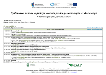 Projekt współfinansowany przez Unię Europejską w ramach Europejskiego Funduszu Społecznego Systemowe zmiany w funkcjonowaniu polskiego samorządu terytorialnego IV Konferencja z cyklu „Sprawne państwo” Termin: 23-24 września 2015 r. Miejsce: Kraków, Uniwersytet Ekonomiczny w Krakowie 23 września 2015 r. 8.30-9.00 Rejestracja uczestników I SESJA – SESJA INAUGURACYJNA Budynek Główny, Stara Aula Budynek Główny, Stara Aula 9.00-9.05 Otwarcie konferencji prof. dr hab. Krzysztof Surówka (Prorektor Uniwersytetu Ekonomicznego w Krakowie) 9.05-9.10 Wystąpienie wprowadzające dr Piotr Kopyciński (Dyrektor Małopolskiej Szkoły Administracji Publicznej Uniwersytetu Ekonomicznego w Krakowie) 9.10-10.10 Debata nad kierunkami reformowania polskiego samorządu terytorialnego – „Ile i jakiej samorządności”? Uczestnicy: prof. dr hab. Grzegorz Gorzelak (Uniwersytet Warszawski), prof. dr hab. Jolanta Itrich-Drabarek (Uniwersytet Warszawski), prof. n. KA dr hab. Wiesław Kisiel (Krakowska Akademia im. A. F. Modrzewskiego), dr Igor Zachariasz (Uczelnia Łazarskiego) Moderator: prof. UEK dr hab. Stanisław Mazur (Uniwersytet Ekonomiczny w Krakowie) 10.10-10.25 Wystąpienie programowe Andrzej Halicki (Minister Administracji i Cyfryzacji) 10.25-11.05 Wręczenie Odznak Honorowych za Zasługi dla Samorządu Terytorialnego Andrzej Halicki (Minister Administracji i Cyfryzacji), Marek Sowa (Marszałek Województwa Małopolskiego) 11.05-11.20 Uroczyste wręczenie certyfikatów CAF samorządom terytorialnym Andrzej Halicki (Minister Administracji i Cyfryzacji) 11.20-11.40 Przerwa 11.40-12.20 Debata dotycząca źródeł finansowania polskiego samorządu terytorialnego – „Kapitał dla rozwoju samorządów” Uczestnicy: Andrzej Bojanowski (Wiceprezydent Gdańska), Joanna Budzińska-Lobnig (Polskie Inwestycje Rozwojowe S.A.), Piotr Górnik (Fortum, Dyrektor ds. Produkcji w Polsce), Dariusz Kacprzyk (Prezes Zarządu Banku Gospodarstwa Krajowego), dr Krzysztof Żuk (Prezydent Lublina) Moderator: Artur Osiecki 12.20-12.40 Dyskusja 12.40-12.55 Podsumowanie debat – prof. dr hab. Jerzy Hausner (Uniwersytet Ekonomiczny w Krakowie) Projekt „Systemowe Wsparcie Procesów Zarządzania w JST” Biuro partnera projektu: Małopolska Szkoła Administracji Publicznej Uniwersytetu Ekonomicznego w Krakowie 31-510 Kraków, ul. Rakowicka 16; tel.: 012 293 75 60, faks: 012 293 75 59; www.msap.pl 13.10-13.40 13.40-13.55 13.55-14.10 14.10-14.25 Panel 1A – Ustrój JST Prowadzący: prof. n. KA dr hab. Wiesław Kisiel Pawilon G, s. 11 Ustrój gminy i powiatu prof. n. KA dr hab. Wiesław Kisiel (Krakowska Akademia im. A. F. Modrzewskiego) Czy istnieje potrzeba reformowania i różnicowania ustrojowo-organizacyjnego samorządu terytorialnego w Polsce? dr hab. Marek Mączyński (Uniwersytet Jagielloński) Samodzielność ustrojowa samorządu terytorialnego – diagnoza i perspektywy dr hab. Dorota Dąbek (Uniwersytet Jagielloński) Samorząd terytorialny – kierunek czy kierunki zmian? dr Kazimierz Bandarzewski (Uniwersytet Jagielloński) 14.25-14.40 Dyskusja 14.40-15.40 Lunch II SESJA – PANELE RÓWNOLEGŁE Panel 1B – Samorządowa służba cywilna Prowadząca: prof. dr hab. Jolanta Itrich-Drabarek Pawilon G, s. 7 Koncepcja powołania samorządowej służby cywilnej prof. dr hab. Jolanta Itrich-Drabarek (Uniwersytet Warszawski) Samorządowa służba cywilna – szansa dla obywateli czy zagrożenie dla samorządności? Wnioski z badania jakościowego dr Kamil Mroczka (PWSZ Oświęcim/Uniwersytet Warszawski) Dojrzałość systemów zarządzania w jednostkach samorządu terytorialnego dr Adam Niedzielski (Uniwersytet Warszawski/Ministerstwo Sprawiedliwości) Metodologiczne uwarunkowania badania opinii JST na temat samorządowej służby cywilnej mgr Marek Solon-Lipiński (Uniwersytet Warszawski/Ministerstwo Sprawiedliwości) Dyskusja III SESJA 15.40-16.00 Podsumowanie sesji panelowej 16.00-16.30 Jak wybierać reprezentantów? Jednomandatowe okręgi wyborcze w gminach dr Jarosław Flis (Uniwersytet Jagielloński) 16.30-17.00 Dyskusja 17.00 Zamknięcie I dnia konferencji 19.00 Uroczysta kolacja Panel 1C – Przyszłość obszarów metropolitalnych Prowadzący: dr Igor Zachariasz Pawilon G, s. 10 Koncepcja powiatu metropolitalnego dr Igor Zachariasz (Uczelnia Łazarskiego) Skutki planowania przestrzennego na obszarach metropolitalnych mgr inż. arch. Andrzej Olbrysz (Gmina Lesznowola) Neoweberyzm jako nowy model zarządzania rozwojem metropolii w warunkach zglobalizowanej gospodarki dr Michał Kudłacz (Uniwersytet Ekonomiczny w Krakowie) Dyskusja Budynek Ustronie, parter Budynek Główny, Stara Aula 24 września 2015 r. 9.00-9.30 Rejestracja uczestników 9.30-9.45 9.45-10.00 10.00-10.15 10.15-10.30 10.30-10.45 10.45-11.00 11.00-11.15 11.15-11.30 11.30-11.45 11.45-12.15 12.15-12.40 12.40-13.00 13.00-13.20 13.20-14.00 14.00-15.00 15.00-15.15 Pawilon G, parter I SESJA – PANELE RÓWNOLEGŁE Panel 1A – Inteligentne miasto (smart city) Pawilon G, s. 11 Panel 1B – Kontrola zarządcza Pawilon G, s. 10 prowadzący: dr hab. Andrzej Bukowski prowadzący: prof. UEK dr hab. Marek Ćwiklicki "Smart city": pomiędzy technokratyczną utopią a społeczno-polityczną rzeczywistością Wpływ koncepcji kontroli zarządczej na poprawę sprawności funkcjonowania struktur dr hab. Andrzej Bukowski (Uniwersytet Jagielloński) samorządu terytorialnego dr Magdalena Małecka-Łyszczek (Uniwersytet Ekonomiczny w Krakowie) Miasto adaptywne Podstawowe elementy systemu zarzadzania ryzykiem w administracji publicznej doc. dr hab. Krzysztof Görlich (Aspen sp. z o.o.) mgr Mirosław Golanko (Starostwo Powiatowe w Krakowie) Kraków jako living lab rozwiązań smart Ocena efektywności organizacyjnej w kontekście kontroli zarządczej w jednostkach mgr Wojciech Przybylski (Krakowski Park Technologiczny) samorządu terytorialnego dr Bernard Ziębicki (Uniwersytet Ekonomiczny w Krakowie) Mikrolokalizacja i doświadczenie użytkownika. Jak