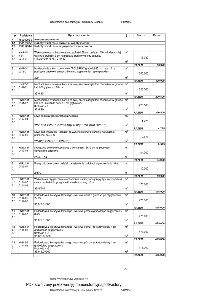 Uzupełnienie do kosztorysu - Remiza w Grodźcu Lp. 1 1.1 1.1. 1 OBMIAR j.m. Opis i wyliczenia Podstawa 45000000-7 Roboty budowlane 45111000-8 Roboty w zakresie burzenia, roboty ziemne 45111291-4 Roboty w zakresie zagospodarowania terenu Poszcz m2 1 KNR-W d.1. 4-01 1.1 0213-01 Wykonanie opaski betonowej o szerokości 50 cm, grubości 15 cm i wierzchniej warstwie grubości 2 cm na podłożu gruntowym przy budynku 2 KNRO-11 d.1. 0316-01 1.1 Nawierzchnie z kostki betonowej "POLBRUK" grubości 80 mm typu 10 na podsypce piaskowej grubości 50 mm z wypełnieniem spoin piaskiem m2 300 m2 13.020 (17.20+2*9.75+6.70)*0.30 m2 RAZEM Mechaniczne wykonanie koryta na całej szerokości jezdni i chodników w gruncie m2 kat. I-IV głębokości 20 cm 220.500 RAZEM 4 KNR 2-31 d.1. 0101-02 1.1 Mechaniczne wykonanie koryta na całej szerokości jezdni i chodników w gruncie m2 kat. I-IV - za każde dalsze 5 cm głębokości Krotność = 6 m2 35*6.30 5 KNR 2-31 d.1. 0402-04 1.1 Ława pod krawężniki betonowa z oporem m3 2*35.0*(0.25*0.15+0.20*0.10)+14.0*(0.10*0.20+0.30*0.10) m3 Ława pod krawężniki - dodatek za wykonanie ławy betonowej na łukach o promieniu do 40 m m3 2*5.0*(0.25*0.1 5+0.20*0.10) m3 Krawężniki betonowe wystające o wymiarach 15x30 cm na podsypce cementowo-piaskowej m 2*35.0+14.0 m Krawężniki betonowe - dodatek za ustawienie na łukach o promieniu do 10 m m 2*5.0 m Wykonanie i zagęszczenie mechaniczne warstwy odsączającej w korycie lub na m2 całej szerokości drogi - grubość warstwy po zag. 15 cm 35.0*5.0 m2 Podbudowa z kruszywa łamanego - warstwa dolna o grubości po zagęszczeniu 25 cm m2 35.0*5.0+300 m2 Podbudowa z kruszywa łamanego - warstwa górna o grubości po zagęszczeniu m2 8 cm 35.0*5.0+300 m2 Podbudowa z kruszywa łamanego - warstwa górna - za każdy dalszy 1 cm grubości po zagęszczeniu Krotność = -5 35.0*5.0+300 m2 Podbudowa z kruszywa łamanego - warstwa górna - za każdy dalszy 1 cm grubości po zagęszczeniu Krotność = -5 35.0*5.0+300 m2 475.000 475.000 RAZEM 475.000 475.000 m2 RAZEM 475.000 475.000 m2 RAZEM -3- Noima PRO Wersja 4.30a Licencja:24 150 PDF stworzony przez wersję demonstracyjną pdfFactory Uzupełnienie do kosztorysu - Remiza w Grodżcu 175.000 475.000 RAZEM 13 KNR 2-31 d.1. 0114-08 1.1 10.000 175.000 RAZEM 12 KNR 2-31 d.1. 0114-08 1.1 84.000 10.000 RAZEM 11 KNR 2-31 d.1. 0114-07 1.1 0.575 84.000 RAZEM 10 KNR 2-31 d.1. 0114-05 1.1 0114-06 4.725 0.575 RAZEM 9 KNR 2-31 d.1. 0104-07 1.1 0104-08 220.500 4.725 RAZEM 8 KNR 2-31 d.1. 0403-07 1.1 220.500 220.500 RAZEM 7 KNR 2-31 d.1. 0403-03 1.1 300.000 m2 35*6.30 6 KNR 2-31 d.1. 0402-05 1.1 13.020 300.000 RAZEM 3 KNR2-31 d.1. 0101-01 1.1 Razem OBMIAR 475.000 Lp- Podstawa 14 KNR 0-1 1 d.1. 0316-01 1.1 Opis i wyliczenia j.m. Nawierzchnie z kostki betonowej "POLBRUK" grubości 80 mm typu 10 na podsypce piaskowej grubości 50 mm z wypełnieniem spoin piaskiem m2 35.0*5.0+300 m2 Mechaniczne plantowanie powierzchni gruntu rodzimego kat.l-lll m2 300 m2 Poszcz 475.000 RAZEM 15 KNR 2-01 d.1. 0505-04 1.1 RAZEM Podkłady betonowe na podłożu gruntowym - Podjazd do garaży i wejście 1.000 kpl 1.000 m3 7.875 (2*4.50+ 1 .50)*0.50*3.0*0.50 , 1.2 45300000-0 Roboty instalacyjne w budynkach 18 KNR-W Kratki wentylacyjne o obwodzie do 1000 mm - do przewodów murowanych d.1. 2-170137-0 2 1 4 m3 19 Kalk. własna Zakup i montaż wentylatora wyciągowego d.1. 2 1 szt. 20 KNR-W Baterie umywalkowe lub zmywakowe ścienne o śr. nominalnej 15 mm d.1. 2-150137-0 2 1 1 szt. 21 KNR-W d.1. 2-150143-0 2 1 Urządzenia do podgrzewania wody ze zbiornikami o poj. 150 dm3 kpl 1 kpl RAZEM 7.875 szt. 4.000 szt. RAZEM 4.000 1.000 szt. RAZEM 1.000 1.000 szt. RAZEM 1.000 1.000 RAZEM kalk. własna Zakup podgrzewacza wody 1.000 szt d.1. 2 1.000 1 szt RAZEM 23 Kalk. własna Zakup i montaż szamba wraz z niezbędnym osprzętem o pojemności 4000 l d.1. zgodnie z projektem budowlanym 2 1 45400000-1 Roboty wykończeniowe w zakresie obiektów budowlanych Bramy z ościeżnicą pełne stalowe o wymiarach 3,50x3.70 m KNR-W 2-021205-0 1 2 1.000 kpl 2.000 szt -4- PDF stworzony przez wersję demonstracyjną pdfFactory 1.000 szt RAZEM Norma PRO Wersja 4.30a Licencja:24 150 1.000 kpl RAZEM 1.3 24 d.1. 3 300.000 kpl RAZEM 22 475.000 300.000 16 kalk. własna Przestawienie ogrodzenia wzdłuż drogi dojazdowej od strony placu zabaw d.1. 1.1 1 17 KNR 2-02 d.1. 1101-01 1.1 Razem 2.000