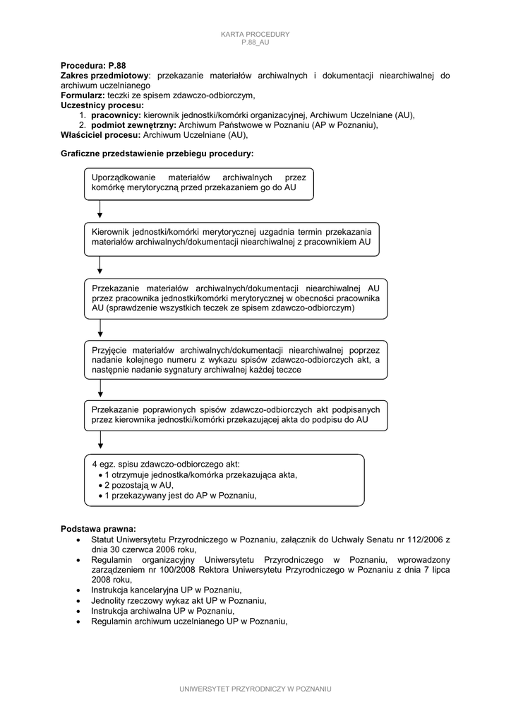KARTA PROCEDURY P.88_AU Procedura: P.88 Zakres przedmiotowy: przekazanie materiałów archiwalnych i dokumentacji niearchiwalnej do archiwum uczelnianego Formularz: teczki ze spisem zdawczo-odbiorczym, Uczestnicy procesu: 1. pracownicy: kierownik jednostki/komórki organizacyjnej, Archiwum Uczelniane (AU), 2. podmiot zewnętrzny: Archiwum Państwowe w Poznaniu (AP w Poznaniu), Właściciel procesu: Archiwum Uczelniane (AU), Graficzne przedstawienie przebiegu procedury: Uporządkowanie materiałów archiwalnych przez komórkę merytoryczną przed przekazaniem go do AU Kierownik jednostki/komórki merytorycznej uzgadnia termin przekazania materiałów archiwalnych/dokumentacji niearchiwalnej z pracownikiem AU Przekazanie materiałów archiwalnych/dokumentacji niearchiwalnej AU przez pracownika jednostki/komórki merytorycznej w obecności pracownika AU (sprawdzenie wszystkich teczek ze spisem zdawczo-odbiorczym) Przyjęcie materiałów archiwalnych/dokumentacji niearchiwalnej poprzez nadanie kolejnego numeru z wykazu spisów zdawczo-odbiorczych akt, a następnie nadanie sygnatury archiwalnej kaŜdej teczce Przekazanie poprawionych spisów zdawczo-odbiorczych akt podpisanych przez kierownika jednostki/komórki przekazującej akta do podpisu do AU 4 egz. spisu zdawczo-odbiorczego akt: • 1 otrzymuje jednostka/komórka przekazująca akta, • 2 pozostają w AU, • 1 przekazywany jest do AP w Poznaniu, Podstawa prawna: • Statut Uniwersytetu Przyrodniczego w Poznaniu, załącznik do Uchwały Senatu nr 112/2006 z dnia 30 czerwca 2006 roku, • Regulamin organizacyjny Uniwersytetu Przyrodniczego w Poznaniu, wprowadzony zarządzeniem nr 100/2008 Rektora Uniwersytetu Przyrodniczego w Poznaniu z dnia 7 lipca 2008 roku, • Instrukcja kancelaryjna UP w Poznaniu, • Jednolity rzeczowy wykaz akt UP w Poznaniu, • Instrukcja archiwalna UP w Poznaniu, • Regulamin archiwum uczelnianego UP w Poznaniu, UNIWERSYTET PRZYRODNICZY W POZNANIU