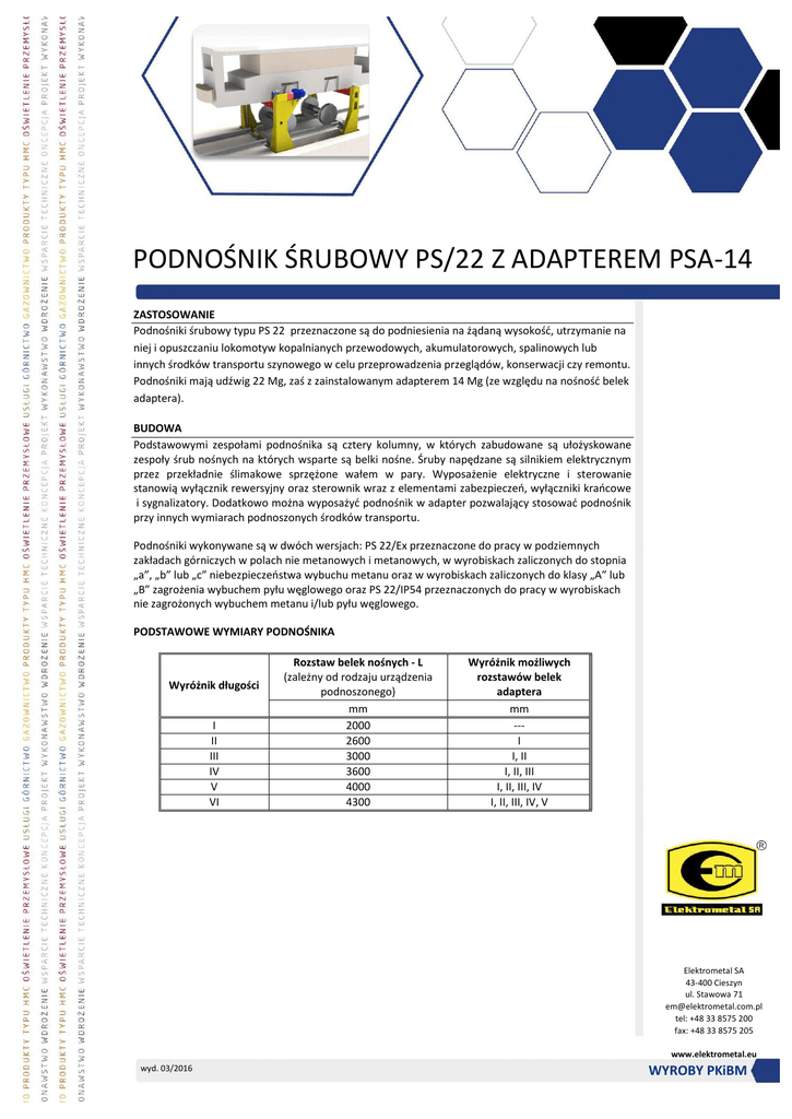 PODNOŚNIK ŚRUBOWY PS/ Z ADAPTEREM PSA-14 ZASTOSOWANIE Pod oś iki śru ow t pu PS przez a zo e są do pod iesie ia a żąda ą w sokość, utrz a ie a niej i opuszczaniu lokomotyw kopalnianych przewodowych, akumulatorowych, spalinowych lub i h środków tra sportu sz owego w elu przeprowadze ia przeglądów, ko serwa ji z re o tu. Pod oś iki ają udźwig Mg, zaś z zai stalowa adaptere Mg ze względu a oś ość elek adaptera). BUDOWA Podstawowymi zespoła i pod oś ika są zter kolu , w któr h za udowa e są ułoż skowa e zespoł śru oś h a któr h wsparte są elki oś e. Śru apędza e są sil ikie elektr z przez przekład ie śli akowe sprzężo e wałe w par . W posaże ie elektr z e i sterowanie sta owią w łą z ik rewers j oraz sterow ik wraz z ele e ta i za ezpie zeń, w łą z iki krań owe i s g alizator . Dodatkowo oż a w posaż ć pod oś ik w adapter pozwalają stosować pod oś ik prz i h w iara h pod oszo h środków tra sportu. Pod oś iki w ko wa e są w dwó h wersja h: PS /E przez a zo e do pra w podziemnych zakłada h gór i z h w pola h ie eta ow h i eta ow h, w w ro iska h zali zo h do stop ia „a”, „ ” lu „ ” ie ezpie zeństwa w u hu eta u oraz w w ro iska h zali zo h do klas „A” lu „B” zagroże ia w u he p łu węglowego oraz PS /IP przez a zo h do pra w w ro iska h ie zagrożo h w u he eta u i/lu p łu węglowego. PODSTAWOWE WYMIARY PODNOŚNIKA Wyróż ik długoś i I II III IV V VI Rozstaw elek oś y h - L zależ od rodzaju urządze ia podnoszonego) mm 2000 2600 3000 3600 4000 4300 Wyróż ik ożliwy h rozstawów elek adaptera mm --I I, II I, II, III I, II, III, IV I, II, III, IV, V Elektrometal SA 43-400 Cieszyn ul. Stawowa 71 [email protected] tel: +48 33 8575 200 fax: +48 33 8575 205 www.elektrometal.eu wyd. 03/2016 WYROBY PKiBM CHARAKTERYSTYKA TECHNICZNA Parametr Udźwig Maksy al a wysokość Mo sil ików apędowy h Prędkość pod osze ia Napię ie zasila ia Wartość 22 1200 2 x 7,5 0,005 (0,3 m/min) 500 J. m. Mg mm kW m/s V NR TEST/9/ Certyfikat Badania Typu WE + UZUPEŁNIENIE NR + UZUPEŁNIENIE NR DOKUMENTY ZWIĄZANE 1. Dokumentacja techniczno–ru howa, I struk ja o sługi Nr DTR/EL- : Pod oś ik śru ow HARD T p PS-22m z systemem sterowania typu ELSAP- /P, Bra ża elektr z a, W da ie II z r. 2. I struk ja O sługi Nr HMC-I.005.2008: Ognioszczelny Rozrusznik Kopalniany typu HMC-ORK.1 40/1/4/2R, wersja _ . . R_ZPZ. z wrześ ia r. 3. Cert fikat Bada ia T pu WE Nr OBAC kopalniany HMC-ORK 4. Deklara je zgod oś i WE Deklara ja zgod oś i WE r /2014 - Pod oś ik śru ow HARD t pu PS-22m-2-2520 - wzór Deklara ja zgod oś i WE ATEX r / – Ognioszczelny rozrusznik kopalniany typu HMC-ORK…/…/… Deklara ja zgod oś i WE ATEX r / – Sterownik UKPL-09 5. ATEX X + załą z iki I struk ja O sługi, Doku e ta ja Te h i zno-Ru howa r DTR/PS/ 22m z Adapterem, Typ PSA-14, Wydanie 5 z kwietnia 2014 r. , , , , , , Og iosz zel / , Pod oś ik śru ow HARD, T p PS- ZAŁĄCZNIKI 1. rozrusz ik Deklara ja zgod oś i WE ELEKTROMETAL SA 43-400 Cieszyn, ul. Stawowa 71, tel: +48 33 85 75 200, fax: +48 33 85 75 205 [email protected], www.elektrometal.eu