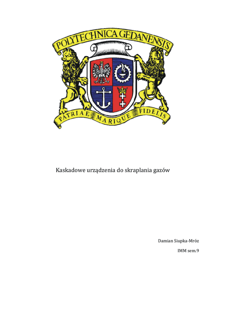 Kaskadowe urządzenia do skraplania gazów Damian Siupka-Mróz IMM sem.9 1. Kaskadowe skraplanie gazów: Metoda skraplania, wykorzystująca coraz niższe temperatury skraplania kolejnych gazów. Metodę tę stosuje się pod zmniejszonym ciśnieniem, kolejne skroplone i wrzące gazy obniżają temperaturę dla kolejnych skropleń w niższych temperaturach. Metodę tę opracowali Karol Olszewski i Zygmunt Wróblewski, którzy 5 kwietnia 1883 jako pierwsi w historii skroplili tlen, a kilka dni później – 13 kwietnia, azot. W tym celu musieli oziębić gazy poniżej temperatury -164 °C. Etapy skraplania: a) najpierw skraplamy gaz, który da się skroplić w temperaturze pokojowej stosując odpowiednio wysokie ciśnienie; b) skroplony gaz zmuszamy do gwałtownego wrzenia pod obniżonym ciśnieniem; temperatura skroplonego gazu obniża się; c) oziębionej cieczy używamy do oziębienia następnego gazu, który w tej niższej temperaturze może być skroplony. Rysunek powyżej przedstawia schemat aparatury użytej przez Wróblewskiego i Olszewskiego do skroplenia składników powietrza. W 1882 roku francuski fizyk L. P. Cailletet osiągnął temperaturę -105oC w kapilarze otoczonej wrzącym etylenem. Wróblewski i Olszewski przebudowali aparaturę Cailleteta. Znacznie obniżyli ciśnienie nad parującym etylenem (do 1/30 atm), co pozwoliło na uzyskanie temperatury -160 oC, a więc niższej od temperatury krytycznej tlenu (ok. -119 oC). Tym samym krakowscy naukowcy wygrali wyścig z czasem z Francuzami. Było wiele niedomówień w tej sprawie ale fakt pozostaje faktem, iż Wróblewski i Olszewski jako pierwsi widzieli tlen i azot w stanie ciekłym, z charakterystycznym dla tego stanu meniskiem. Sprawa skroplenia tzw. trwałych gazów miała olbrzymie znaczenie dla potwierdzenia budowanej wówczas teorii kinetyczno-molekularnej materii. 2. Skraplarki (chłodziarki) Joule’a-Thomsona. Skraplarki Joule-Thomsona nie posiadają części ruchomych i łatwo dają się miniaturyzować. Są one przede wszystkim używane do chłodzenia detektorów podczerwieni, elementów elektroniki oraz niewielkich próbek w badaniach materiałowych. Mogą być również stosowane w kriochirurgii. Ze względu na wysokie ciśnienie pracy, które powinno być możliwie bliskie ciśnieniu inwersji, skraplarki takie są przede wszystkim używane w obiegach otwartych. Schemat ideowy skraplarki (chłodziarki) J-T pracującej w układzie otwartym pokazano na rys. 1, natomiast na rys. 2 odwzorowano obieg skraplarki we współrzędnych: T–s. Zasada działania skraplarki (chłodziarki) pracującej w obiegu otwartym jest następująca: źródłem gazu o wysokim ciśnieniu jest butla z gazem I (najczęściej jest to azot lub argon - w Polsce butle napełnia się do ciśnienia 15 MPa), następnie poprzez zawór II gaz trafia do rekuperacyjnego wymiennika ciepła III gdzie zostaje wstępnie oziębiony przez powracający z parowacza V gaz będący pod niskim ciśnieniem. Za wymiennikiem ciepła strumień czynnika o wysokim ciśnieniu zostaje zdławiony izentalpowo w zaworze JouleThomsona IV, gdzie następuje obniżenie jego temperatury i częściowe skroplenie (skropleniu ulega do kilku procent gazu), Następnie strumień skroplonego gazu trafia do parowacza V, gdzie wrze przy stałej temperaturze, a reszta nie skroplonego gazu trafia do wymiennika ciepła III. Z wymiennika ciepła gaz wydostaje się do atmosfery. 3. Proces dławienia. Procesem, dzięki któremu uzyskuje się obniżenie temperatury czynnika w chłodziarce Joule’a-Thomsona jest dławienie. Dławieniem nazywa się taki proces, który realizuje się w przepływającym płynie wskutek nagłej zmiany przekroju przewodu. Zaburzenie jakie powstaje w płynie w miejscu przewężenia przekroju powoduje niestatyczność procesu i tym samym nieokreśloność parametrów i funkcji stanu przepływającego płynu. Jeśli przewód, w którym zachodzi dławienie jest adiabatycznie izolowany wtedy proces jest izoenergetyczny. 4. Skraplanie gazu ziemnego Skroplenie gazu ziemnego wymaga odebrania od niego ciepła w całym zakresie temperatur od temperatury otoczenia do około 100 K. W zależności od składu skraplanego gazu ziemnego ilość odebranego ciepła wynosi od 600 do 650 kJ/m3 (dla czystego metanu wynosi ona 912,7 kJ/kg, co odpowiada 654 kJ/m3). Ponieważ gaz ziemny po oczyszczeniu pozostaje mieszaniną węglowodorów z domieszkami innych gazów, jego skraplanie odbywa się przy zmiennej temperaturze. Zakresy temperatur, w których odbywa się przemiana fazowa gazu ziemnego są tym większe im niższe jest ciśnienie skraplania i mogą dochodzić do kilkudziesięciu K. Przykładową zależność skumulowanego ciepła odebranego od gazu w trakcie jego schładzania i skraplania pokazano na rysunku 1. Rys.1 Przykładowe przebiegi izobar gazu ziemnego w obszarze jedno- i dwufazowym Uzmiennienie temperatury skraplania gazu ziemnego powoduje, że przy jego skraplaniu należy rozwijać niewiele zmieniającą się moc chłodniczą w całym zakresie temperatur, od temperatury otoczenia do 111 K, a w przypadku przechłodzenia cieczy do około 100 K (rys.2). Rys.2 Skumulowane ciepło odebrane od gazu ziemnego w trakcie jego skraplania Im wyższe jest ciśnienie skraplania, tym mniej wyraźny jest obszar skraplania. W najprostszy sposób gaz ziemny może zostać skroplony w jednostopniowej chłodziarce Joule-Thomsona lub Braytona przedstawionych na rysunku 3. Czynnikiem roboczym chłodziarek może być metan lub azot. Gaz ziemny przepływa przez wymiennik ciepła, gdzie ulega ochłodzeniu od temperatury otoczenia i następnie skropleniu. Wymiennik ciepła jest równocześnie rekuperatorem chłodziarki i stanowi podstawowy element skraplarki gazu. Wadą układu przedstawionego na tym rysunku jest duża różnica temperatur pomiędzy parującym metanem lub azotem, a ochładzanym gazem ziemnym, decydująca o niskiej efektywności termodynamicznej procesu. Poprawę efektywności mo