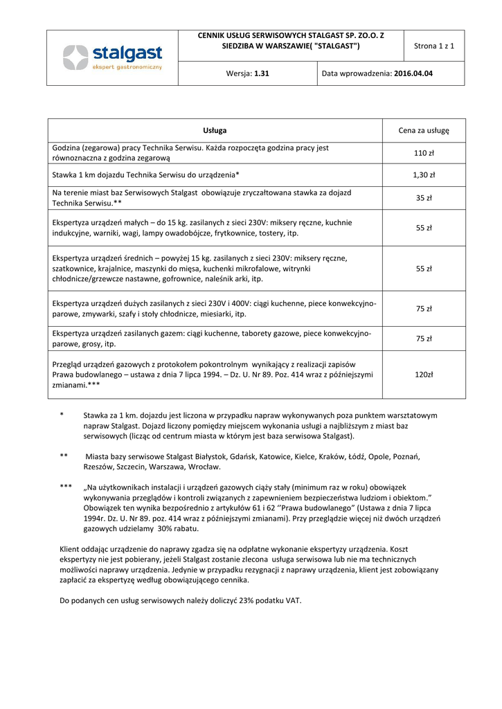 CENNIK USŁUG SERWISOWYCH STALGAST SP. ZO.O. Z SIEDZIBA W WARSZAWIE( "STALGAST") Wersja: 1.31 Strona 1 z 1 Data wprowadzenia: 2016.04.04 Usługa Cena za usługę Godzina (zegarowa) pracy Technika Serwisu. Każda rozpoczęta godzina pracy jest równoznaczna z godzina zegarową 110 zł Stawka 1 km dojazdu Technika Serwisu do urządzenia* 1,30 zł Na terenie miast baz Serwisowych Stalgast obowiązuje zryczałtowana stawka za dojazd Technika Serwisu.** 35 zł Ekspertyza urządzeń małych – do 15 kg. zasilanych z sieci 230V: miksery ręczne, kuchnie indukcyjne, warniki, wagi, lampy owadobójcze, frytkownice, tostery, itp. 55 zł Ekspertyza urządzeń średnich – powyżej 15 kg. zasilanych z sieci 230V: miksery ręczne, szatkownice, krajalnice, maszynki do mięsa, kuchenki mikrofalowe, witrynki chłodnicze/grzewcze nastawne, gofrownice, naleśnik arki, itp. 55 zł Ekspertyza urządzeń dużych zasilanych z sieci 230V i 400V: ciągi kuchenne, piece konwekcyjnoparowe, zmywarki, szafy i stoły chłodnicze, miesiarki, itp. 75 zł Ekspertyza urządzeń zasilanych gazem: ciągi kuchenne, taborety gazowe, piece konwekcyjnoparowe, grosy, itp. 75 zł Przegląd urządzeń gazowych z protokołem pokontrolnym wynikający z realizacji zapisów Prawa budowlanego – ustawa z dnia 7 lipca 1994. – Dz. U. Nr 89. Poz. 414 wraz z późniejszymi zmianami.*** 120zł * Stawka za 1 km. dojazdu jest liczona w przypadku napraw wykonywanych poza punktem warsztatowym napraw Stalgast. Dojazd liczony pomiędzy miejscem wykonania usługi a najbliższym z miast baz serwisowych (licząc od centrum miasta w którym jest baza serwisowa Stalgast). ** Miasta bazy serwisowe Stalgast Białystok, Gdańsk, Katowice, Kielce, Kraków, Łódź, Opole, Poznań, Rzeszów, Szczecin, Warszawa, Wrocław. *** „Na użytkownikach instalacji i urządzeń gazowych ciąży stały (minimum raz w roku) obowiązek wykonywania przeglądów i kontroli związanych z zapewnieniem bezpieczeństwa ludziom i obiektom.” Obowiązek ten wynika bezpośrednio z artykułów 61 i 62 ‘’Prawa budowlanego” (Ustawa z dnia 7 lipca 1994r. Dz. U. Nr 89. poz. 414 wraz z późniejszymi zmianami). Przy przeglądzie więcej niż dwóch urządzeń gazowych udzielamy 30% rabatu. Klient oddając urządzenie do naprawy zgadza się na odpłatne wykonanie ekspertyzy urządzenia. Koszt ekspertyzy nie jest pobierany, jeżeli Stalgast zostanie zlecona usługa serwisowa lub nie ma technicznych możliwości naprawy urządzenia. Jedynie w przypadku rezygnacji z naprawy urządzenia, klient jest zobowiązany zapłacić za ekspertyzę według obowiązującego cennika. Do podanych cen usług serwisowych należy doliczyć 23% podatku VAT.