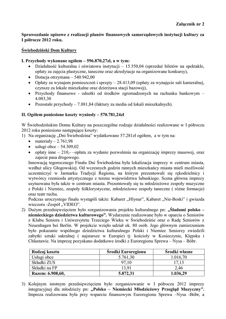 Załącznik nr 2 Sprawozdanie opisowe z realizacji planów finansowych samorządowych instytucji kultury za I półrocze 2012 roku. Świebodziński Dom Kultury I. Przychody wykonane ogółem – 596.870,27zł, a w tym: Działalność kulturalna i oświatowa instytucji – 15.550,04 (sprzedaż biletów na spektakle, opłaty za zajęcia plastyczne, taneczne oraz akredytacje na organizowane konkursy), Dotacja otrzymana – 540.942,00 Opłaty za wynajem pomieszczeń i sprzęty – 28.413,09 (opłaty za wynajęcie sali kameralnej, czynsze za lokale mieszkalne oraz dzierżawa stacji bazowej), Przychody finansowe - odsetki od środków zgromadzonych na rachunku bankowym – 4.083,30 Pozostałe przychody – 7.881,84 (faktury za media od lokali mieszkalnych). II. Ogółem poniesione koszty wyniosły – 570.781,24zł W Świebodzińskim Domu Kultury na poszczególne rodzaje działalności realizowane w I półroczu 2012 roku poniesiono następujące koszty: 1) Na organizację „Dni Świebodzina” wydatkowano 57.281zł ogółem, a w tym na: materiały – 2.761,98 usługi obce – 54.309,02 opłaty inne – 210,- –opłata za wydanie pozwolenia na organizację imprezy masowej, oraz zajecie pasa drogowego. Innowacją tegorocznego Finału Dni Świebodzina była lokalizacja imprezy w centrum miasta, wzdłuż ulicy Głogowskiej. Od wczesnych godzin rannych mieszkańcy miasta mieli możliwość uczestniczyć w Jarmarku Tradycji Regionu, na którym prezentowali się rękodzielnicy i wytwórcy rzemiosła artystycznego z terenu województwa lubuskiego. Scena główna imprezy usytuowana była także w centrum miasta. Prezentowały się tu młodzieżowe zespoły muzyczne z Polski i Niemiec, zespoły folklorystyczne, młodzieżowe zespoły taneczne ( różne formacje) oraz teatr ruchu. Podczas uroczystego finału wystąpili także: Kabaret „Hlynur”, Kabaret „Nie-Boski” i gwiazda wieczoru -Zespół „VIDEO”. 2) Dużym przedsięwzięciem było zorganizowania projektu kulturalnego pn: „Śladami polsko – niemieckiego dziedzictwa kulturowego”. Wydarzenie realizowane było w oparciu o Seniorów z Klubu Seniora i Uniwersytetu Trzeciego Wieku w Świebodzinie oraz o Radę Seniorów z Neuenhagen bei Berlin. W projekcie wzięło udział ok. 80 osób. Jego głównym zamierzeniem było pokazanie wspólnego dziedzictwa kulturalnego Polski i Niemiec Seniorzy zwiedzili zabytki sztuki sakralnej ( najstarsze w Europie) tj: kościoły w Kosieczynie, Klępsku i Chlastawie. Na imprezę pozyskano dodatkowe środki z Euroregionu Sprewa – Nysa – Bóbr. Rodzaj kosztu Usługi obce Składki ZUS Składki na FP Razem: 6.908,60, Środki Euroregionu 5.761,30 97,10 13,91 5.872,31 Środki własne 1.016,70 17,13 2,46 1.036,29 3) Kolejnym istotnym przedsięwzięciem było zorganizowanie w I półroczu 2012 imprezy integracyjnej dla młodzieży pn: „Polsko – Niemiecki Młodzieżowy Przegląd Muzyczny”. Impreza realizowana była przy wsparciu finansowym Euroregionu Sprewa –Nysa -Bóbr, a partnerem Świebodzińskiego Domu Kultury była Gmina Neuenhagen bei Berlin. Punktem kulminacyjnym imprezy były koncerty zespołów młodzieżowych z Polski i Niemiec, które realizowane były na scenie plenerowej w centrum miasta. Projekt spotkał się z dużym zainteresowaniem młodzieży i dorosłych z Polski i Niemiec. Rodzaj kosztu Środki trwałe amortyzowane jednorazowo (potykacze reklamowe) Materiały-puchary, nagrody Energia elektryczna Usługi obce- obsługa logistyczna, wyżywienie dla uczestników, reportaż w TV lokalnej, Składki ZUS Składki na FP Ubezpieczenie imprezy Razem: 49.403,77 Środki Euroregionu Środki własne 1.700,00 300,00 1.733,83 2.513,29 305,97 443,52 34.672,38 6.118,65 235,03 33,68 1.105,- 41,48 5,94 195,- 41.993,21 7.410,56 4) W I półroczu 2012 Świebodziński Dom Kultury wspólnie ze Szkołą Tańca „Tanzensemble” z Neuenhagen bei Berlin zorganizował widowisko artystyczne połączone z koncertem i warsztatami dla młodych tancerzy. Na „Polsko – Niemiecką Galę Taneczną” pozyskano dofinansowanie z Euroregionu „Sprewa – Nysa – Bóbr”. Wydatkowano: Rodzaj kosztu Materiały (stroje, artykuły dekoracyjne) Usługi (przesyłka) Usługi (warsztaty, wyk. koszulek okolicznościowych, plakatów) Razem: 18.941,91 Środki Euroregionu Środki własne 1.960,95 696,21 - 18,- 13.826,73 2.440,02 15.787,68 3.154,23 5) Zorganizowano, także „Lubuską Galę Taneczną i Teatralną Pro Arte 2012”, na której zaprezentowało się ponad 1000 wykonawców – młodych tancerzy i aktorów z terenu województwa lubuskiego. Poniesiono następujące koszty : zakupy materiałów – 1.096,18 wykonanie usług – 4.638,00 Ogółem wydatkowano: 5.734,18 6) Na organizację pozostałych imprez artystycznych poniesiono następujące koszty: materiały – 1.914,15 usługi – 11.912,Razem: 13.826,15 7) Świebodziński Dom Kultury organizuje również działalność amatorskich sekcji zainteresowań dla dzieci, młodzieży i dorosłych, funkcjonujących stale w strukturach jednostki. Są to m.in.: sekcja plastyczna, sekcja filmowa, sekcja wokalna, sekcje taneczne, Klub Szachowy, Klub Seniora, Świebodzińska Orkiestra Dęta, Uniwersytet III Wieku, Klub Turystyczny „Odkrywcy”, Zespół Śpiewaczy „ Calando” ,Kabaret „Bakalaret oraz Klub Krótkofalowców. Ogólnie w sekcjach zainteresowań skupionych jest ponad 1700 członków. Ponadto placówka organizuje wystawy, wernisaże i imprezy artystyczne w Galerii „Inspiracje”. Na działalność tych sekcji oraz organizację wystaw w Galerii w pierwszym półroczu br. poniesiono koszty na: materiały – 4.943,95 usługi obce – 29.132,66 delegacje służbowe – 392,83 Razem: 34.469,44 8) Na organizację IX Międzynarodowego Festiwalu Muzycznego im. M. Agricoli poniesiono koszty w wysokości 574,04zł - (pozostałe środki własne)- z tego : usługi (tłumaczenia wniosków projektowych do Fundacji Współpracy Polsko – Niemieckie oraz Euroregion
