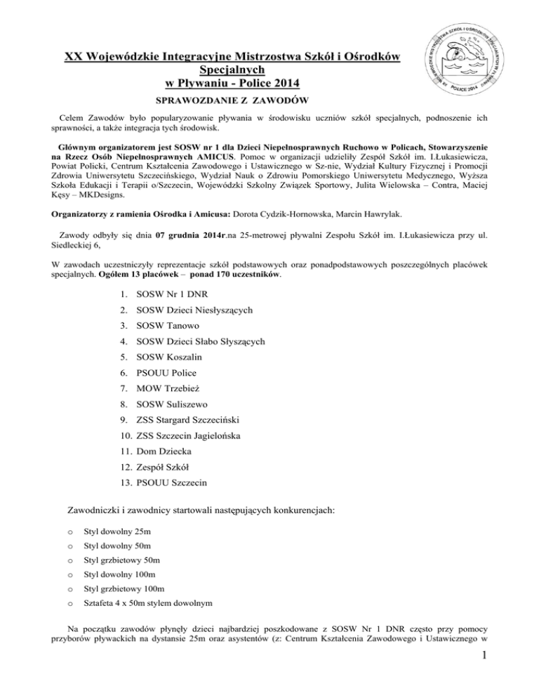 1 XX Wojewódzkie Integracyjne Mistrzostwa Szkół i Ośrodków Specjalnych w Pływaniu - Police 2014 SPRAWOZDANIE Z ZAWODÓW Celem Zawodów było popularyzowanie pływania w środowisku uczniów szkół specjalnych, podnoszenie ich sprawności, a także integracja tych środowisk. Głównym organizatorem jest SOSW nr 1 dla Dzieci Niepełnosprawnych Ruchowo w Policach, Stowarzyszenie na Rzecz Osób Niepełnosprawnych AMICUS. Pomoc w organizacji udzieliły Zespół Szkół im. I.Łukasiewicza, Powiat Policki, Centrum Kształcenia Zawodowego i Ustawicznego w Sz-nie, Wydział Kultury Fizycznej i Promocji Zdrowia Uniwersytetu Szczecińskiego, Wydział Nauk o Zdrowiu Pomorskiego Uniwersytetu Medycznego, Wyższa Szkoła Edukacji i Terapii o/Szczecin, Wojewódzki Szkolny Związek Sportowy, Julita Wielowska – Contra, Maciej Kęsy – MKDesigns. Organizatorzy z ramienia Ośrodka i Amicusa: Dorota Cydzik-Hornowska, Marcin Hawrylak. Zawody odbyły się dnia 07 grudnia 2014r.na 25-metrowej pływalni Zespołu Szkół im. I.Łukasiewicza przy ul. Siedleckiej 6, W zawodach uczestniczyły reprezentacje szkół podstawowych oraz ponadpodstawowych poszczególnych placówek specjalnych. Ogółem 13 placówek – ponad 170 uczestników. 1. SOSW Nr 1 DNR 2. SOSW Dzieci Niesłyszących 3. SOSW Tanowo 4. SOSW Dzieci Słabo Słyszących 5. SOSW Koszalin 6. PSOUU Police 7. MOW Trzebież 8. SOSW Suliszewo 9. ZSS Stargard Szczeciński 10. ZSS Szczecin Jagielońska 11. Dom Dziecka 12. Zespół Szkół 13. PSOUU Szczecin Zawodniczki i zawodnicy startowali następujących konkurencjach: o Styl dowolny 25m o Styl dowolny 50m o Styl grzbietowy 50m o Styl dowolny 100m o Styl grzbietowy 100m o Sztafeta 4 x 50m stylem dowolnym Na początku zawodów płynęły dzieci najbardziej poszkodowane z SOSW Nr 1 DNR często przy pomocy przyborów pływackich na dystansie 25m oraz asystentów (z: Centrum Kształcenia Zawodowego i Ustawicznego w 1 2 Szczecinie-słuchaczy w zawodzie technik masażysta, PUM – kierunek fizjoterapia oraz WSEiT- kierunek fizjoterapia) których umiejętności pływackie nie pozwalają jeszcze na branie udziału w rywalizacji sportowej. Swoje słabości pokonało na zawodach łącznie 74 uczniów Ośrodka Zawody zostały przeprowadzone zgodnie z przepisami PZP seriami na czas. Rolę sędziów mierzących czas na torach pełnili studenci z kierunku wychowanie fizyczne Wydziału Kultury Fizycznej i Promocji Zdrowia Uniwersytetu Szczecińskiego (opiekun prof. Joanna Kruk). Zawody poprowadził Artur Jędruch, który był jednocześnie lekarzem zawodów. Sędzia główny Marcin Hawrylak, Sędzia startowy Piotr Zeissel, Sędzia skrutacyjny – Marek Dybiżbański, Sekretariat zawodów - Monika Musztafaga. Dla zwycięzców wręczono: puchary, medale, nagrody rzeczowe i dyplomy ufundowane przez Powiat Policki, Stowarzyszenie Amicus, SOSW Nr 1 DNR, CONTRA – Julita Wielowska, Maciej Kęsy – MKDesigns. Nagrody wręczali zaproszeni goście, a przybyli: Cezary Arciszewski – Przewodniczący Rady Powiatu Polickiego, Dyrektor SOSW nr 1 DNR Pani Mariola Dudczak wraz z Wicedyrektorami: Danutą Chylewską-Kęsy i Wiesławą Brzyncką, Małgorzata Grędowicz – dyrektor Centrum Kształcenia Zawodowego, . Beata Golisowicz – radna Powiatu Polickiego, Wioletta Janusz – Wyższa Szkoła Edukacji i Terapii, Magdalena Ptak – Pomorski Uniwersytet Medyczny-Wydział Nauk o Zdrowiu, Agata Jarymowicz – kierownik pływalni, Na zakończenie każdy uczestnik zawodów otrzymał od św. Mikołaja (w którego wcielił się słuchacz Centrum Kształcenia Zawodowego i Ustawicznego w Szczecinie) słodki piernik ufundowany przez Powiat Policki oraz okolicznościową koszulkę. Najmłodsi otrzymali dodatkowo paczkę ze słodkościami. Zawody zorganizowali i przeprowadzili pracownicy Kompleksu Rehabilitacyjnego SOSW Nr 1 DNR Czynną pomocą, w przeprowadzeniu zawodów, był udział w charakterze wolontariuszy słuchaczy Centrum Kształcenia Zawodowego i Ustawicznego w Szczecinie w zawodzie technik masażysta pod kierunkiem Marcina Hawrylaka, którzy opiekowali się niepełnosprawnymi zawodnikami, oraz pomagali wkładaniu i wyciąganiu z basenu. Pomoc zapewnili też studenci Pomorskiego Uniwersytetu Medycznego - kierunek Fizjoterapia pod kierunkiem Magdaleny Ptak, Wyższej Szkoły Edukacji i Terapii Wydział Zamiejscowy Szczecin – kierunek Fizjoterapia pod kierunkiem Wioletty Janusz, studenci Wydziału Kultury Fizycznej i Promocji Zdrowia US w Szczecinie pod kierunkiem prof. Joanny Kruk. W sumie zaangażowanych było 60 wolontariuszy. Na tegorocznych zawodach odbyła się po raz pierwszy Sztafeta Wolontariuszy 4x50m, w których wystąpili asystenci z poszczególnych uczelni. Oto wyniki historycznej rywalizacji pomiędzy szkołami wyższymi: I SZTAFETA WOLONTARIUSZY Msc. Szkoła Wyższa 1 2 3 4 2014 Czas Zachodniopomorskie Centrum Kształcenia Zawodowego i Ustawicznego w Szczecinie Wydział Kultury Fizycznej i Promocji Zdrowia Uniwersytetu Szczecińskiego Wydział Nauk o Zdrowiu Pomorskiego Uniwersytetu Medycznego Wyższa Szkoła Edukacji i Terapii o/Szczecin 2:38,34 3:20,37 3:39,99 3:52,60 Dodatkowo na zawodach wyłoniono: Najmłodszy zawodnik – Oliwia Hebel (SOSW Nr 1 DNR) Najmłodsza zawodniczka – Szymon Fedorowski (SOSW Nr 1 DNR) Najlepszy pływak kategoria szkoła podstawowa – Daniel Kowalik (SOSW Dzieci Słabo Słyszących) Najlepszy pływaczka kategoria szkoła podstawowa – Natalia Lisicka (SOSW Nr 1 DNR) Najlepszy pływak kategoria szkoła ponadpodstawowa – Nikola Lisiak (SOSW Nr 1 DNR) Najlepszy pływaczka kategoria szkoła ponadpodstawowa – Kacper Mientki (SOSW Dzieci Słabo Słyszących) 2 3 Msc WYNIKI SZTAFETY Czas 1 SOSW Dzieci Niesłyszących 2:32,40 2 MOW Trzebież 2:42,65 3 SOSW Dzieci Słabosłyszących 3:04,18 4 SOSW nr 1 DNR 3:29,28 WYNIKI KOŃCOWE (1-3 miejsce) KATEGORIA NADZIEJE OLIMPIJSKIE 25m stylem dowolnym mieszana S-1-2 dziewczęta 1 Czarnuch Natalia SOSW nr 1 DNR 1:12,93 1 Sokołowski Dawid SO