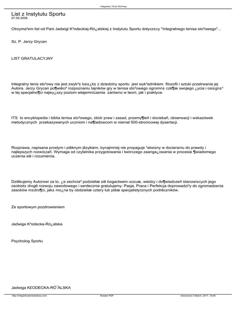 Integralny Tenis Sto³owy List z Instytutu Sportu 07.09.2008. Otrzyma³em list od Pani Jadwigi K³odeckiej-Ró¿alskiej z Instytutu Sportu dotycz±cy "Integralnego tenisa sto³owego"... Sz. P. Jerzy Grycan LIST GRATULACYJNY Integralny tenis sto³owy nie jest zwyk³± ksi±¿k± z dziedziny sportu jest wyk³adnikiem filozofii i sztuki przetrwania jej Autora. Jerzy Grycan po¶wiêci³ rozpoznaniu tajników gry w tenisa sto³owego ogromn± czê¶æ swojego ¿ycia i osi±gn±³ w tej specjalno¶ci najwy¿szy poziom wtajemniczenia zarówno w teorii, jak i praktyce. ITS to encyklopedia i biblia tenisa sto³owego, zbiór praw i zasad, przemy¶leñ i dociekañ, obserwacji i wskazówek metodycznych przekazywanych uczniom i na¶ladowcom w niemal 500-stronicowej dysertacji. Rozprawa, napisana prostym i piêknym jêzykiem, bynajmniej nie propaguje ³atwizny w docieraniu do prawdy i najlepszych rozwi±zañ. Wymaga od czytelnika przygotowania i twórczego zaanga¿owania w procesie ¶wiadomego uczenia siê i rozumienia. Dziêkujemy Autorowi za to, ¿e zechcia³ podzieliæ siê bogactwem uczuæ, wiedzy i do¶wiadczeñ stanowi±cych jego osobist± drogê rozwoju zawodowego i serdecznie gratulujemy: Pasja, Praca i Perfekcja doprowadzi³y do zgromadzenia zasobów m±dro¶ci, jak± mo¿na by obdzieliæ cztery lub piêæ specjalistycznych podrêczników. Ze sportowym pozdrowieniem Jadwiga K³odecka-Ró¿alska Psycholog Sportu Jadwiga K£ODECKA-RÓ¯ALSKA http://integralnytenisstolowy.com Kreator PDF Utworzono 3 March, 2017, 15:09 Integralny Tenis Sto³owy Psycholog sportu, absolwentka AWF Warszawa i Uniwersytetu Poznañskiego, wieloletni kierownik Zak³adu Psychologii Instytutu Sportu w Warszawie, od 30 lat wspó³pracuje w programach przygotowañ polskich Olimpijczyków, wiceprezes ¦wiatowego Towarzystwa Treningu Mentalnego i Doskona³o¶ci (ISMTE), pierwsza kobieta we w³adzach Federacji Europejskiej Psychologii Sportu, autorka kilkudziesiêciu opracowañ po¶wieconych psychologii sukcesu. http://integralnytenisstolowy.com Kreator PDF Utworzono 3 March, 2017, 15:09