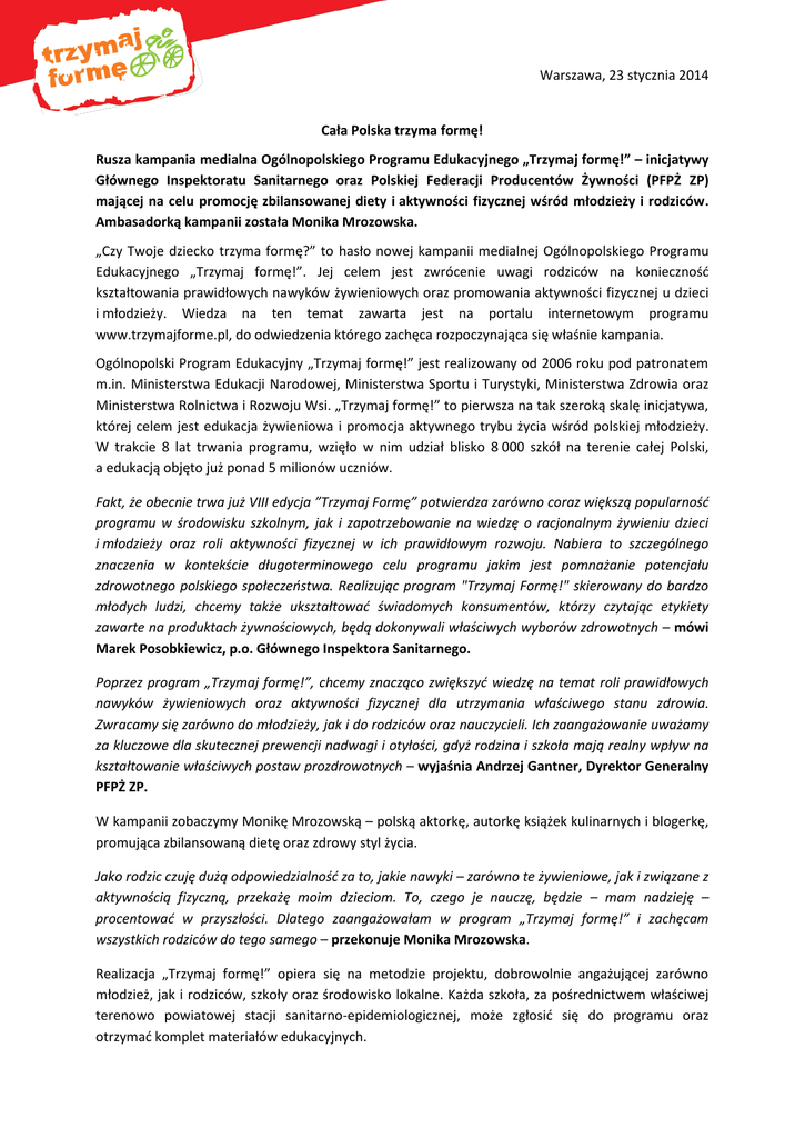 Warszawa, 23 stycznia 2014 Cała Polska trzyma formę! Rusza kampania medialna Ogólnopolskiego Programu Edukacyjnego „Trzymaj formę!” – inicjatywy Głównego Inspektoratu Sanitarnego oraz Polskiej Federacji Producentów Żywności (PFPŻ ZP) mającej na celu promocję zbilansowanej diety i aktywności fizycznej wśród młodzieży i rodziców. Ambasadorką kampanii została Monika Mrozowska. „Czy Twoje dziecko trzyma formę?” to hasło nowej kampanii medialnej Ogólnopolskiego Programu Edukacyjnego „Trzymaj formę!”. Jej celem jest zwrócenie uwagi rodziców na konieczność kształtowania prawidłowych nawyków żywieniowych oraz promowania aktywności fizycznej u dzieci i młodzieży. Wiedza na ten temat zawarta jest na portalu internetowym programu www.trzymajforme.pl, do odwiedzenia którego zachęca rozpoczynająca się właśnie kampania. Ogólnopolski Program Edukacyjny „Trzymaj formę!” jest realizowany od 2006 roku pod patronatem m.in. Ministerstwa Edukacji Narodowej, Ministerstwa Sportu i Turystyki, Ministerstwa Zdrowia oraz Ministerstwa Rolnictwa i Rozwoju Wsi. „Trzymaj formę!” to pierwsza na tak szeroką skalę inicjatywa, której celem jest edukacja żywieniowa i promocja aktywnego trybu życia wśród polskiej młodzieży. W trakcie 8 lat trwania programu, wzięło w nim udział blisko 8 000 szkół na terenie całej Polski, a edukacją objęto już ponad 5 milionów uczniów. Fakt, że obecnie trwa już VIII edycja ”Trzymaj Formę” potwierdza zarówno coraz większą popularność programu w środowisku szkolnym, jak i zapotrzebowanie na wiedzę o racjonalnym żywieniu dzieci i młodzieży oraz roli aktywności fizycznej w ich prawidłowym rozwoju. Nabiera to szczególnego znaczenia w kontekście długoterminowego celu programu jakim jest pomnażanie potencjału zdrowotnego polskiego społeczeństwa. Realizując program "Trzymaj Formę!" skierowany do bardzo młodych ludzi, chcemy także ukształtować świadomych konsumentów, którzy czytając etykiety zawarte na produktach żywnościowych, będą dokonywali właściwych wyborów zdrowotnych – mówi Marek Posobkiewicz, p.o. Głównego Inspektora Sanitarnego. Poprzez program „Trzymaj formę!”, chcemy znacząco zwiększyć wiedzę na temat roli prawidłowych nawyków żywieniowych oraz aktywności fizycznej dla utrzymania właściwego stanu zdrowia. Zwracamy się zarówno do młodzieży, jak i do rodziców oraz nauczycieli. Ich zaangażowanie uważamy za kluczowe dla skutecznej prewencji nadwagi i otyłości, gdyż rodzina i szkoła mają realny wpływ na kształtowanie właściwych postaw prozdrowotnych – wyjaśnia Andrzej Gantner, Dyrektor Generalny PFPŻ ZP. W kampanii zobaczymy Monikę Mrozowską – polską aktorkę, autorkę książek kulinarnych i blogerkę, promująca zbilansowaną dietę oraz zdrowy styl życia. Jako rodzic czuję dużą odpowiedzialność za to, jakie nawyki – zarówno te żywieniowe, jak i związane z aktywnością fizyczną, przekażę moim dzieciom. To, czego je nauczę, będzie – mam nadzieję – procentować w przyszłości. Dlatego zaangażowałam w program „Trzymaj formę!” i zachęcam wszystkich rodziców do tego samego – przekonuje Monika Mrozowska. Realizacja „Trzymaj formę!” opiera się na metodzie projektu, dobrowolnie angażującej zarówno młodzież, jak i rodziców, szkoły oraz środowisko lokalne. Każda szkoła, za pośrednictwem właściwej terenowo powiatowej stacji sanitarno-epidemiologicznej, może zgłosić się do programu oraz otrzymać komplet materiałów edukacyjnych. Kampania medialna potrwa do końca lutego 2014 r. i będzie obecna na nośnikach typu Citylight, zlokalizowanych w Warszawie i innych dużych miastach Polski. Zapraszamy na stronę programu: www.trzymajforme.pl. Dodatkowych informacji udzielają: Andrzej Gantner – Dyrektor Generalny PFPŻ ZP, tel. (22) 830 70 55 Joanna Skowron – Radca Głównego Inspektora Sanitarnego, tel. (22) 536 13 31