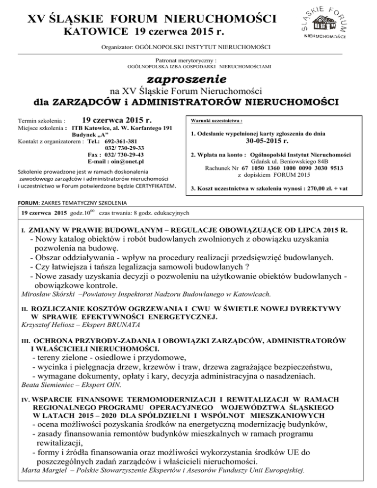 XV ŚLĄSKIE FORUM NIERUCHOMOŚCI KATOWICE 19 czerwca 2015 r. Organizator: OGÓLNOPOLSKI INSTYTUT NIERUCHOMOŚCI Patronat merytoryczny : OGÓLNOPOLSKA IZBA GOSPODARKI NIERUCHOMOŚCIAMI zaproszenie na XV Śląskie Forum Nieruchomości dla ZARZĄDCÓW i ADMINISTRATORÓW NIERUCHOMOŚCI Termin szkolenia : 19 czerwca 2015 r. Miejsce szkolenia : ITB Katowice, al. W. Korfantego 191 Budynek „A” Kontakt z organizatorem : Tel.: 692-361-381 032/ 730-29-33 Fax : 032/ 730-29-43 E-mail : [email protected] Szkolenie prowadzone jest w ramach doskonalenia zawodowego zarządców i administratorów nieruchomości i uczestnictwo w Forum potwierdzone będzie CERTYFIKATEM. Warunki uczestnictwa : 1. Odesłanie wypełnionej karty zgłoszenia do dnia 30-05-2015 r. 2. Wpłata na konto : Ogólnopolski Instytut Nieruchomości Gdańsk ul. Beniowskiego 84B Rachunek Nr 67 1050 1360 1000 0090 3030 9513 z dopiskiem FORUM 2015 3. Koszt uczestnictwa w szkoleniu wynosi : 270,00 zł. + vat FORUM: ZAKRES TEMATYCZNY SZKOLENIA 19 czerwca 2015 godz.1000 czas trwania: 8 godz. edukacyjnych I. ZMIANY W PRAWIE BUDOWLANYM – REGULACJE OBOWIĄZUJĄCE OD LIPCA 2015 R. - Nowy katalog obiektów i robót budowlanych zwolnionych z obowiązku uzyskania pozwolenia na budowę. - Obszar oddziaływania - wpływ na procedury realizacji przedsięwzięć budowlanych. - Czy łatwiejsza i tańsza legalizacja samowoli budowlanych ? - Nowe zasady uzyskania decyzji o pozwoleniu na użytkowanie obiektów budowlanych obowiązkowe kontrole. Mirosław Skórski –Powiatowy Inspektorat Nadzoru Budowlanego w Katowicach. ROZLICZANIE KOSZTÓW OGRZEWANIA I CWU W ŚWIETLE NOWEJ DYREKTYWY W SPRAWIE EFEKTYWNOŚCI ENERGETYCZNEJ. Krzysztof Heliosz – Ekspert BRUNATA II. III. OCHRONA PRZYRODY-ZADANIA I OBOWIĄZKI ZARZĄDCÓW, ADMINISTRATORÓW I WŁAŚCICIELI NIERUCHOMOŚCI. - tereny zielone - osiedlowe i przydomowe, - wycinka i pielęgnacja drzew, krzewów i traw, drzewa zagrażające bezpieczeństwu, - wymagane dokumenty, opłaty i kary, decyzja administracyjna o nasadzeniach. Beata Siemieniec – Ekspert OIN. IV. WSPARCIE FINANSOWE TERMOMODERNIZACJI I REWITALIZACJI W RAMACH REGIONALNEGO PROGRAMU OPERACYJNEGO WOJEWÓDZTWA ŚLĄSKIEGO W LATACH 2015 – 2020 DLA SPÓŁDZIELNI I WSPÓLNOT MIESZKANIOWYCH - ocena możliwości pozyskania środków na energetyczną modernizację budynków, - zasady finansowania remontów budynków mieszkalnych w ramach programu rewitalizacji, - formy i źródła finansowania oraz możliwości wykorzystania środków UE do poszczególnych zadań zarządców i właścicieli nieruchomości. Marta Margiel – Polskie Stowarzyszenie Ekspertów i Asesorów Funduszy Unii Europejskiej.