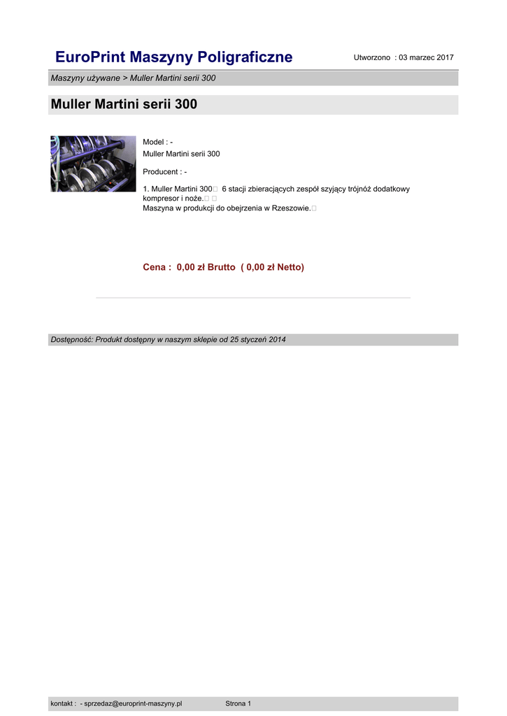 EuroPrint Maszyny Poligraficzne Utworzono : 03 marzec 2017 Maszyny używane > Muller Martini serii 300 Muller Martini serii 300 Model : Muller Martini serii 300 Producent : 1. Muller Martini 300� 6 stacji zbieracjących zespół szyjący trójnóż dodatkowy kompresor i noże.�� Maszyna w produkcji do obejrzenia w Rzeszowie.� Cena : 0,00 zł Brutto ( 0,00 zł Netto) Dostępność: Produkt dostępny w naszym sklepie od 25 styczeń 2014 kontakt : - [email protected] Strona 1