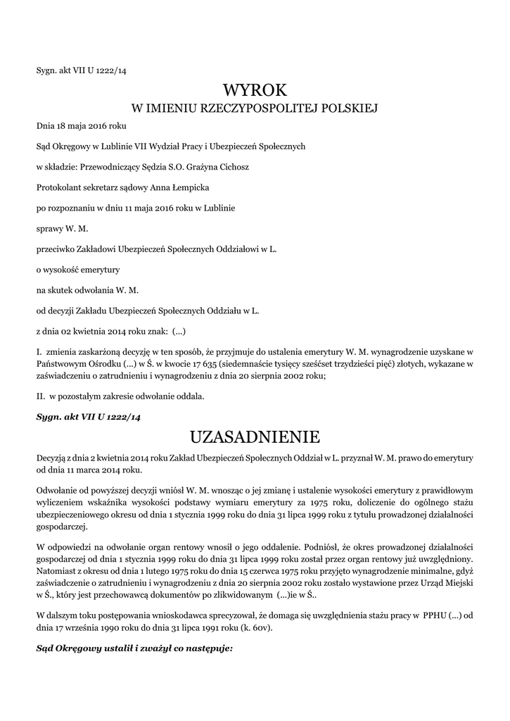 Sygn. akt VII U 1222/14 WYROK W IMIENIU RZECZYPOSPOLITEJ POLSKIEJ Dnia 18 maja 2016 roku Sąd Okręgowy w Lublinie VII Wydział Pracy i Ubezpieczeń Społecznych w składzie: Przewodniczący Sędzia S.O. Grażyna Cichosz Protokolant sekretarz sądowy Anna Łempicka po rozpoznaniu w dniu 11 maja 2016 roku w Lublinie sprawy W. M. przeciwko Zakładowi Ubezpieczeń Społecznych Oddziałowi w L. o wysokość emerytury na skutek odwołania W. M. od decyzji Zakładu Ubezpieczeń Społecznych Oddziału w L. z dnia 02 kwietnia 2014 roku znak: (...) I. zmienia zaskarżoną decyzję w ten sposób, że przyjmuje do ustalenia emerytury W. M. wynagrodzenie uzyskane w Państwowym Ośrodku (...) w Ś. w kwocie 17 635 (siedemnaście tysięcy sześćset trzydzieści pięć) złotych, wykazane w zaświadczeniu o zatrudnieniu i wynagrodzeniu z dnia 20 sierpnia 2002 roku; II. w pozostałym zakresie odwołanie oddala. Sygn. akt VII U 1222/14 UZASADNIENIE Decyzją z dnia 2 kwietnia 2014 roku Zakład Ubezpieczeń Społecznych Oddział w L. przyznał W. M. prawo do emerytury od dnia 11 marca 2014 roku. Odwołanie od powyższej decyzji wniósł W. M. wnosząc o jej zmianę i ustalenie wysokości emerytury z prawidłowym wyliczeniem wskaźnika wysokości podstawy wymiaru emerytury za 1975 roku, doliczenie do ogólnego stażu ubezpieczeniowego okresu od dnia 1 stycznia 1999 roku do dnia 31 lipca 1999 roku z tytułu prowadzonej działalności gospodarczej. W odpowiedzi na odwołanie organ rentowy wnosił o jego oddalenie. Podniósł, że okres prowadzonej działalności gospodarczej od dnia 1 stycznia 1999 roku do dnia 31 lipca 1999 roku został przez organ rentowy już uwzględniony. Natomiast z okresu od dnia 1 lutego 1975 roku do dnia 15 czerwca 1975 roku przyjęto wynagrodzenie minimalne, gdyż zaświadczenie o zatrudnieniu i wynagrodzeniu z dnia 20 sierpnia 2002 roku zostało wystawione przez Urząd Miejski w Ś., który jest przechowawcą dokumentów po zlikwidowanym (...)ie w Ś.. W dalszym toku postępowania wnioskodawca sprecyzował, że domaga się uwzględnienia stażu pracy w PPHU (...) od dnia 17 września 1990 roku do dnia 31 lipca 1991 roku (k. 60v). Sąd Okręgowy ustalił i zważył co następuje: W. M. urodzony (...) w dniu (...) roku złożył wniosek o emeryturę. Zaskarżoną decyzją z dnia 2 kwietnia 2014 roku organ rentowy przyznał wnioskodawcy prawo do emerytury wraz z osiągnięciem wieku powszechnego. Do ustalenia wysokości emerytury wnioskodawcy organ rentowy przyjął następujące okresy składkowe: od dnia 15 kwietnia 1972 roku do dnia 15 czerwca 1975 roku, od dnia 16 czerwca 1975 roku do dnia 19 lutego 1976 roku, od dnia 1 kwietnia 1976 roku do dnia 30 czerwca 1978 roku, od dnia 25 września 1980 roku do dnia 30 listopada 1980 roku, od dnia 20 lutego 1981 roku do dnia 27 czerwca 1981 roku, od dnia 1 sierpnia 1981 roku do dnia 15 maja 1983 roku, od 16 maja 1983 roku do dnia 28 lutego 1985 roku, od dnia 10 września 1985 rou do dnia 7 lutego 1986 roku, od dnia 22 maja 1986 roku do dnia 30 września 1987 roku, od dnia 18 listopada 1987 roku do dnia 31 grudnia 1989 roku, od dnia 17 września 1990 roku do dnia 31 grudnia 1990 roku, od dnia 1 sierpnia 1991 roku do dnia 28 lutego 1993 roku, od dnia 24 maja 1993 roku do dnia 30 czerwca 1993 roku, od dnia 1 sierpnia 1993 roku do dnia 29 sierpnia 1997 roku, od dnia 1 września 1997 roku do dnia 28 września 1997 roku od dnia 1 stycznia 1999 roku do dnia 11 kwietnia 1999 roku, od dnia 19 maja 1999 roku do dnia 31 lipca 1999 roku, od dnia 29 lipca 2004 roku do dnia 30 lipca 2004 roku, od dnia 1 października 2004 roku do dnia 29 stycznia 2005 roku, od dnia 10 września 2008 roku do dnia 31 grudnia 2008 roku oraz okres uzupełniający pracy w gospodarstwie rolnym od dnia 12 listopada 1964 roku do dnia 30 września 1967 roku (k. 18). Okres zasiłku chorobowego od dnia 12 kwietnia 1999 roku do dnia 18 maja 1999 roku nie został uwzględniony, gdyż zasiłek był nienależny i wnioskodawca nie podlegał dobrowolnemu ubezpieczeniu chorobowemu. Okres pobierania renty nie został natomiast uwzględniony jako okres uzupełniający, gdyż wnioskodawca udowodnił już okres wystarczający do nabycia prawa do emerytury (k. 39). Z tytułu zatrudnienia w Państwowym Ośrodku (...) w Ś. w okresie od dnia 1 lutego 1975 roku do dnia 15 czerwca 1975 roku W. M. osiągnął wynagrodzenie w kwocie 17 635 zł (Rp-7 k. 25 akt ZUS dot. renty, legitymacja ubezpieczeniowa – k. 32 akt ZUS dot. renty, zeznania K. S. – k. 47v-48). Powyższy stan faktyczny Sąd ustalił w oparciu o powołane dowody z dokumentów zgromadzonych w aktach ubezpieczeniowych wnioskodawcy. W odniesieniu do zaświadczenia RP-7 z dnia 20 sierpnia 2002 roku (k. 25 akt ZUS) potwierdzającego otrzymane wynagrodzenie w Państwowym Ośrodku (...) w Ś. w okresie od dnia 1 lutego 1975 roku do dnia 15 czerwca 1975 roku należy wskazać, że wskazana w nim kwota wynagrodzenia 17 635 zł w pełni znajduje potwierdzenie w kartotekach wynagrodzeń znajdujących się w aktach osobowych wnioskodawcy. Zatem dokument ten w całości zasługiwał na obdarzenie wiarą. Zeznania wnioskodawcy w zakresie w jakim twierdził, że w firmie (...) pracował po 31 grudnia 1990 roku nie znalazły potwierdzenia w zgromadzonym materiale dowodowym. W aktach sprawy znajduje się jedynie umowa o pracę. Brak jest świadectwa pracy czy też oświadczenia o rozwiązaniu umowy o pracę, którejkolwiek ze stron stosunku pracy. Świadek K. S. także nie był w stanie wskazać konkretnych dat, w których wnioskodawca świadczył pracę na rzecz tej firmy. Z legitymacji ubezpieczeniowej wynika natomiast, że ostatniego wpisu dokonano w dniu 30 grudnia 1990 roku. Twierdzenia wnioskodawcy, że pracował tam do dnia 31 lipca 1991 roku okazały się zatem gołosłowne, gdyż nie potwierdzone innymi dowodami. Brak było w tej sytuacji podstaw do obdarzenia ich wiarą w tej części. Odwołanie W. M. częściowo podlega uwzględnieniu. Z